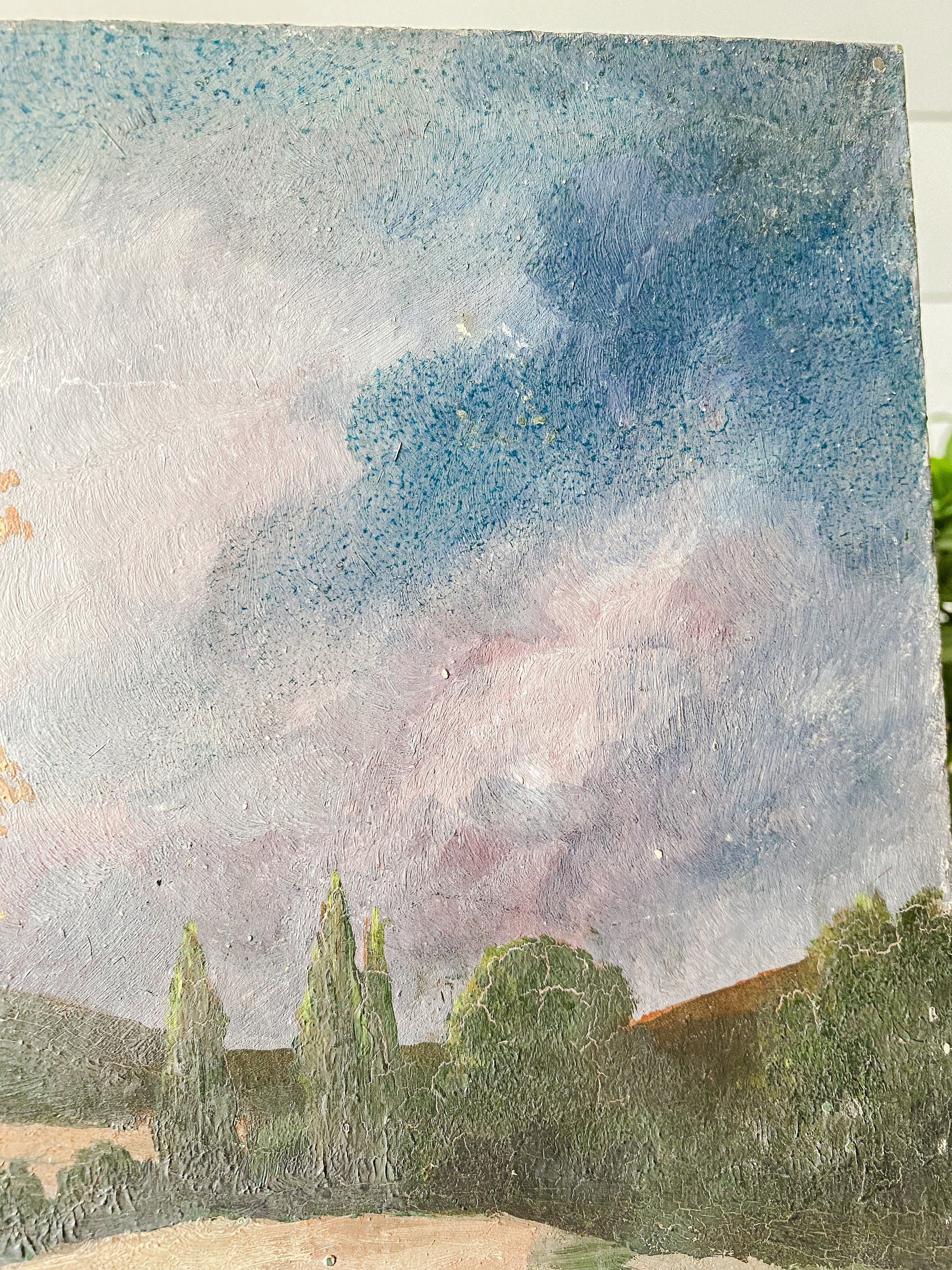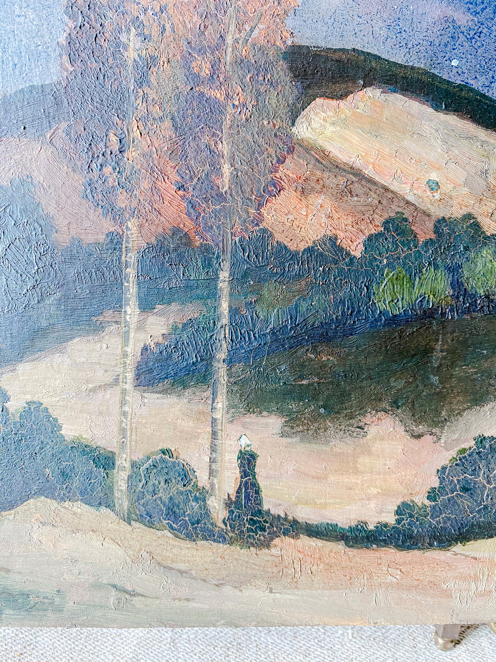 The painting is unframed and could easily be displayed tabletop or framed for wall hanging. Overall good condition with minimal bumps to corners.