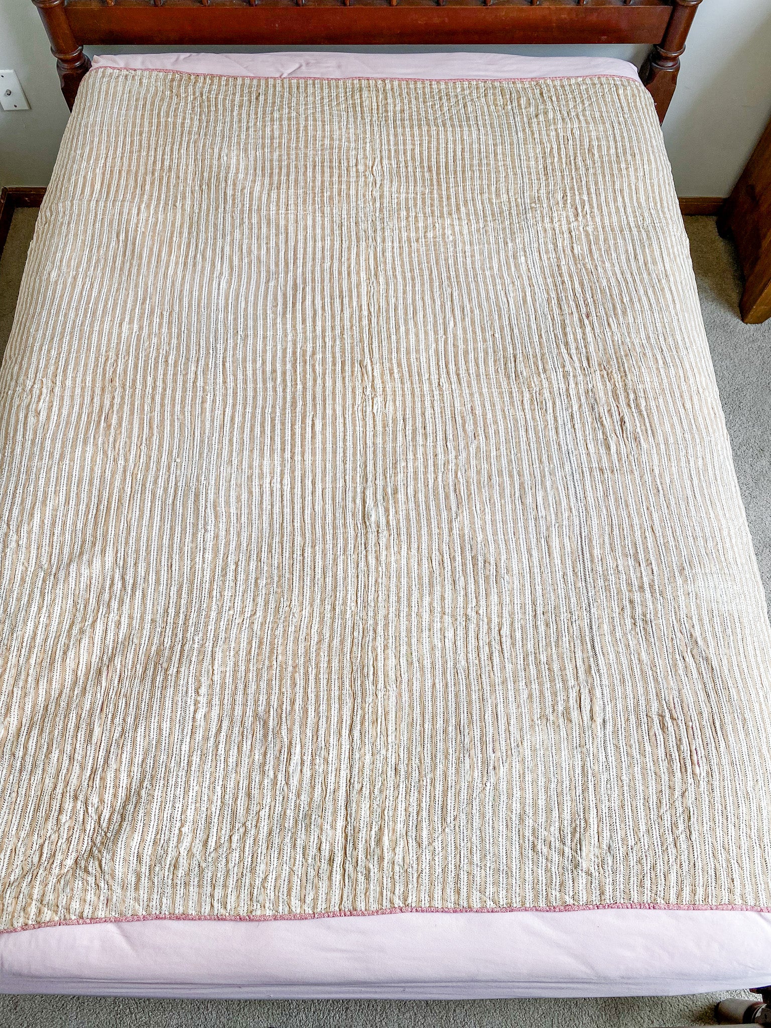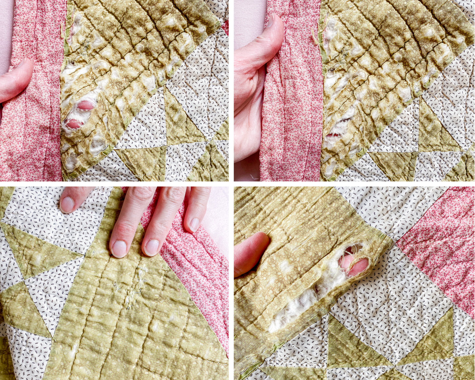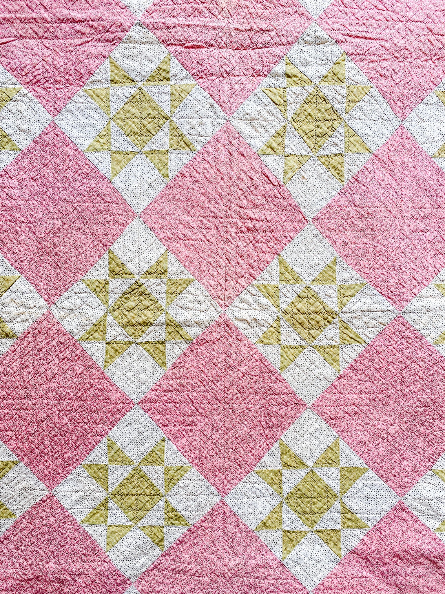 Available is an antique pink and green quilt, with a fair bit of wear that still displays well.