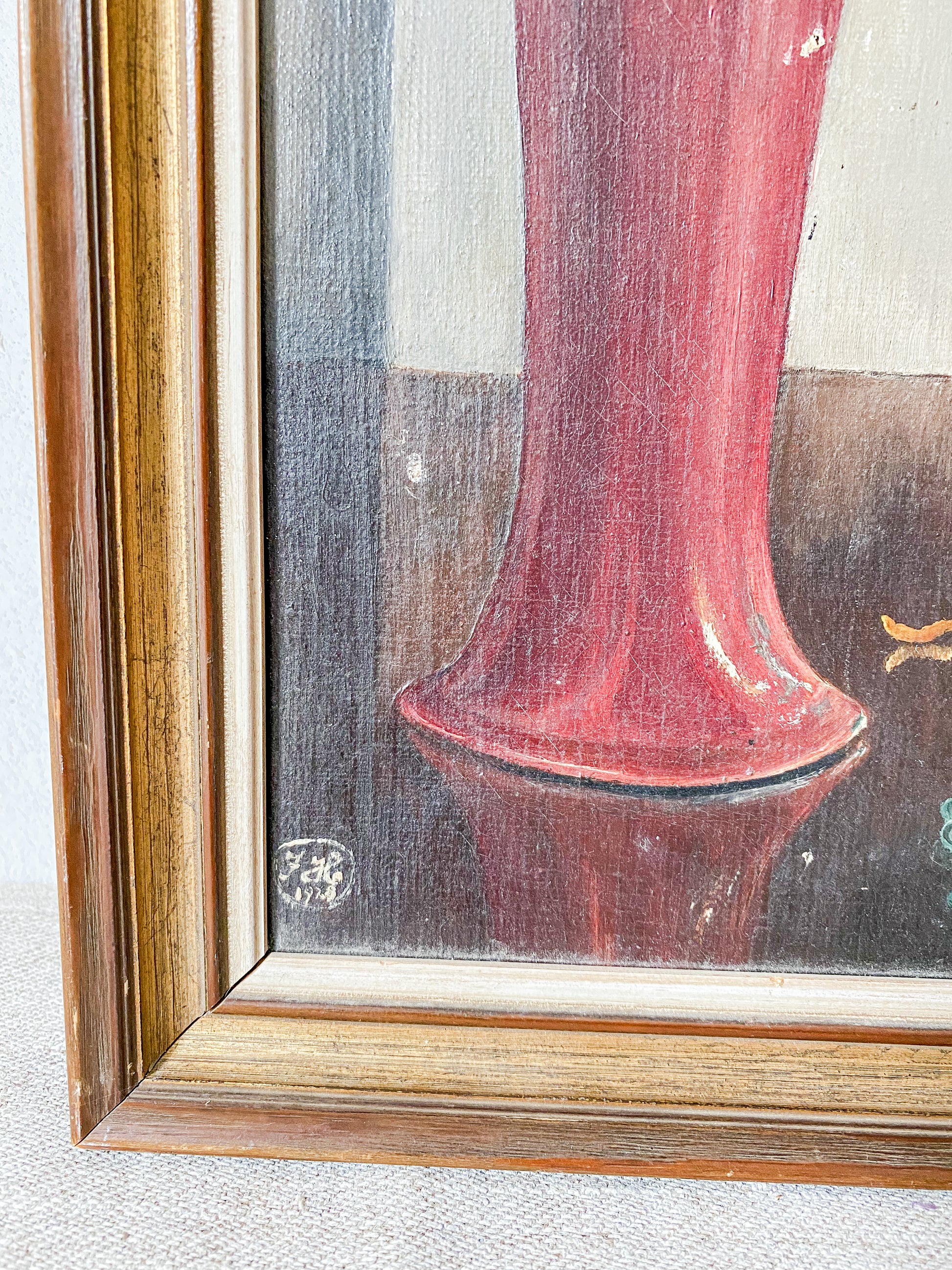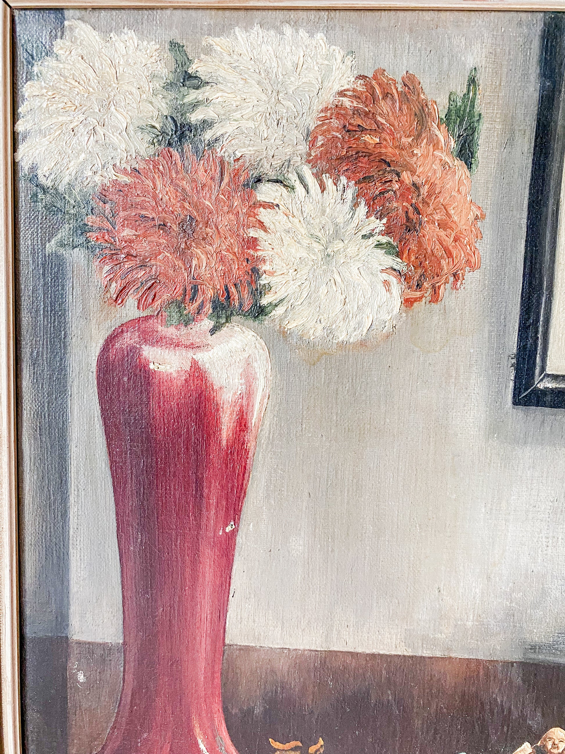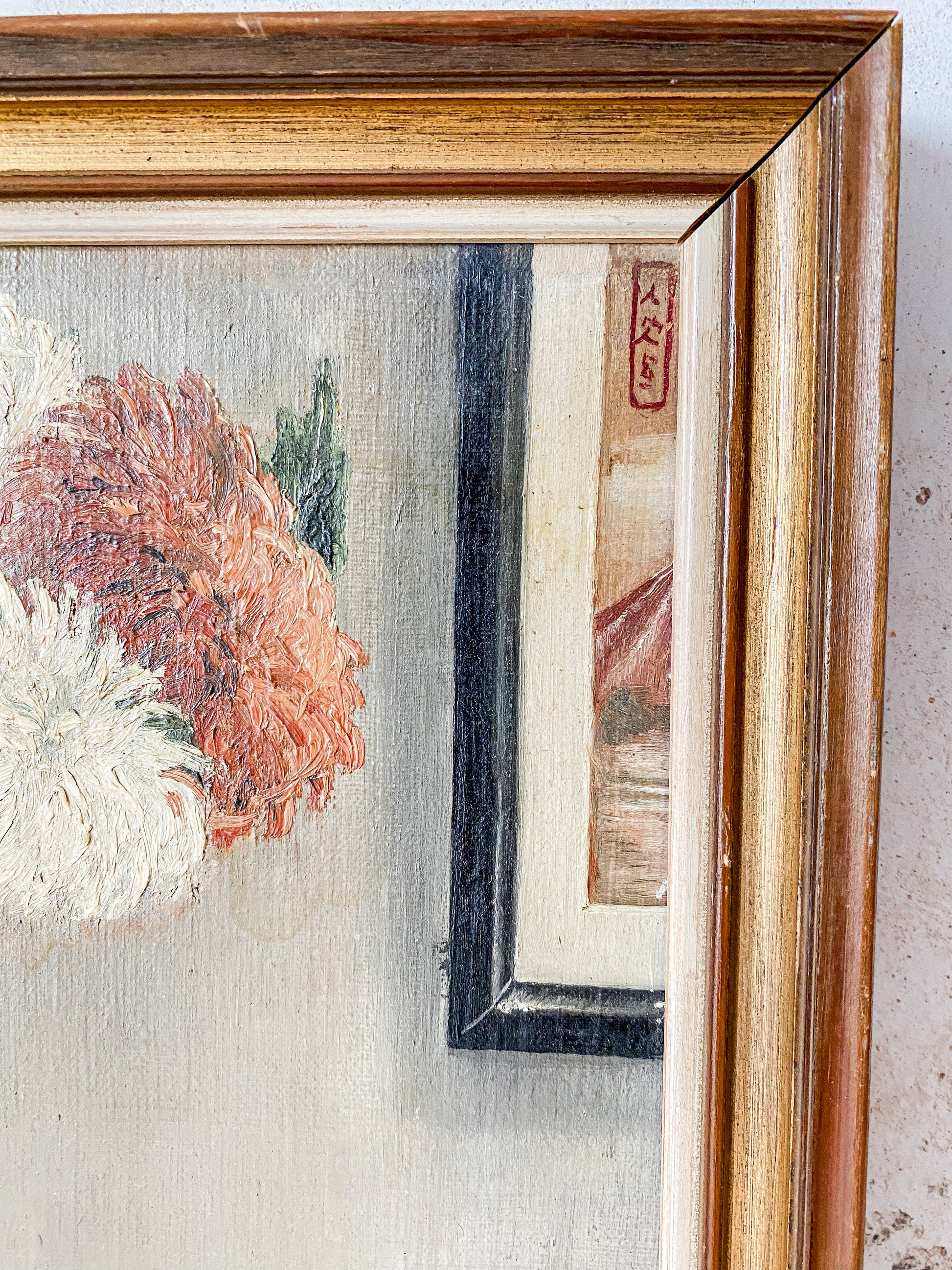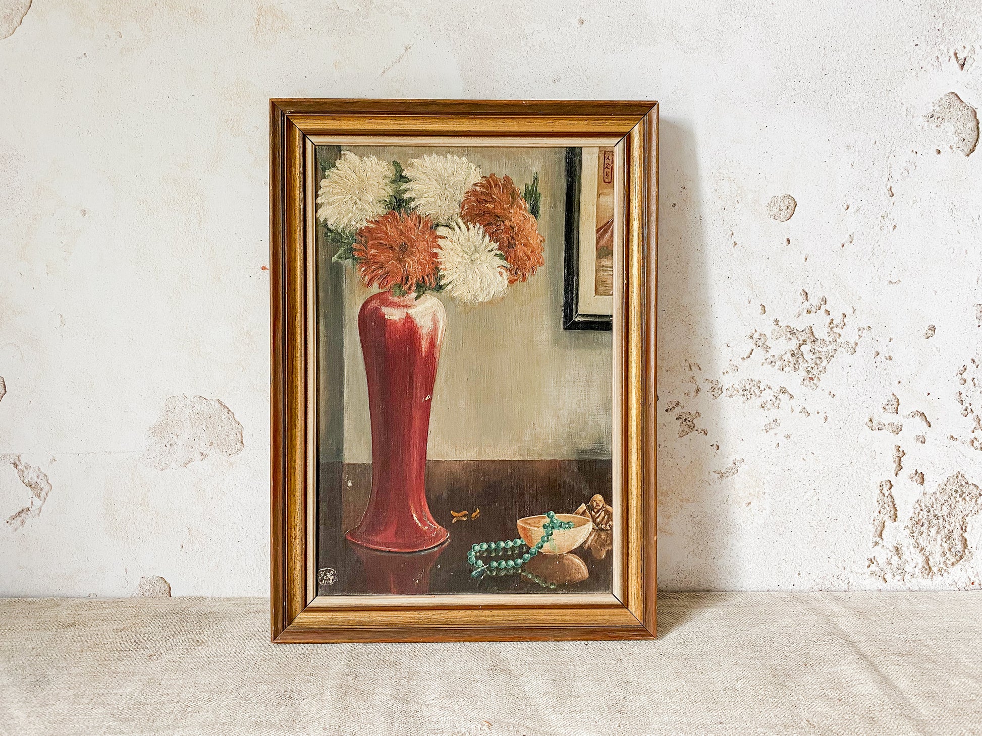 Available is a vintage framed still life, signed and dated by the artist. The oil painting on canvas shows an arrangement of white and pink chrysanthemums in a magenta vase, with jewelry and trinkets on the table and a backdrop of an Asiatic painting on the wall.