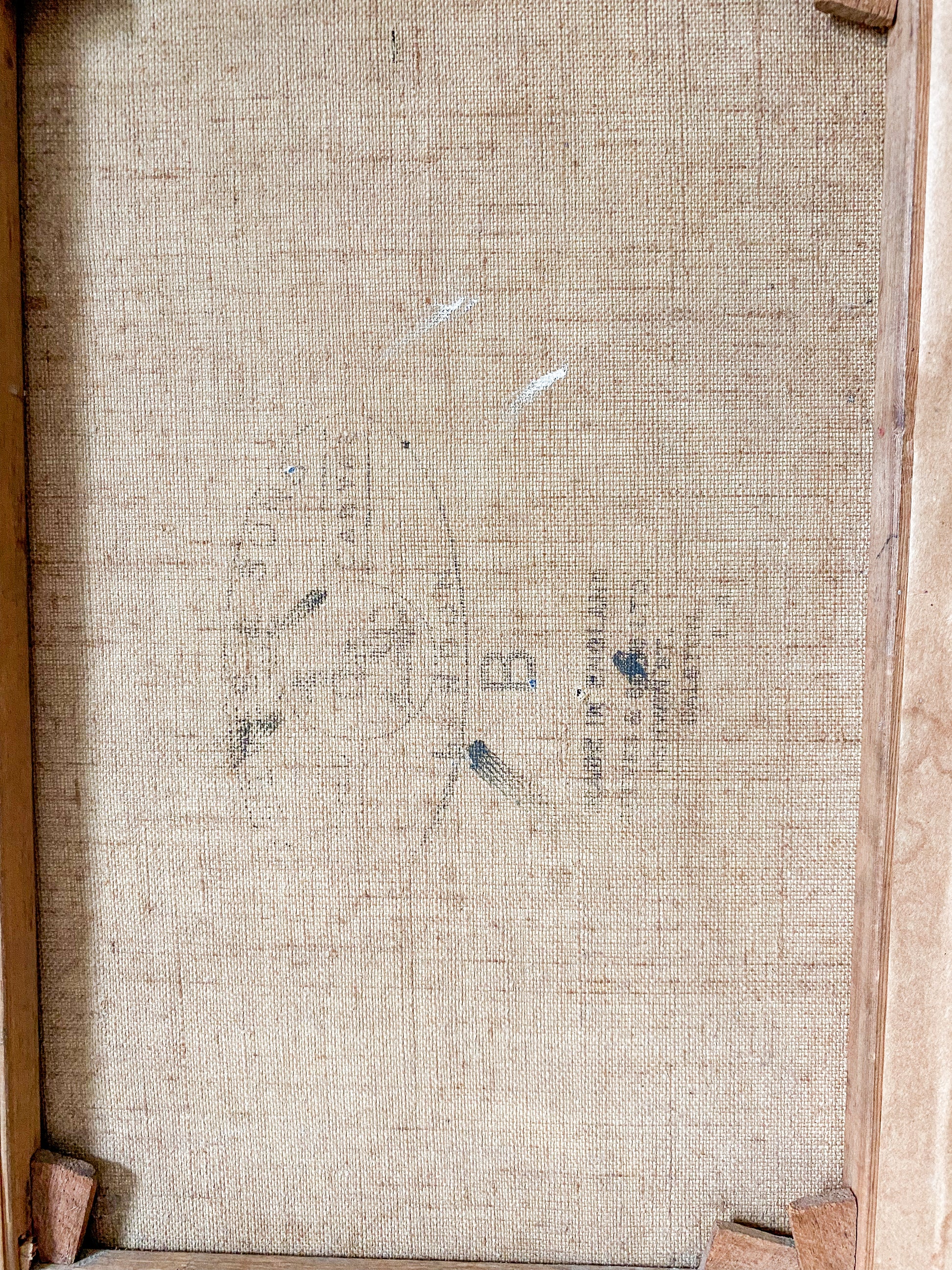 Framed in gilt wood with thin linen liner. Hanging wire attached the back.
