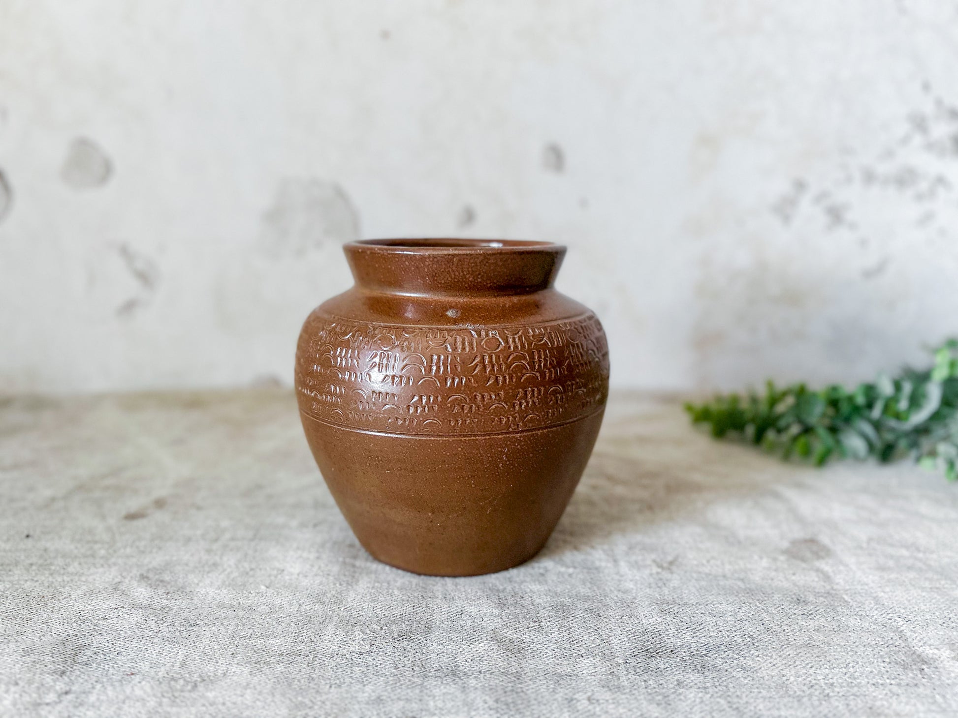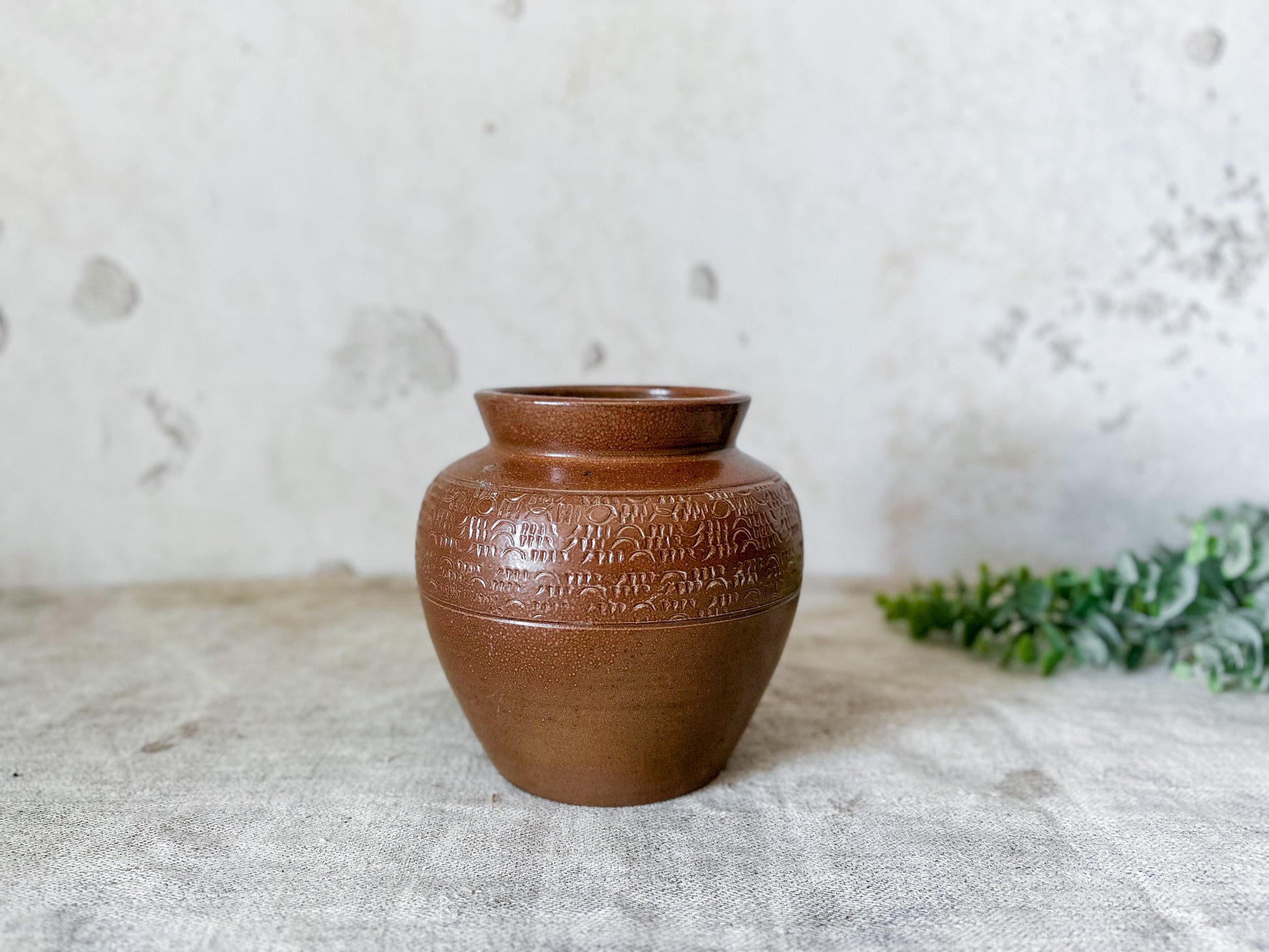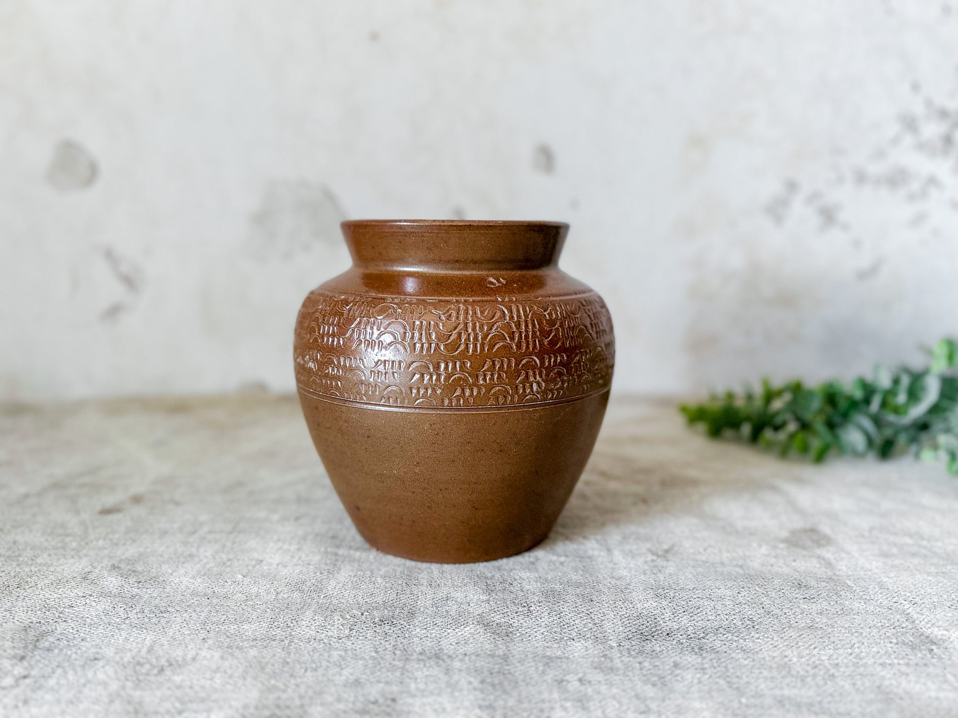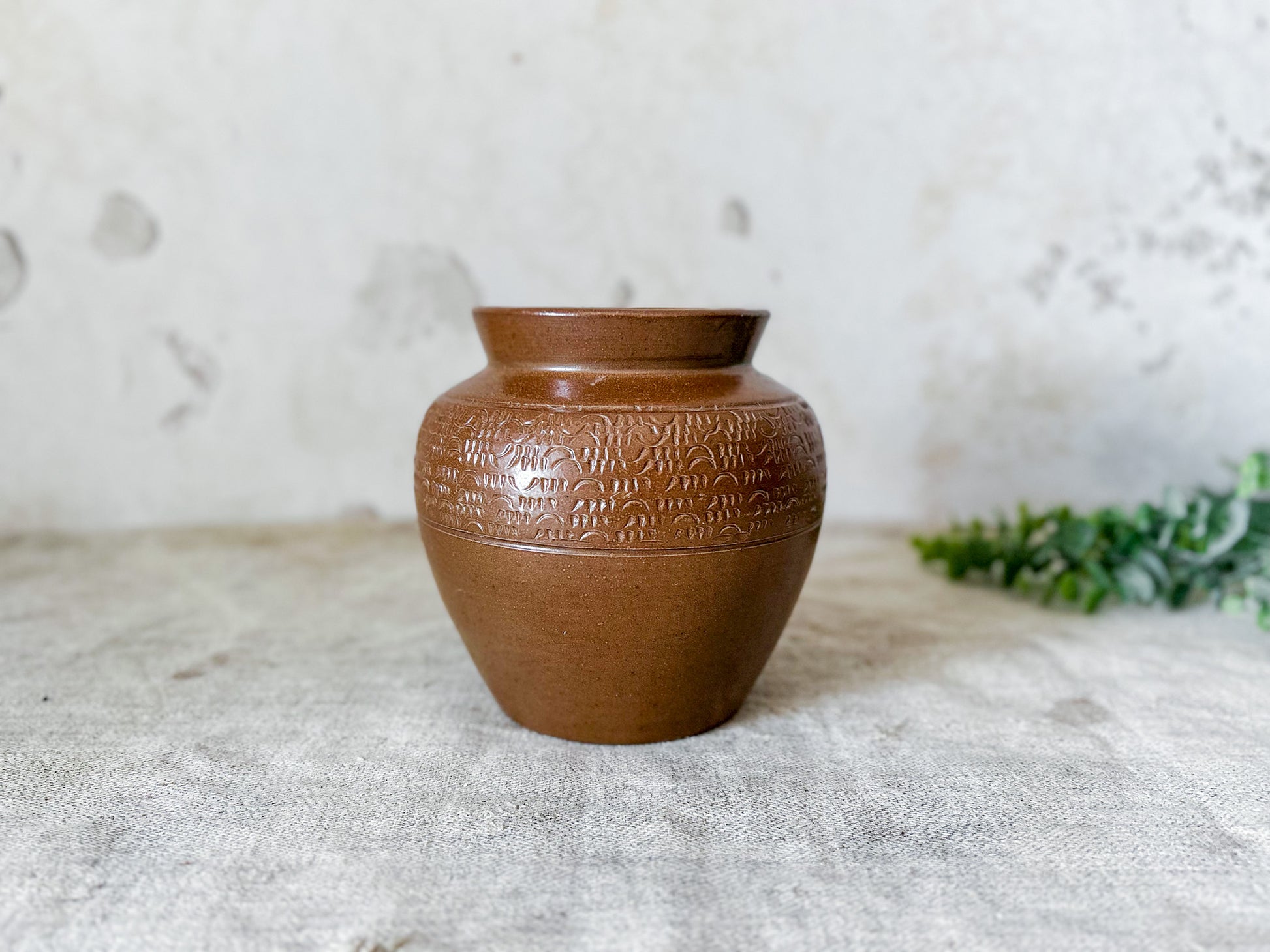 Available is a large antique English storage jar with incised detail around the top half of the body. The bell shaped body has an angled opening, where a lid would have originally been placed. The glaze is a milk chocolate brown with semi-matte finish.