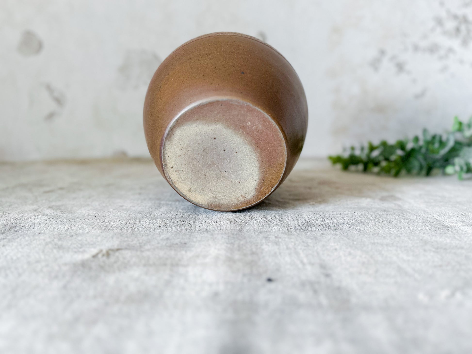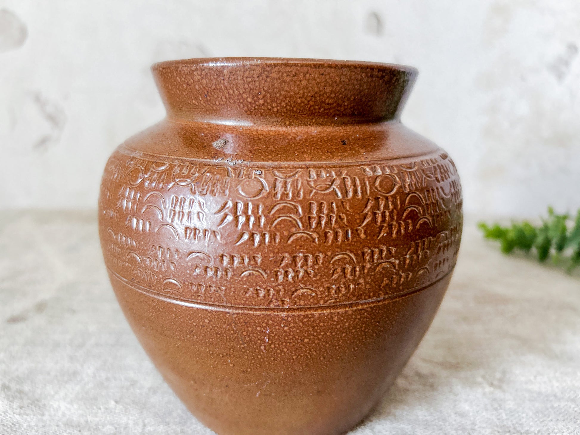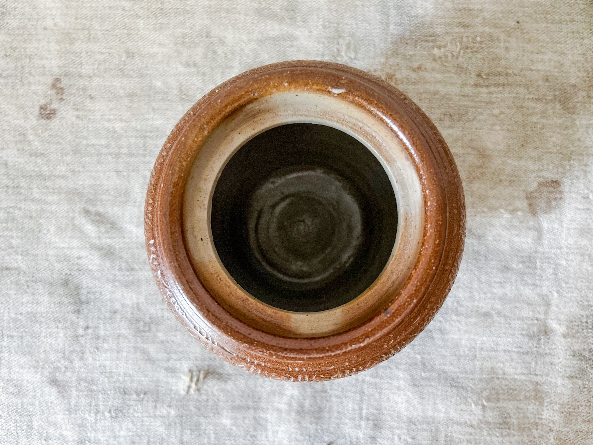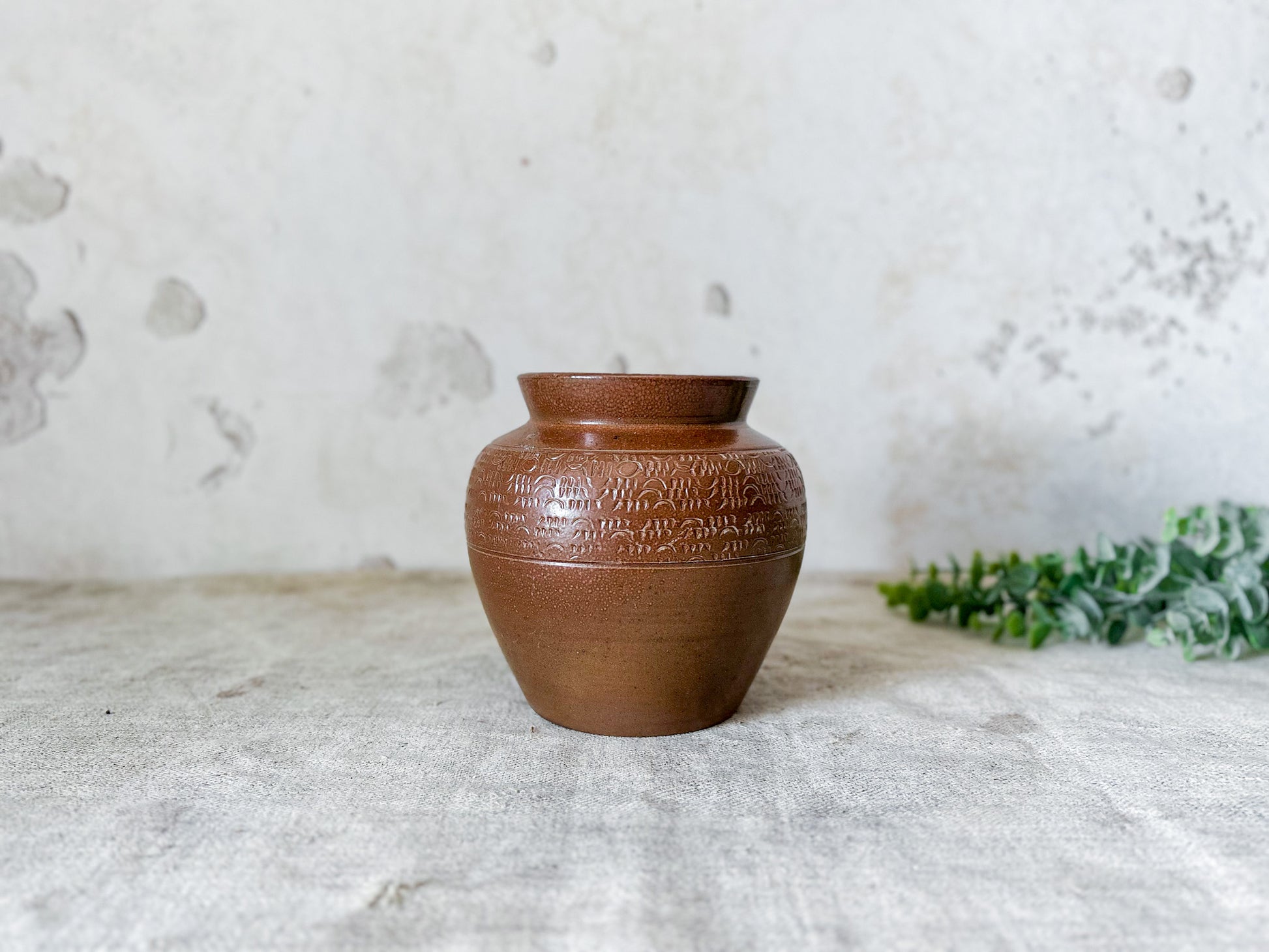 Available is a large antique English storage jar with incised detail around the top half of the body. The bell shaped body has an angled opening, where a lid would have originally been placed. The glaze is a milk chocolate brown with semi-matte finish.