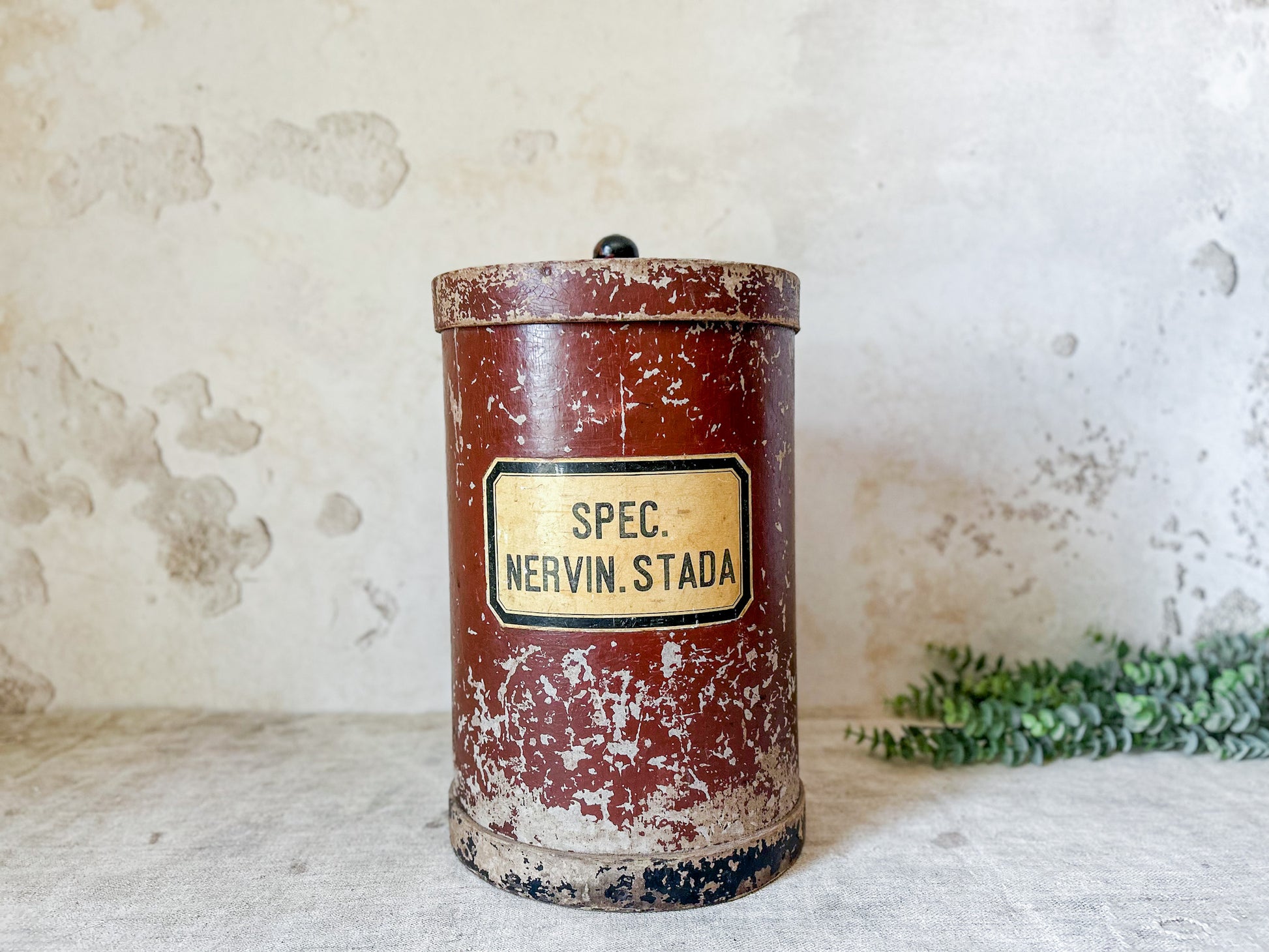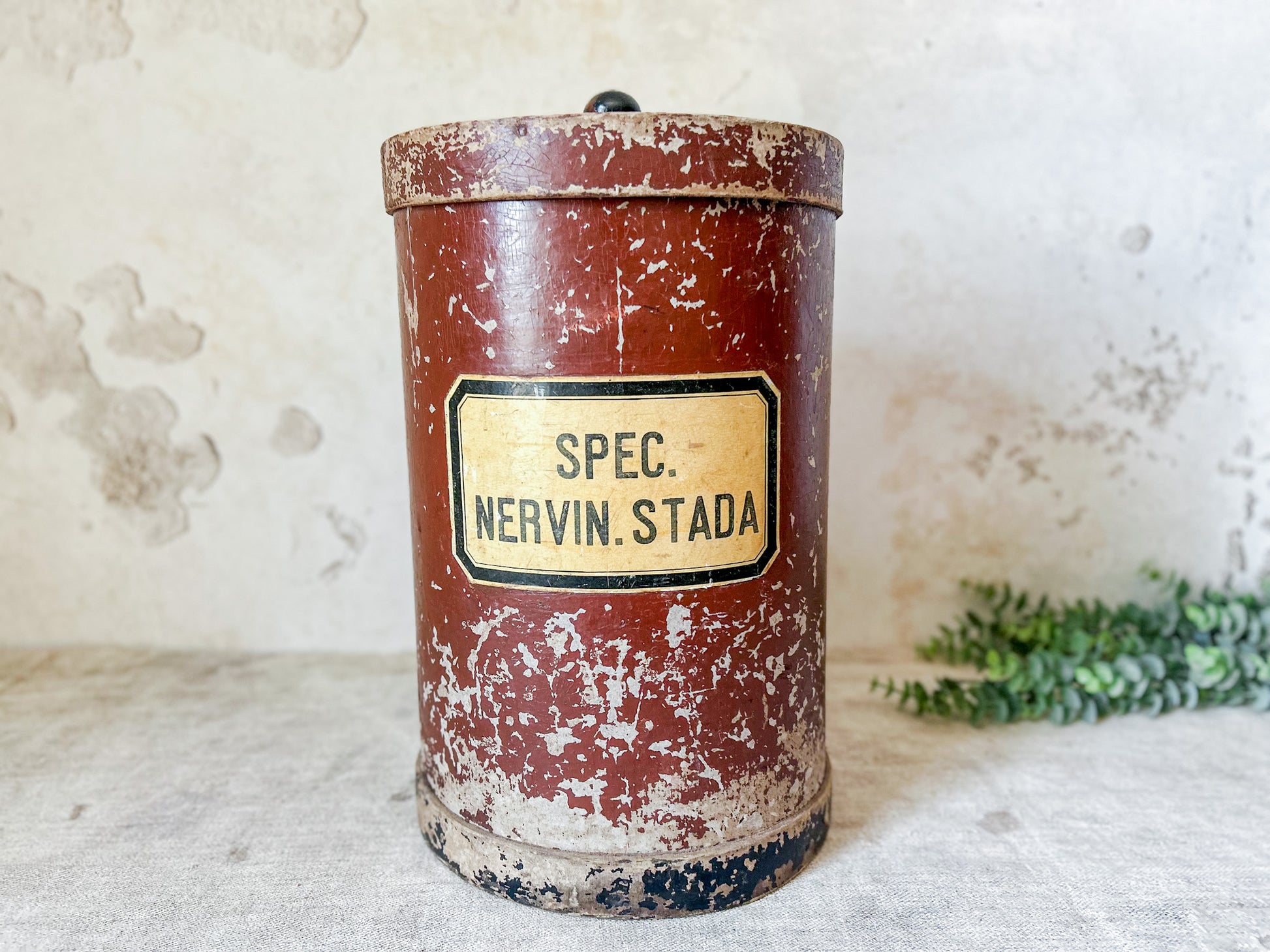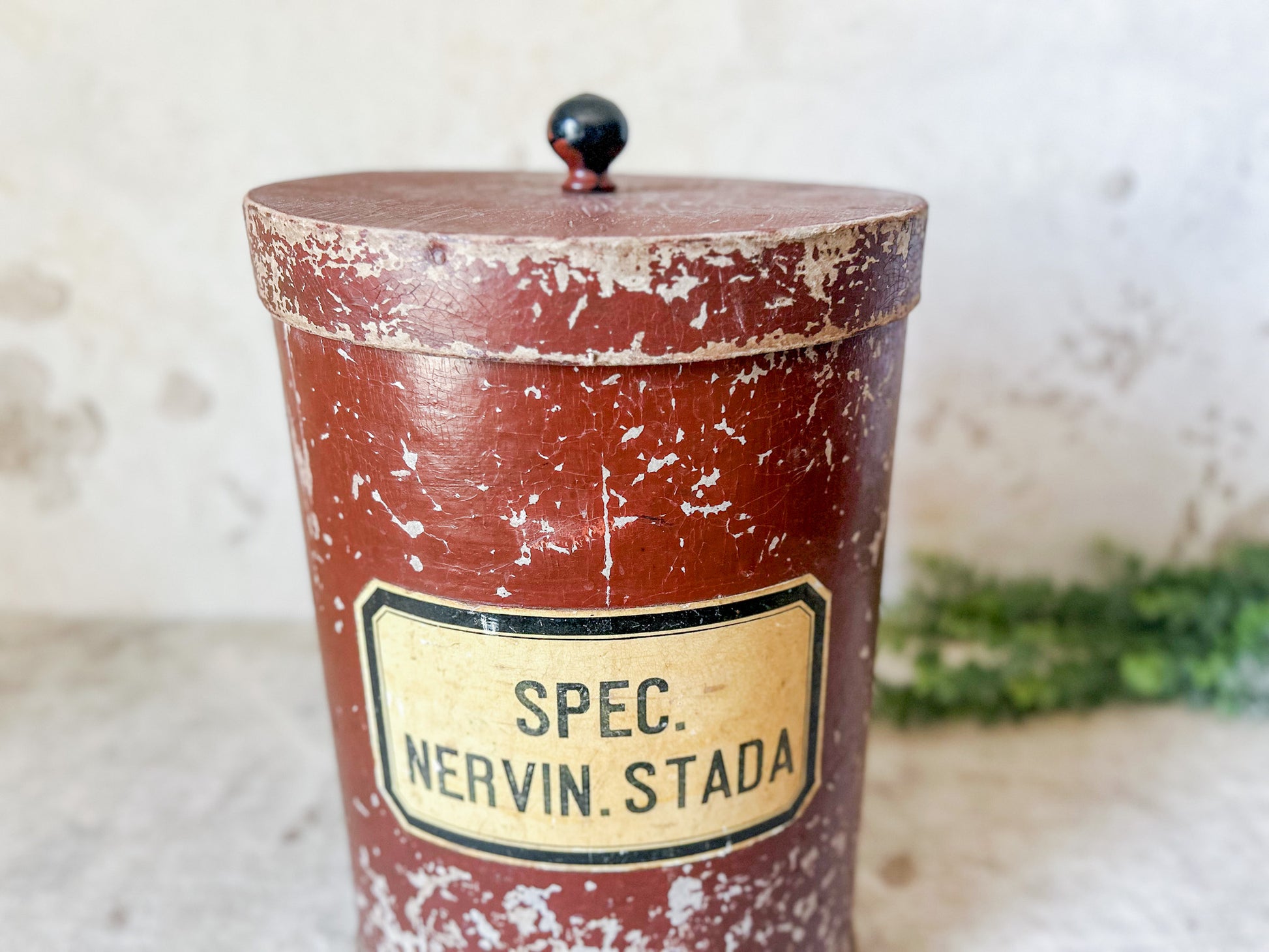 A weathered and worn original antique wood and paperboard apothecary canister. This large display piece has red painted sides with a yellow label that reads "Spec Nervin. Stada." Paint is worn throughout. Paperboard lid and sides with wooden base.