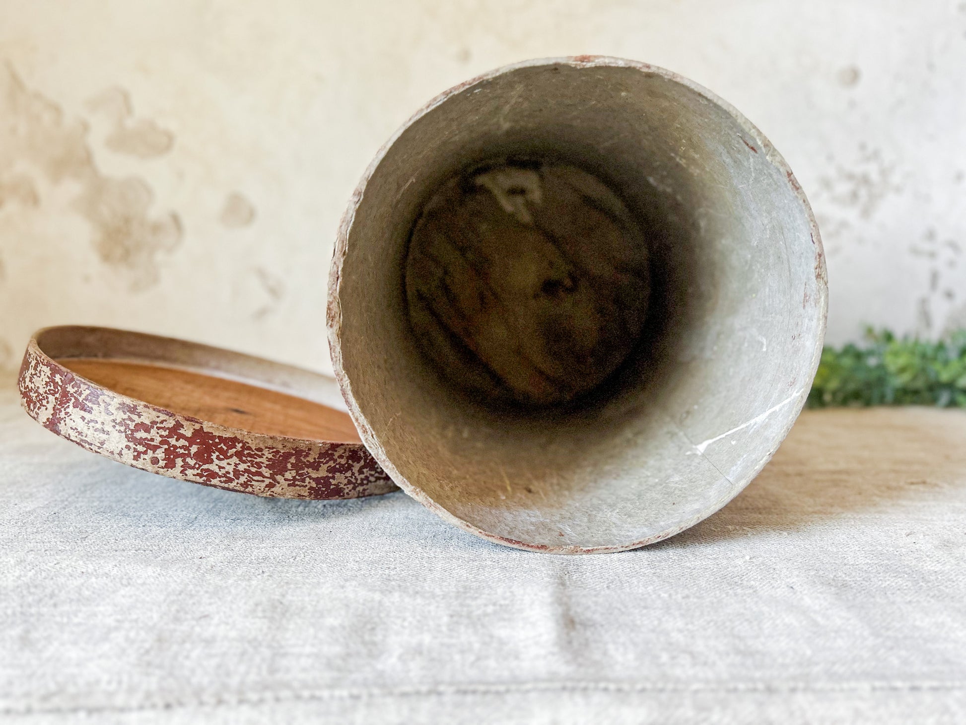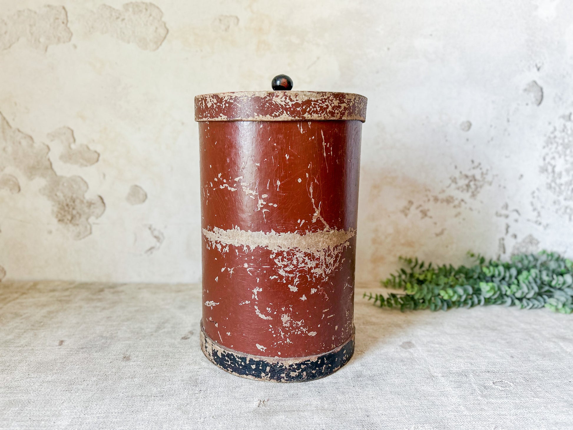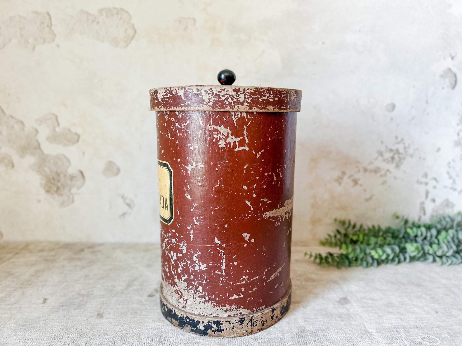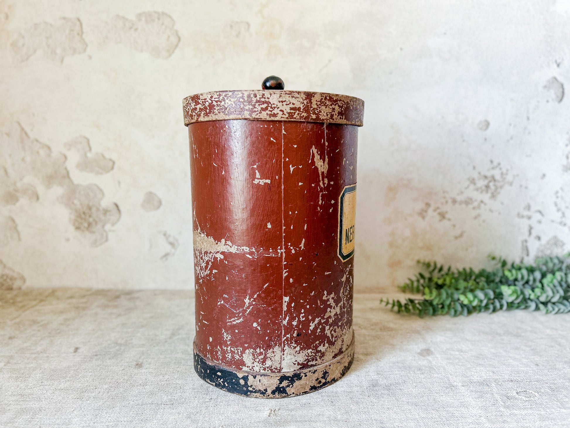 A weathered and worn original antique wood and paperboard apothecary canister. This large display piece has red painted sides with a yellow label that reads "Spec Nervin. Stada." Paint is worn throughout. Paperboard lid and sides with wooden base.