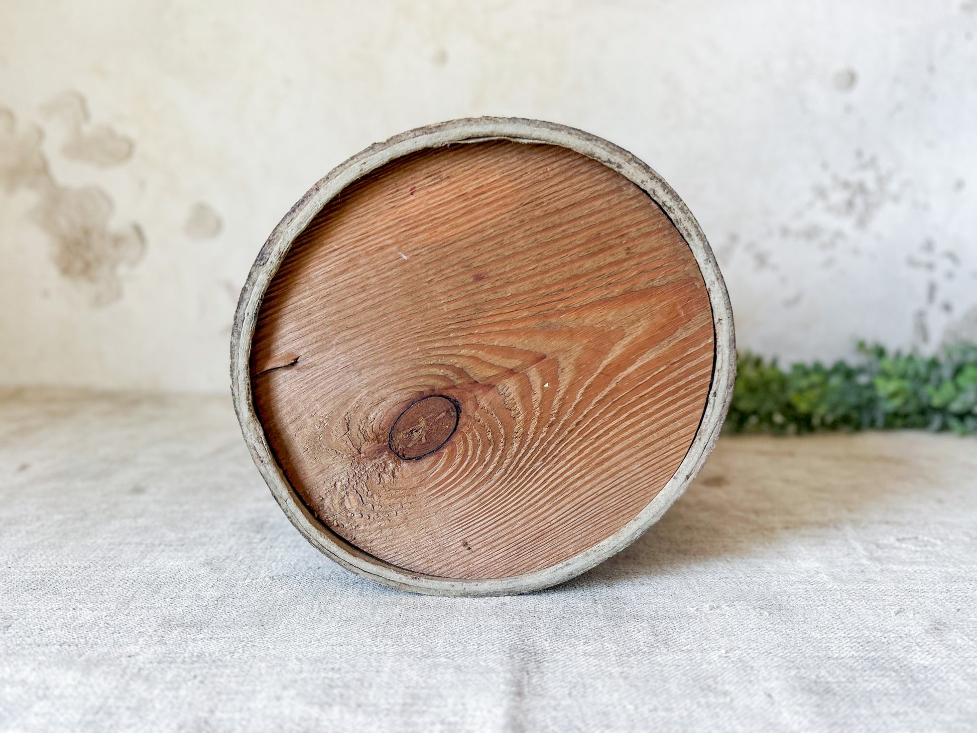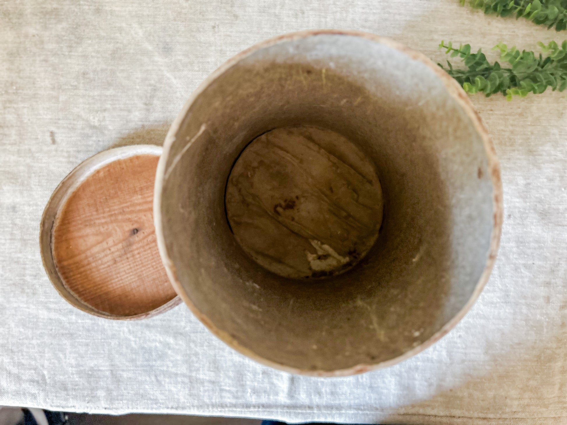 Lid has a round knob. Interior has some evidence of prior water damage, with rippling to the interior.