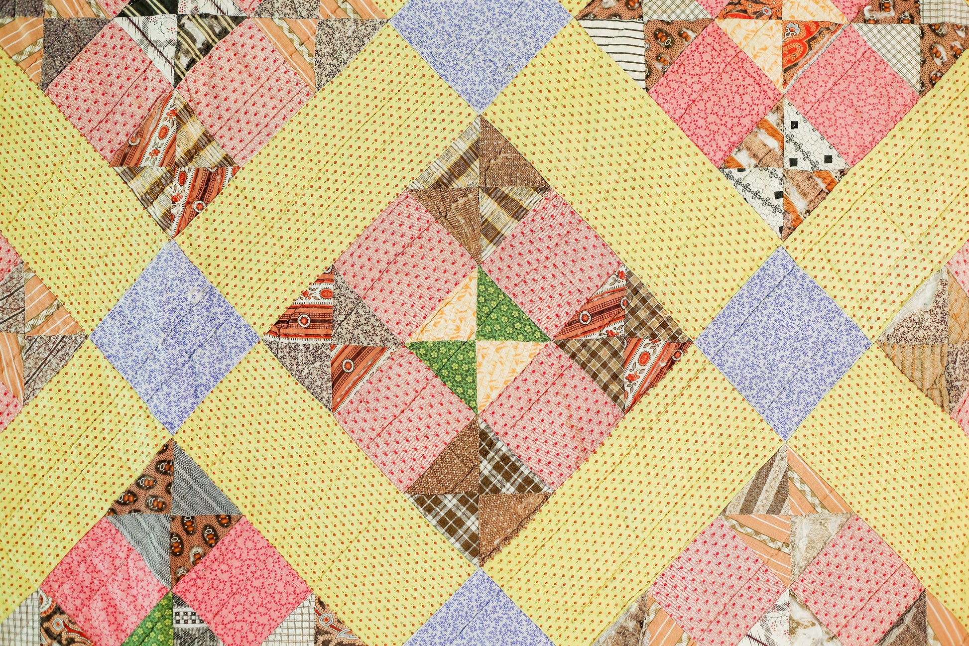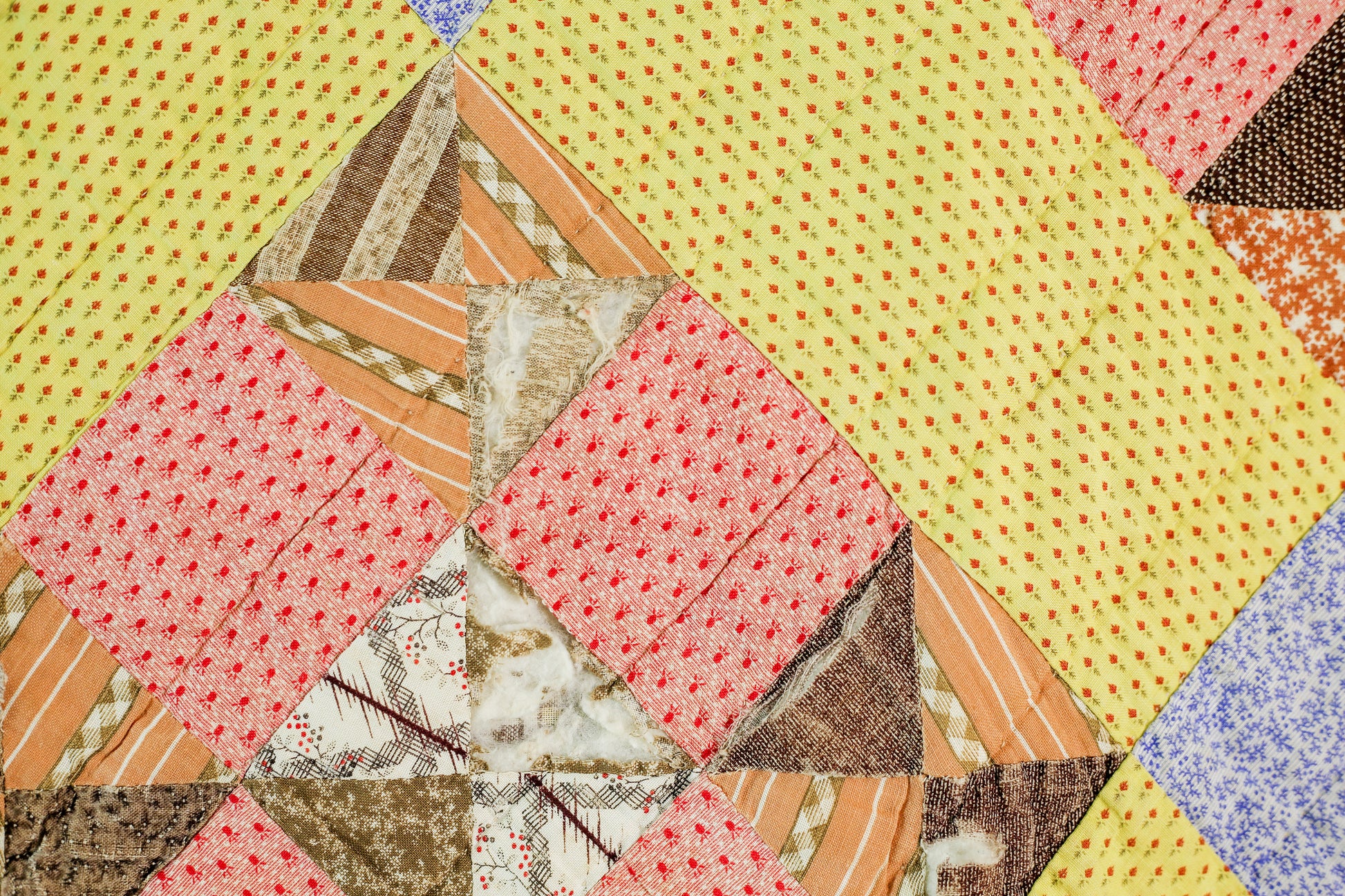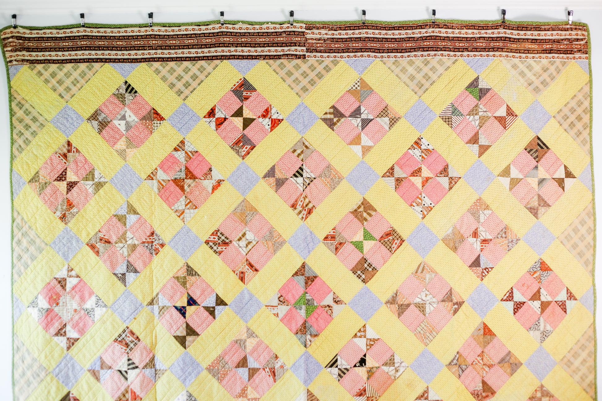 The quilt is constructed of broken dish nine patch blocks set on point. The nine patch blocks are composed of dissected triangles. The sashing is a strong chrome yellow print, with setting blocks of Lancaster blue prints. Top and bottom borders have mid-19th century madder brown prints. Backing is homespun brown gingham. Binding is overdye green print. Lightweight cotton batting. Hand quilted in parallel lines in white thread.