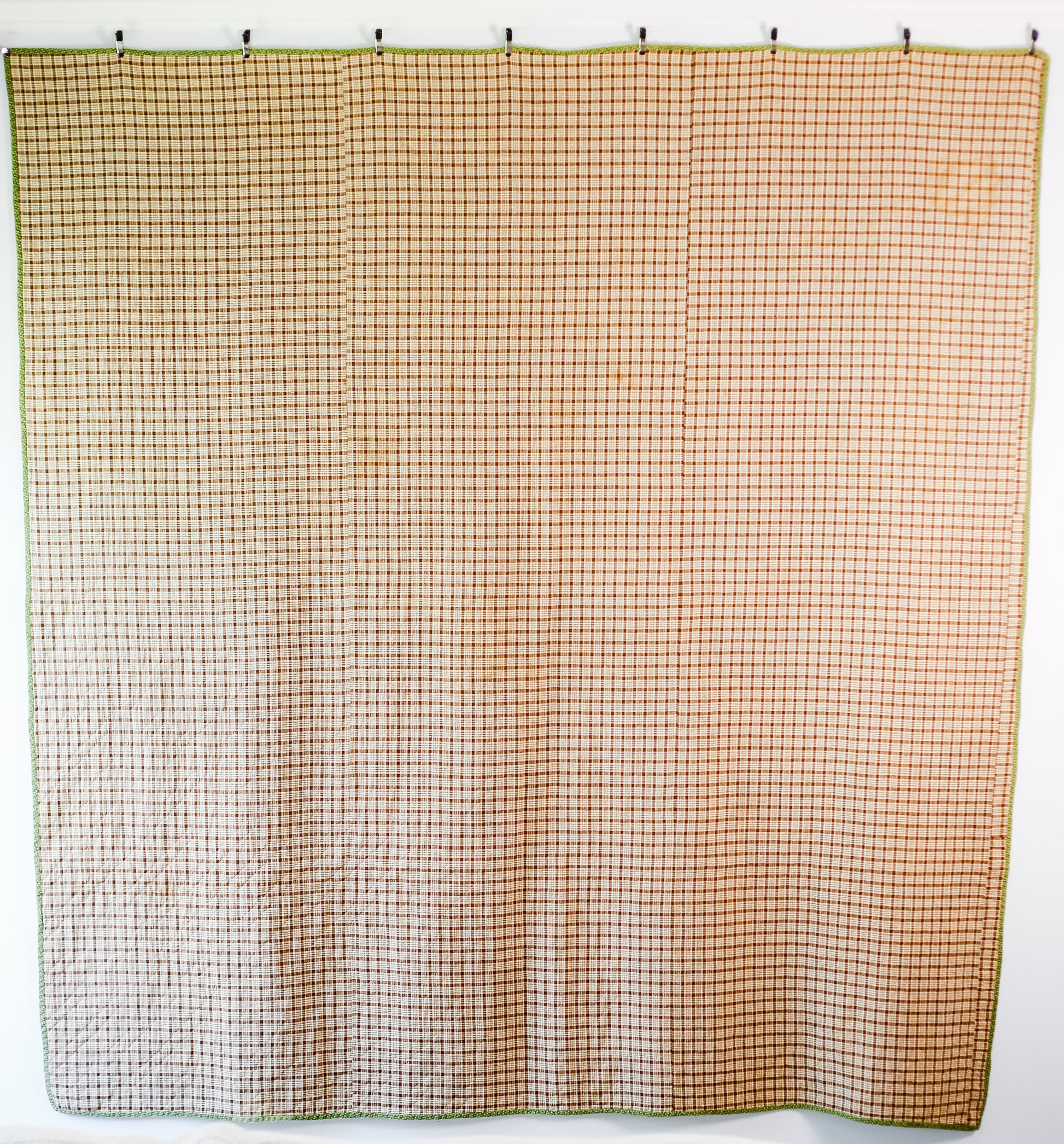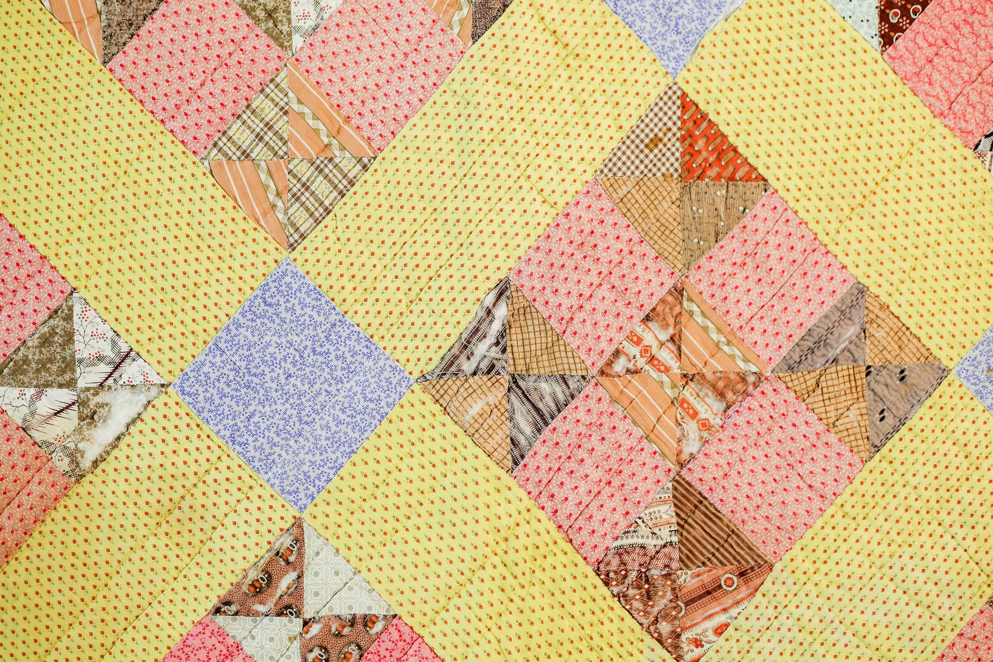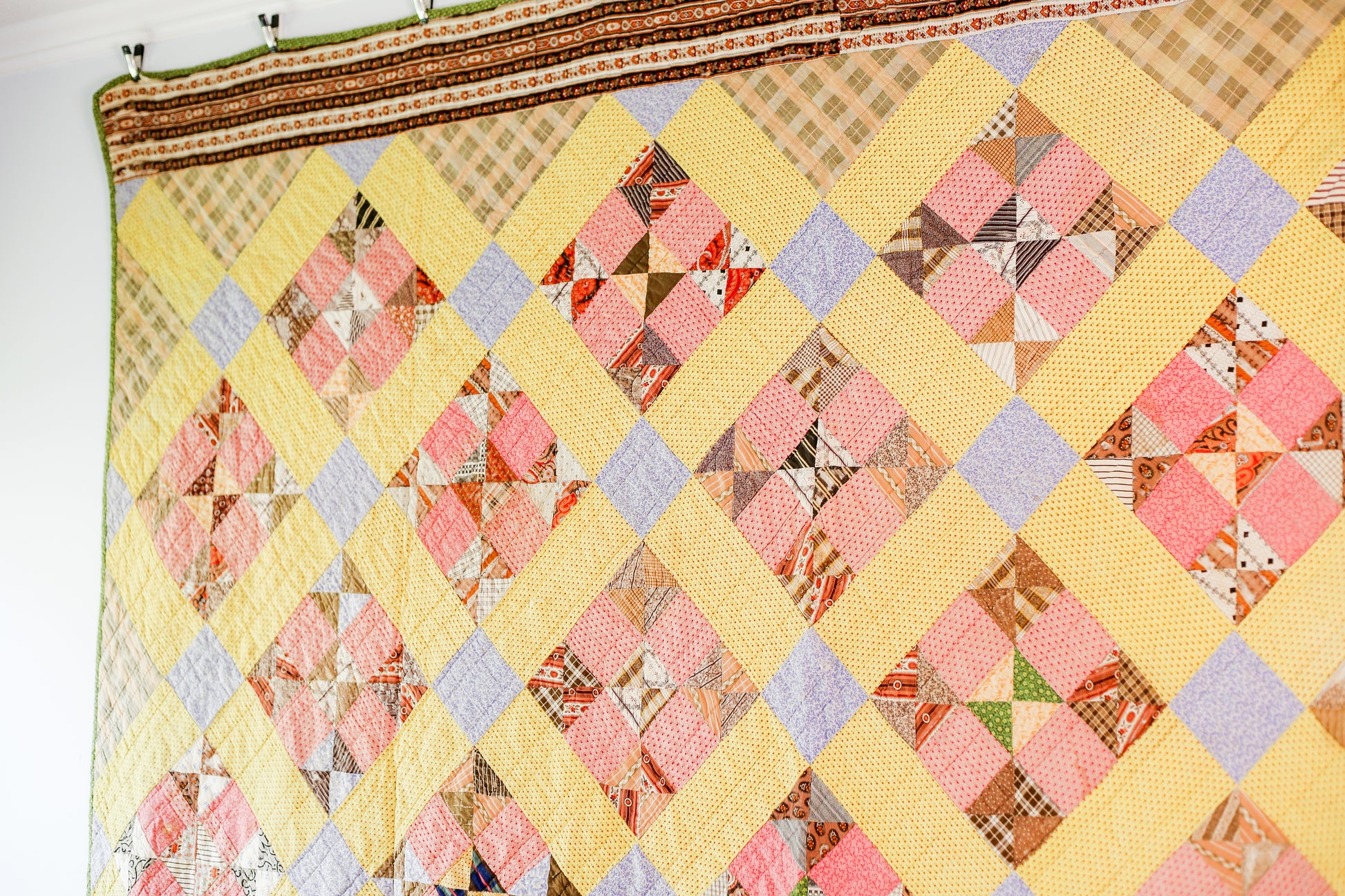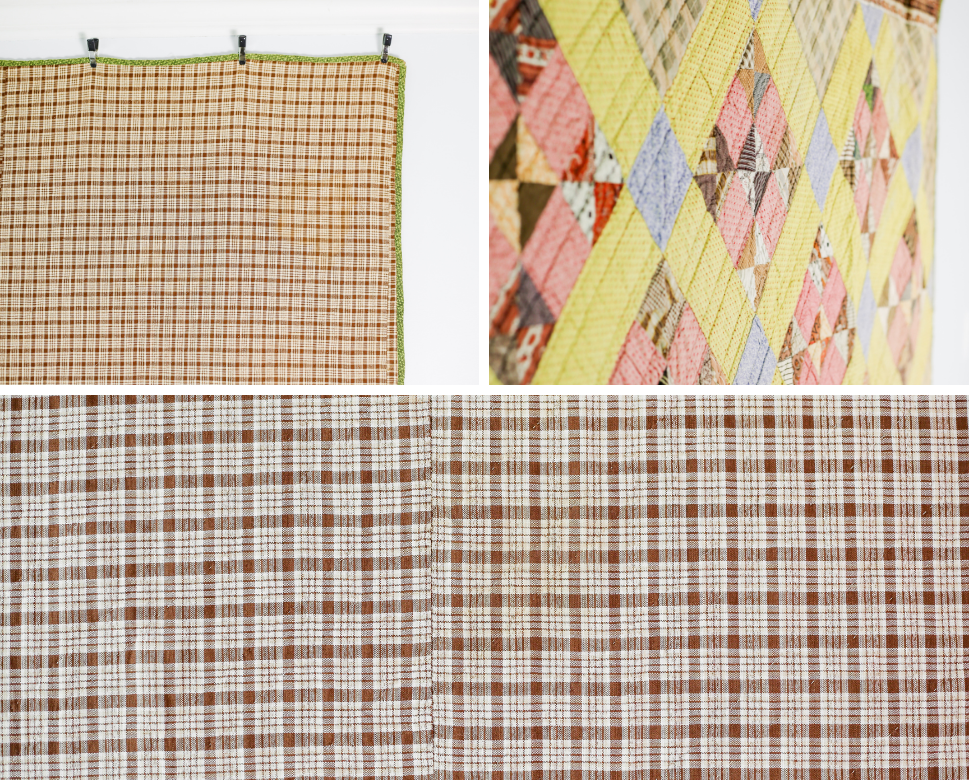 The quilt is constructed of broken dish nine patch blocks set on point. The nine patch blocks are composed of dissected triangles. The sashing is a strong chrome yellow print, with setting blocks of Lancaster blue prints. Top and bottom borders have mid-19th century madder brown prints. Backing is homespun brown gingham. Binding is overdye green print. Lightweight cotton batting. Hand quilted in parallel lines in white thread.
