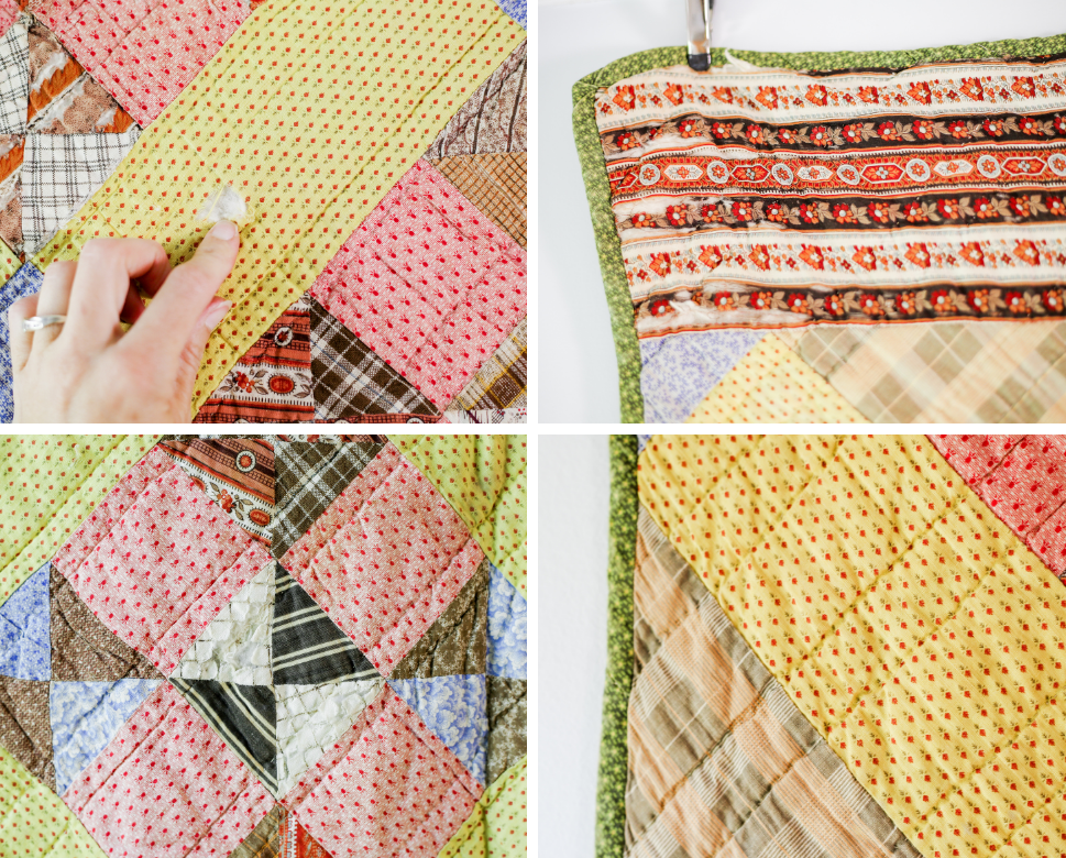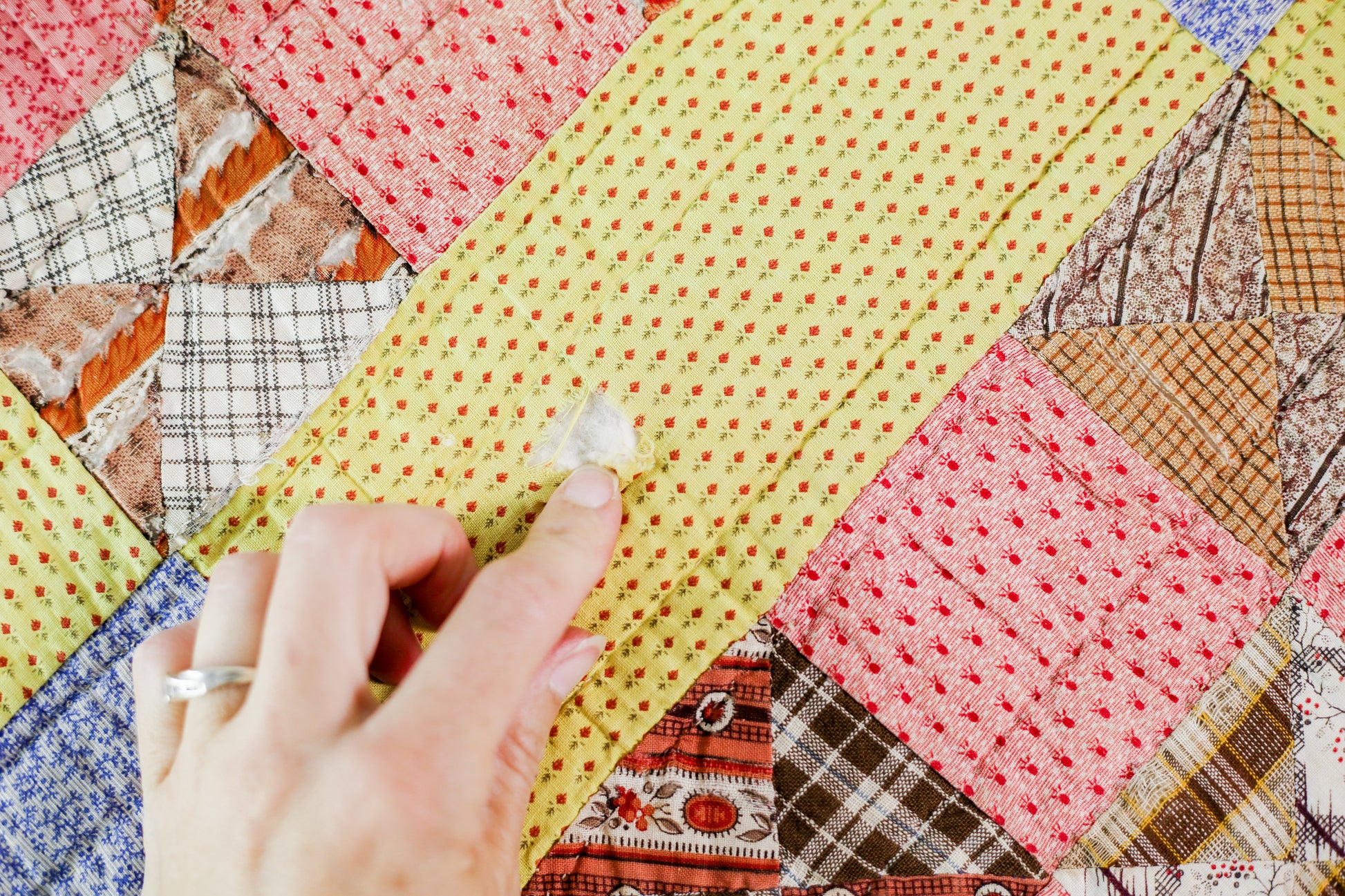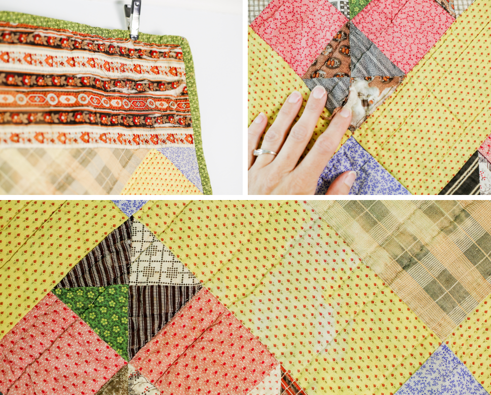 Fair antique condition. Significant fabric thinning with several areas of exposed batting. Wear on binding. Scattered storage stains front and back. It has not been washed due to concerns with fabric integrity.