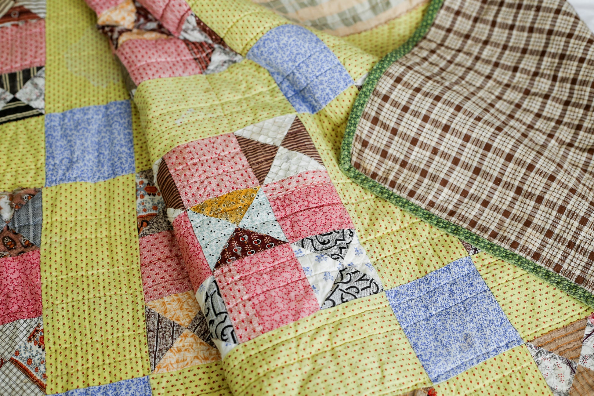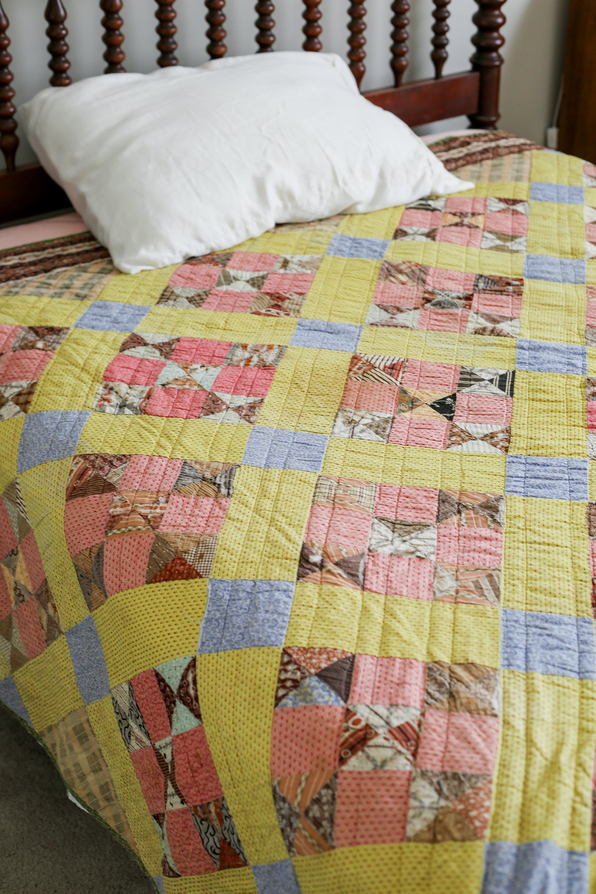 Available is a lovely early quilt with bright colors and interesting fabrics.