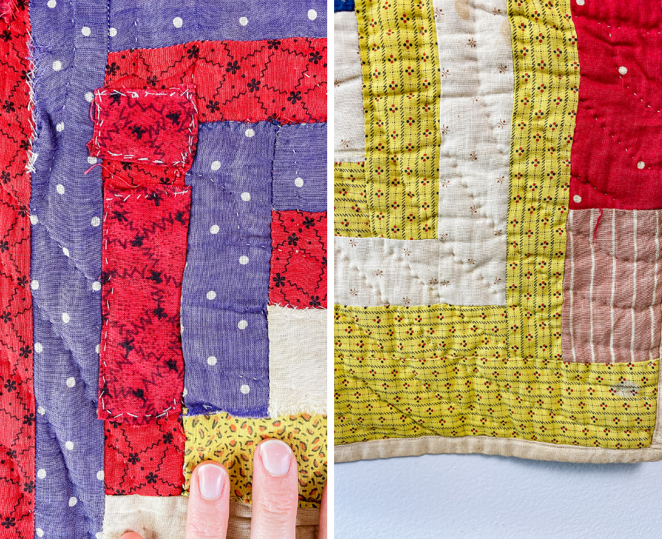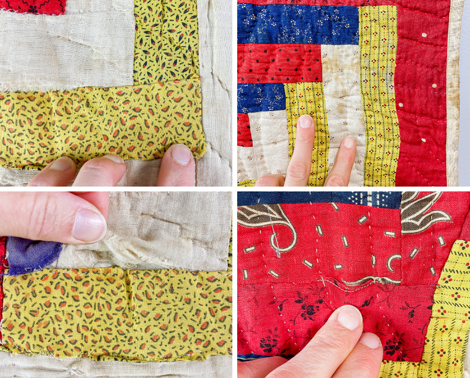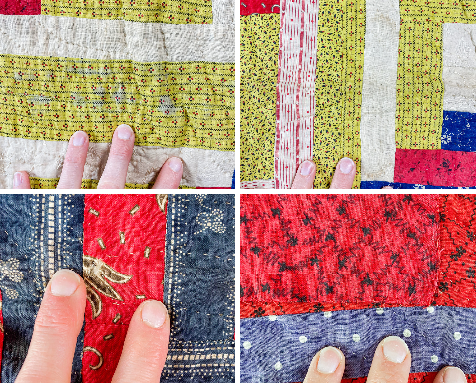 Overall good condition. Please note in the photo collages - one block has some poorly done historical repairs. It appears that reproduction fabrics were used to repair one block with damage, and these are not a perfect match. Seam separation present in that block. A sympathetic restoration to that area would be an easy repair.