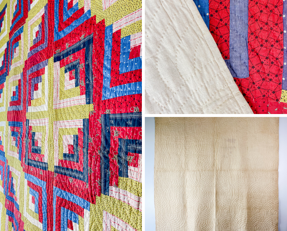 Hand quilted in white thread in Baptist fan pattern. Medium weight cotton batting. Backing is off-white muslin. Bound back to front, machine finished.
