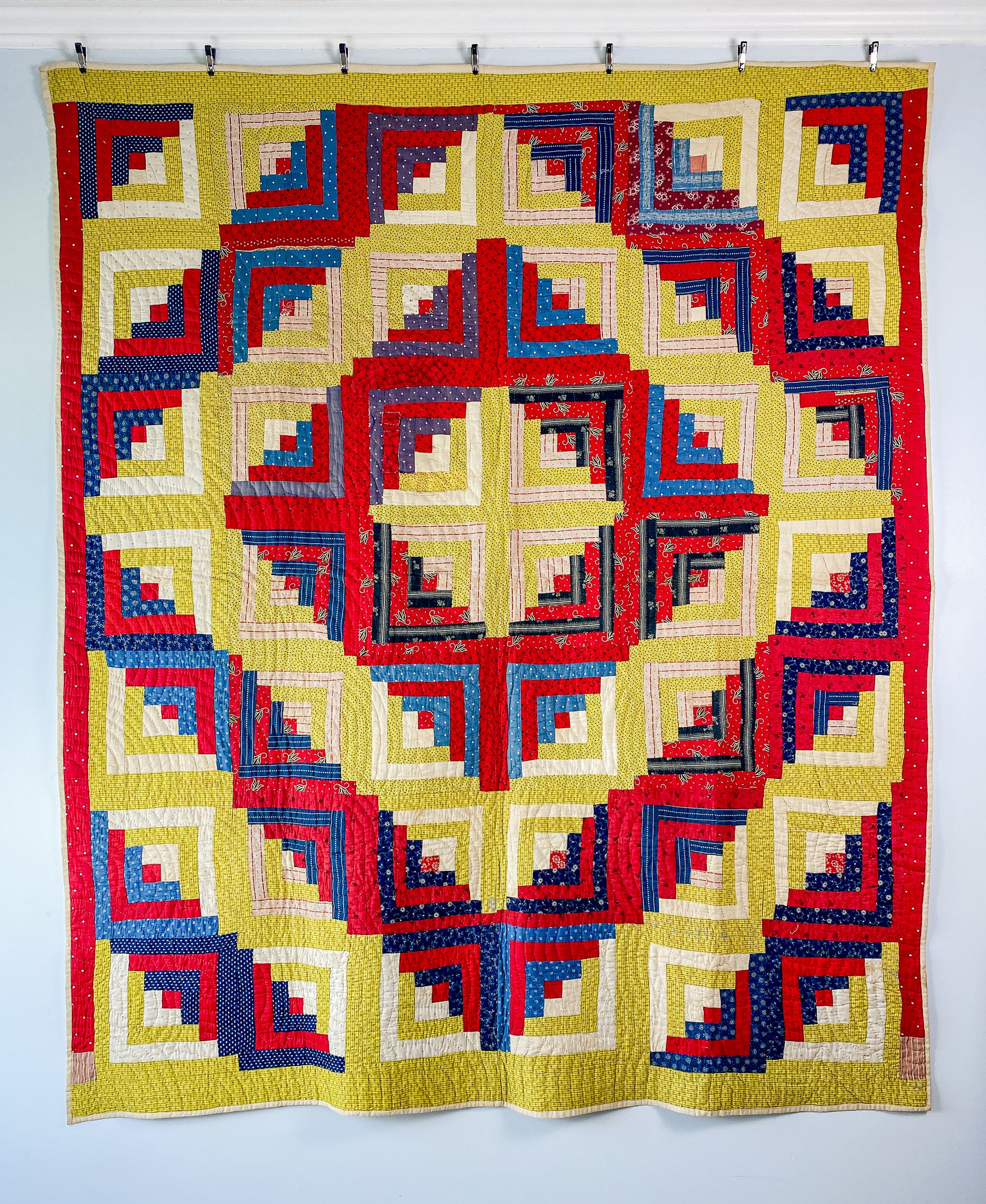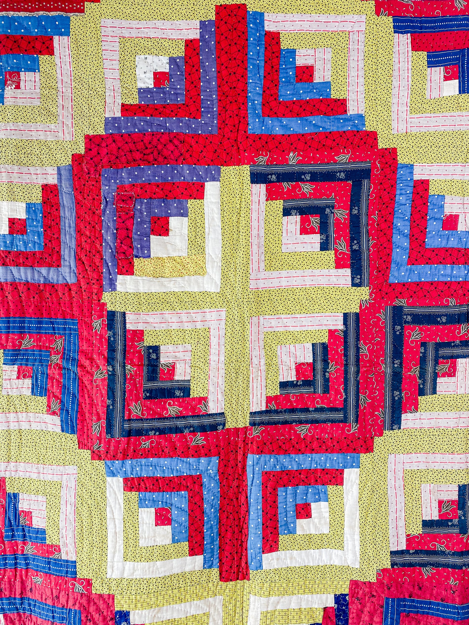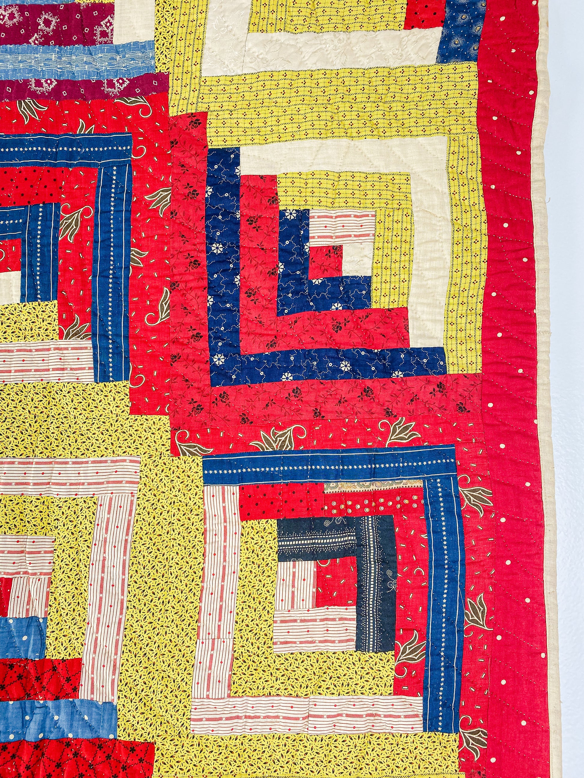 The quilt is constructed in the Barn Raising Log Cabin pattern, with carefully designed blocks of machine pieced strips set into alternating rows of yellow and red fabrics. The fabrics have some incredible chrome yellow prints, red and blacks, burgundy, indigo, cadet blue and even purple with white polka dot patterns. Fabrics still have a nice sheen to them and feel unwashed.