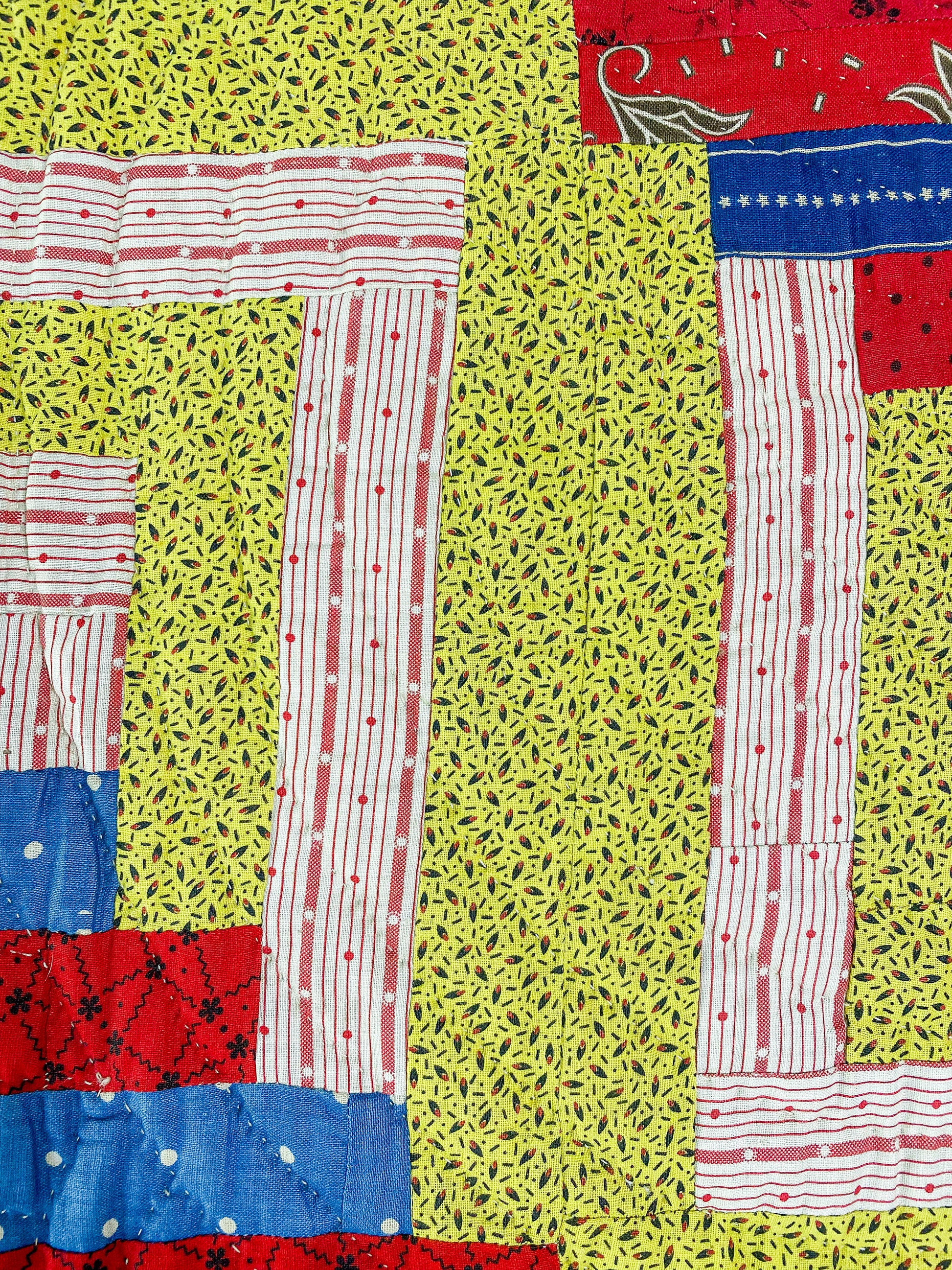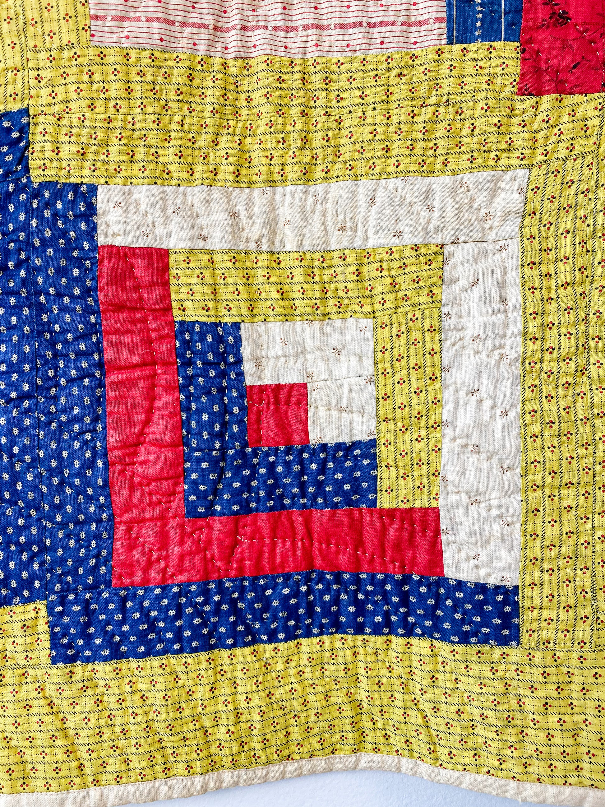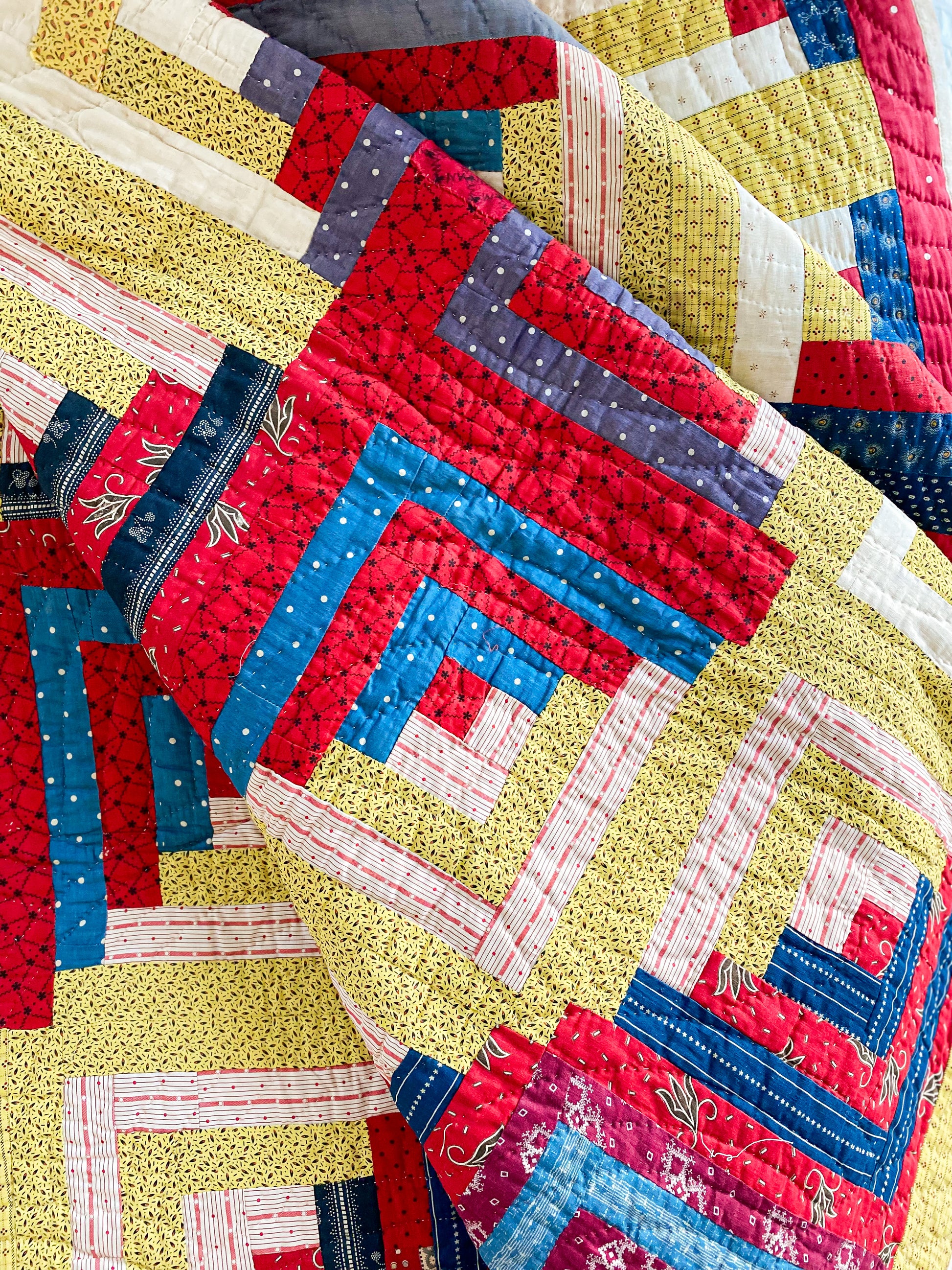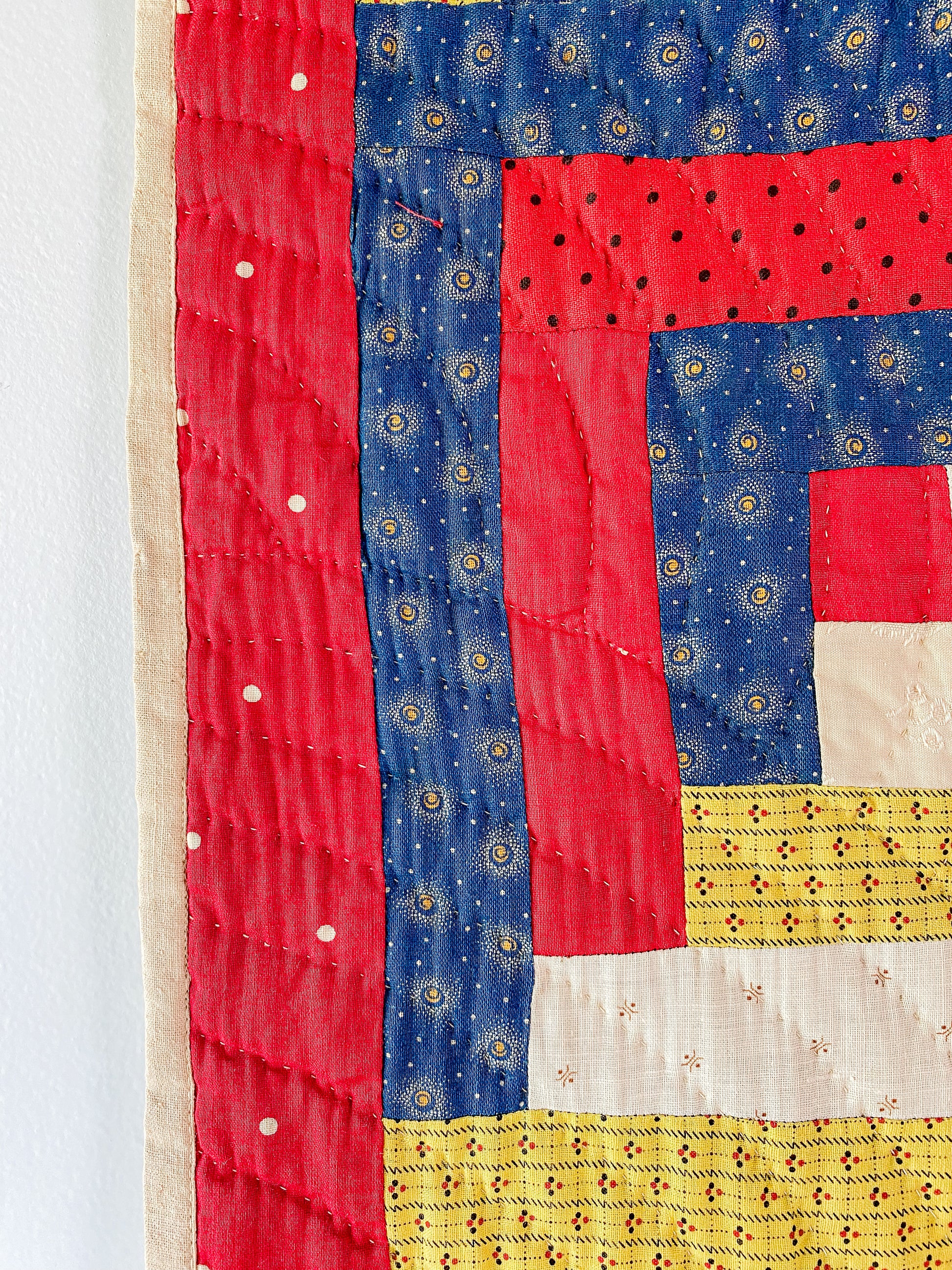 The quilt is constructed in the Barn Raising Log Cabin pattern, with carefully designed blocks of machine pieced strips set into alternating rows of yellow and red fabrics. The fabrics have some incredible chrome yellow prints, red and blacks, burgundy, indigo, cadet blue and even purple with white polka dot patterns. Fabrics still have a nice sheen to them and feel unwashed.