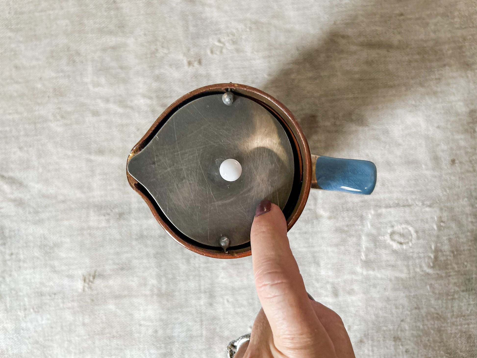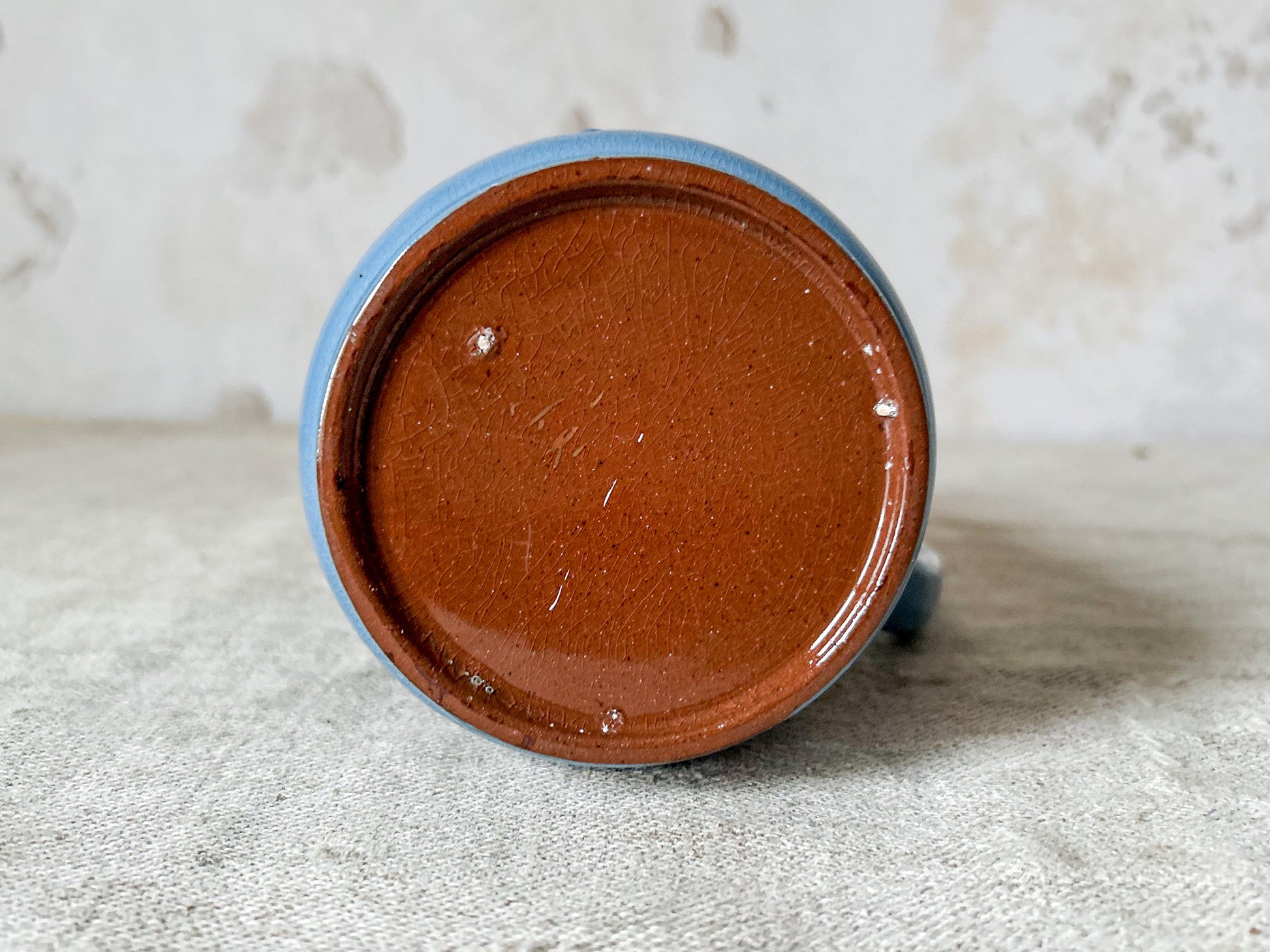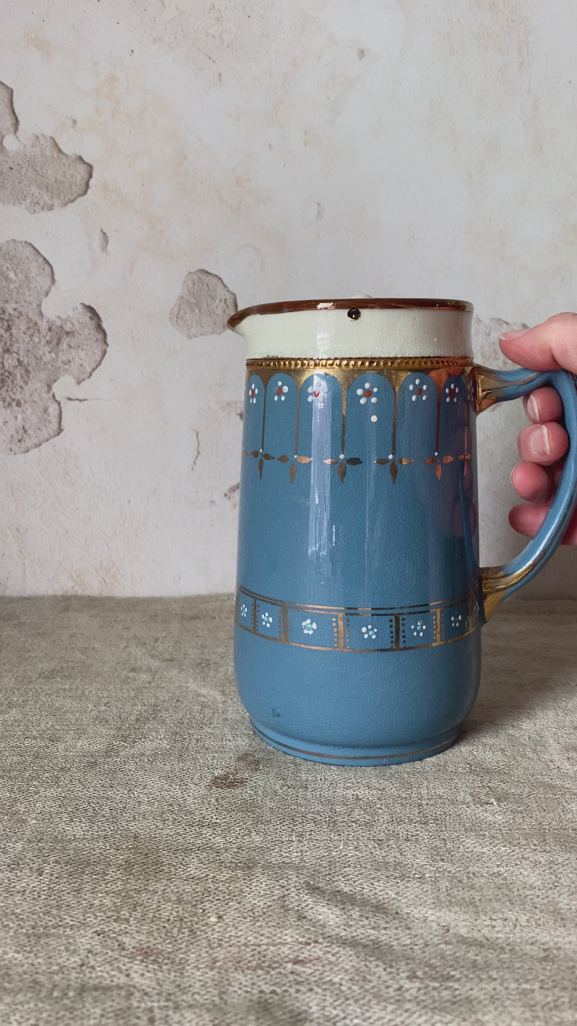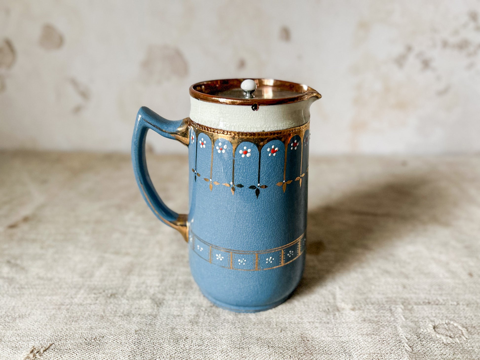 Available is an antique earthenware pitcher with an unusual pewter gravity tip lid. The body is glazed in blue and white, with copper luster hand painted details. The lid is pewter with a small porcelain knob.