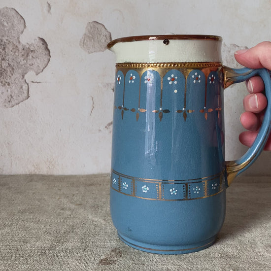 English Blue and Copper Luster Jug With Pewter Gravity Tip Lid