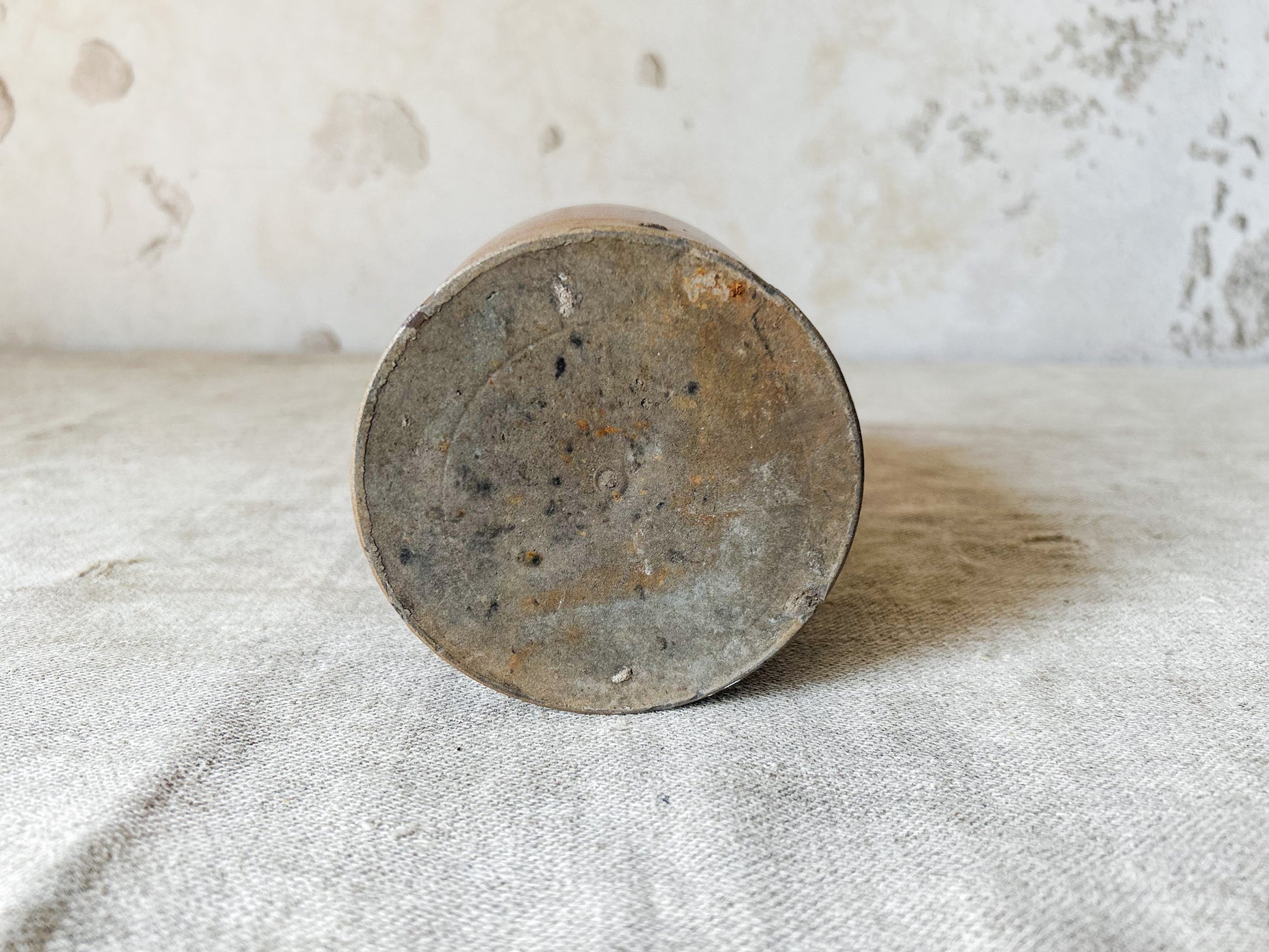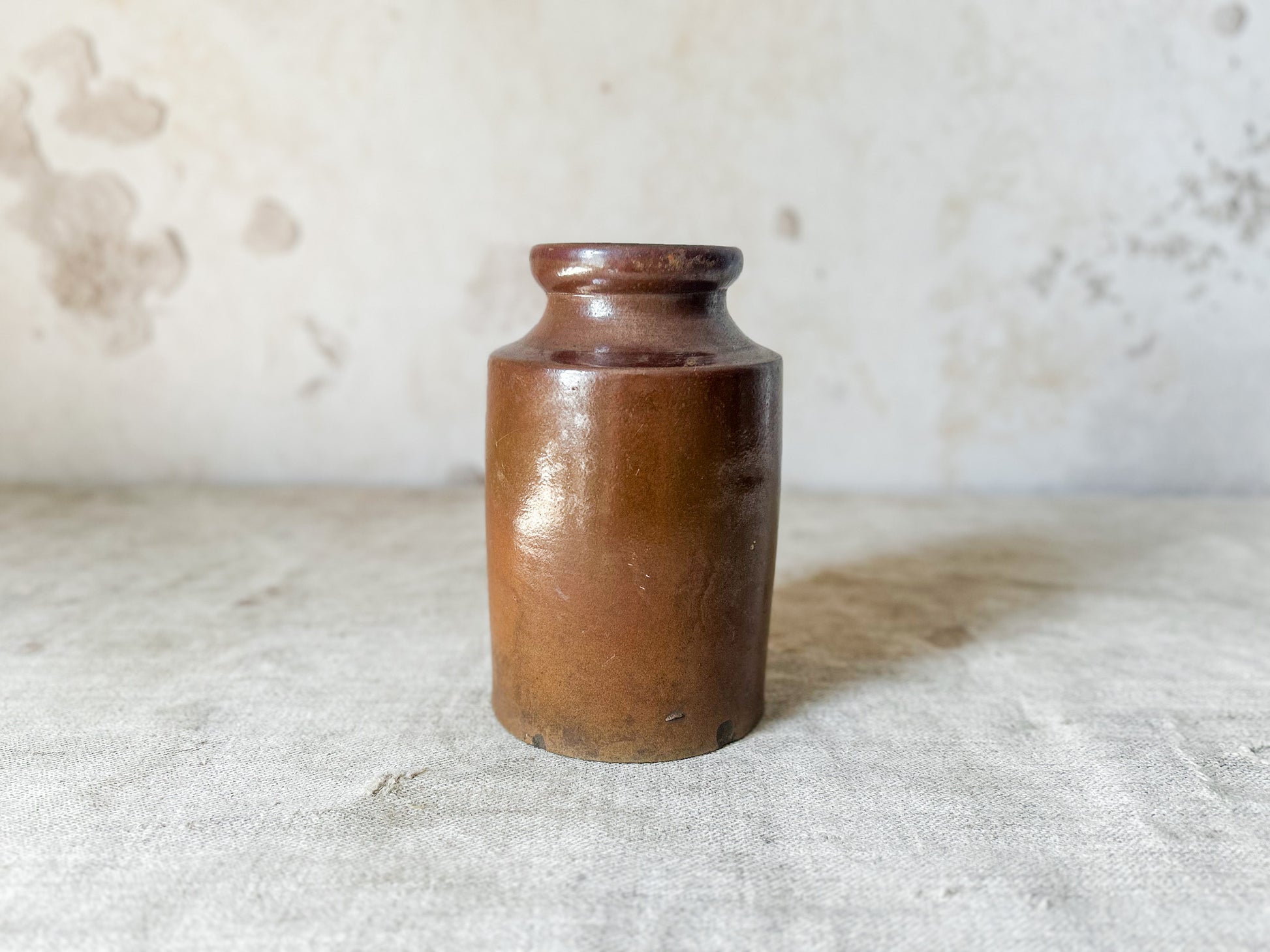 Available is an antique stoneware pot, salvaged from a Victorian dump site in England. The brown salt glaze finish has an earthy, minimalist look, while the narrowed rolled neck makes it an ideal vessel for floral arrangements.