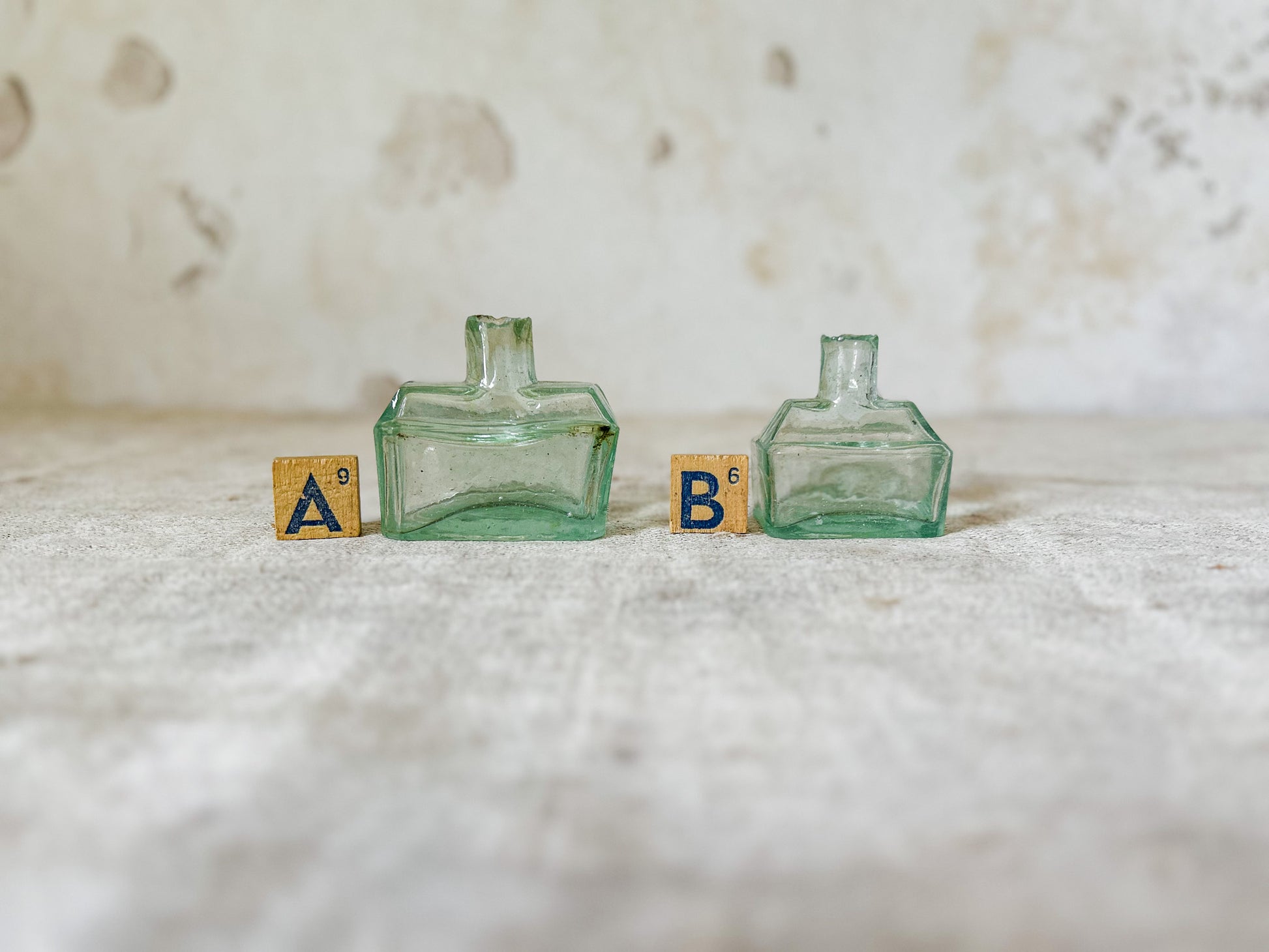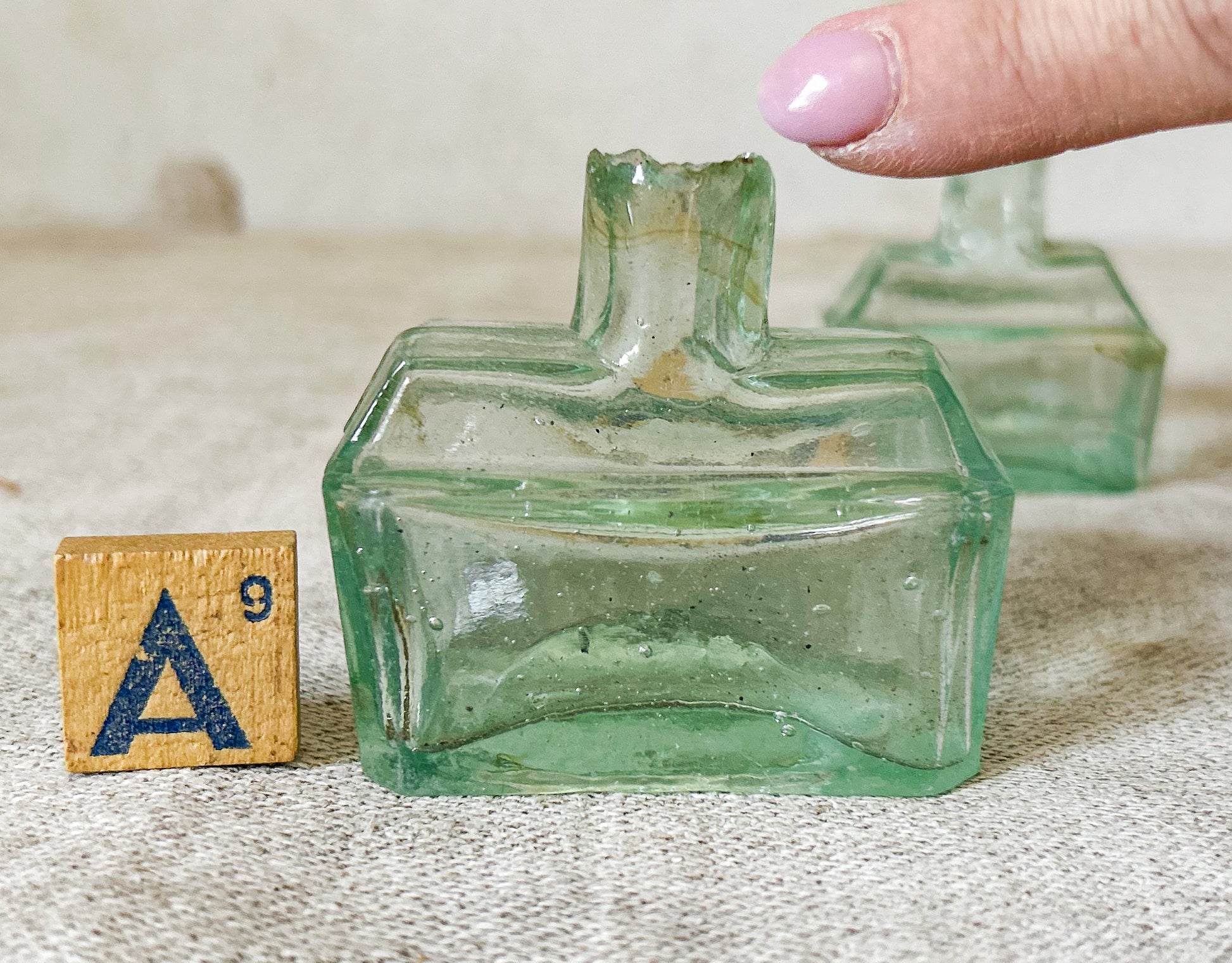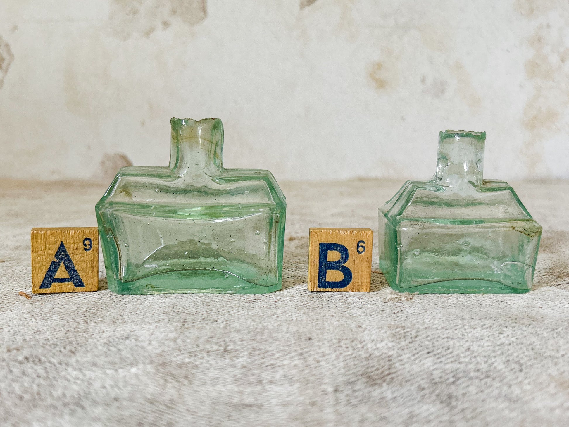 Available is your choice of antique English glass inkwells. These rectangular bottles are the same shape and design, in two different sizes. The indentations on either side of the neck were used as pen rests for ink pens. These were mass produced in the late 19th and early 20th centuries in England and were salvaged from a Victorian dump site in England.
