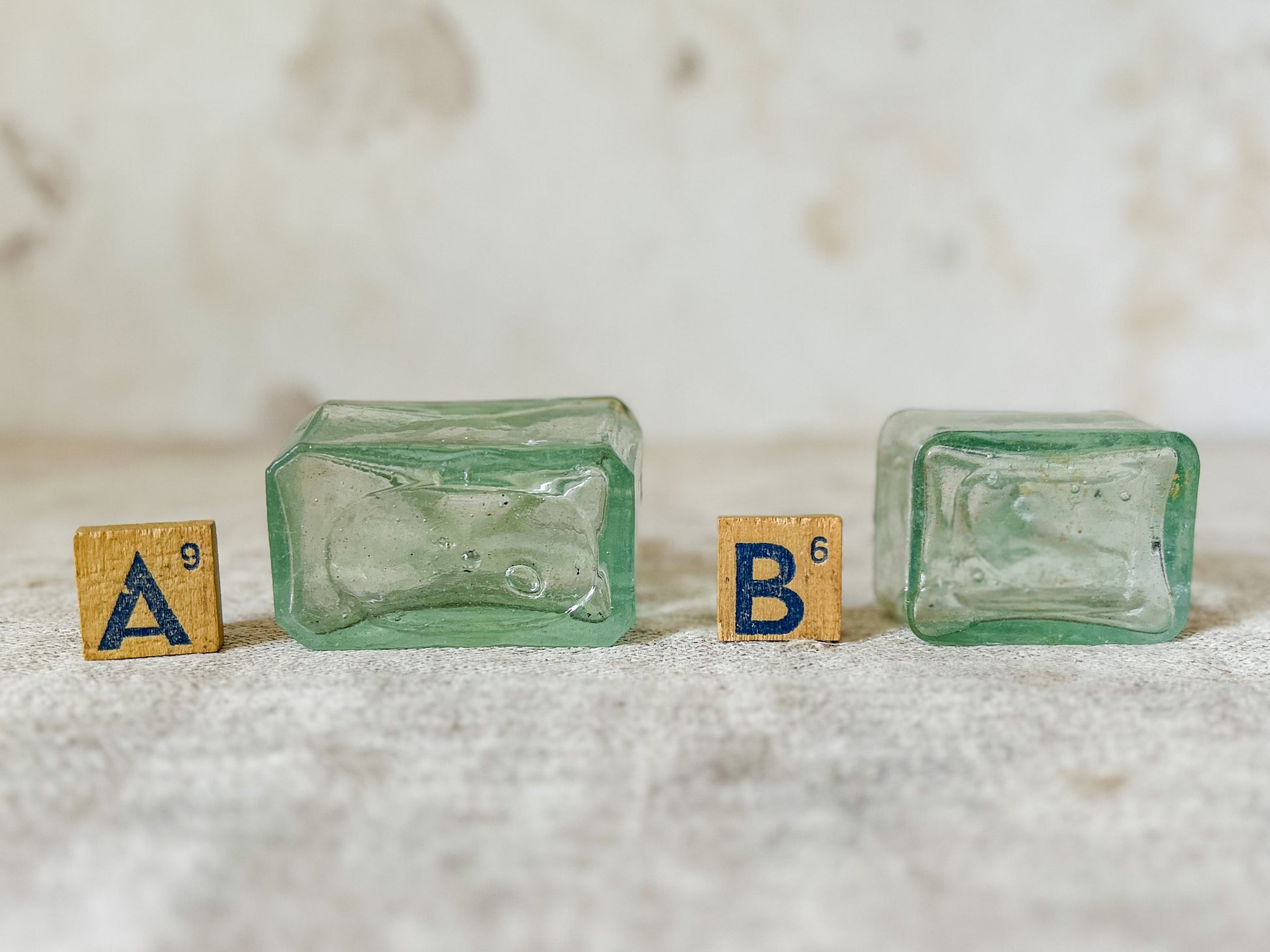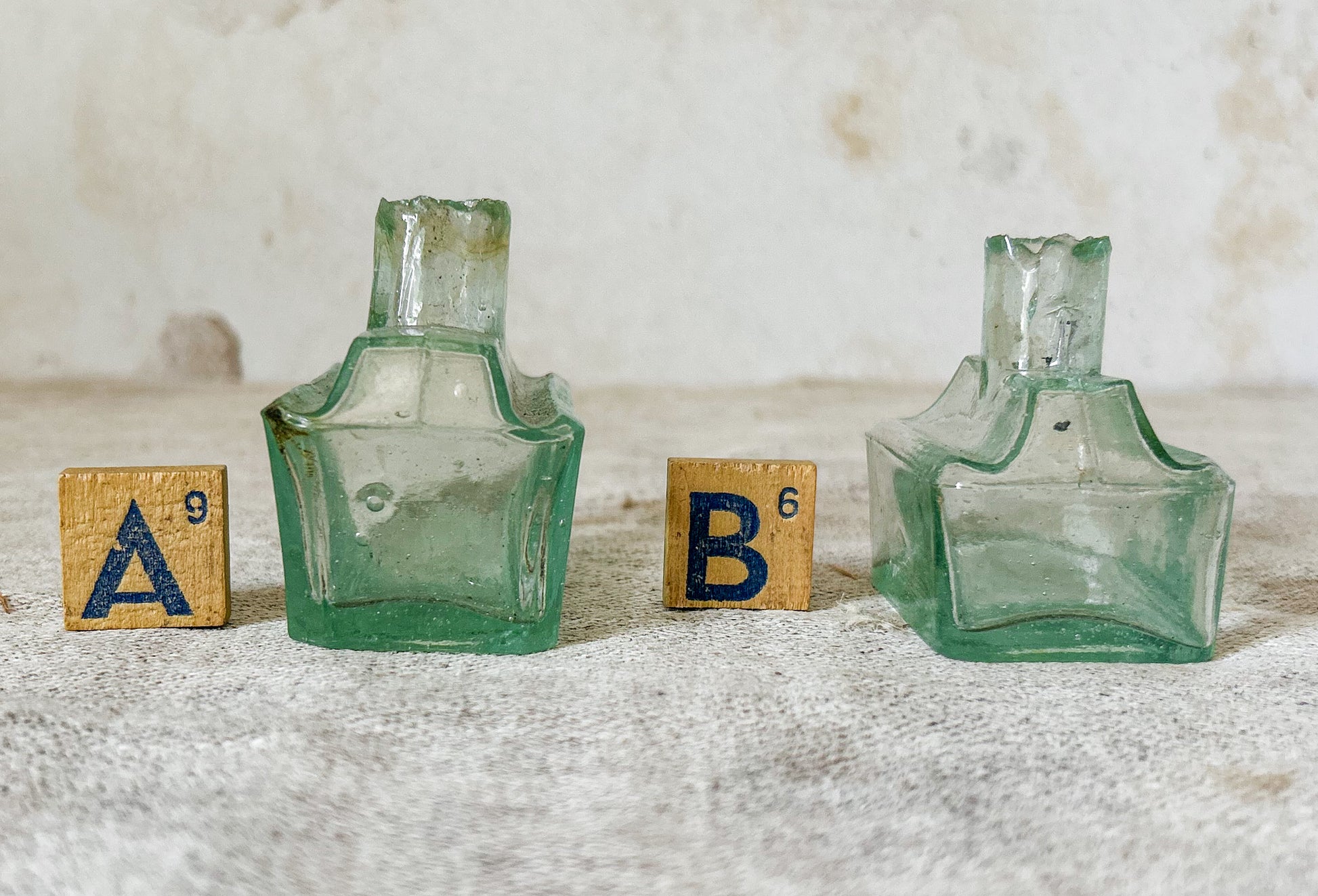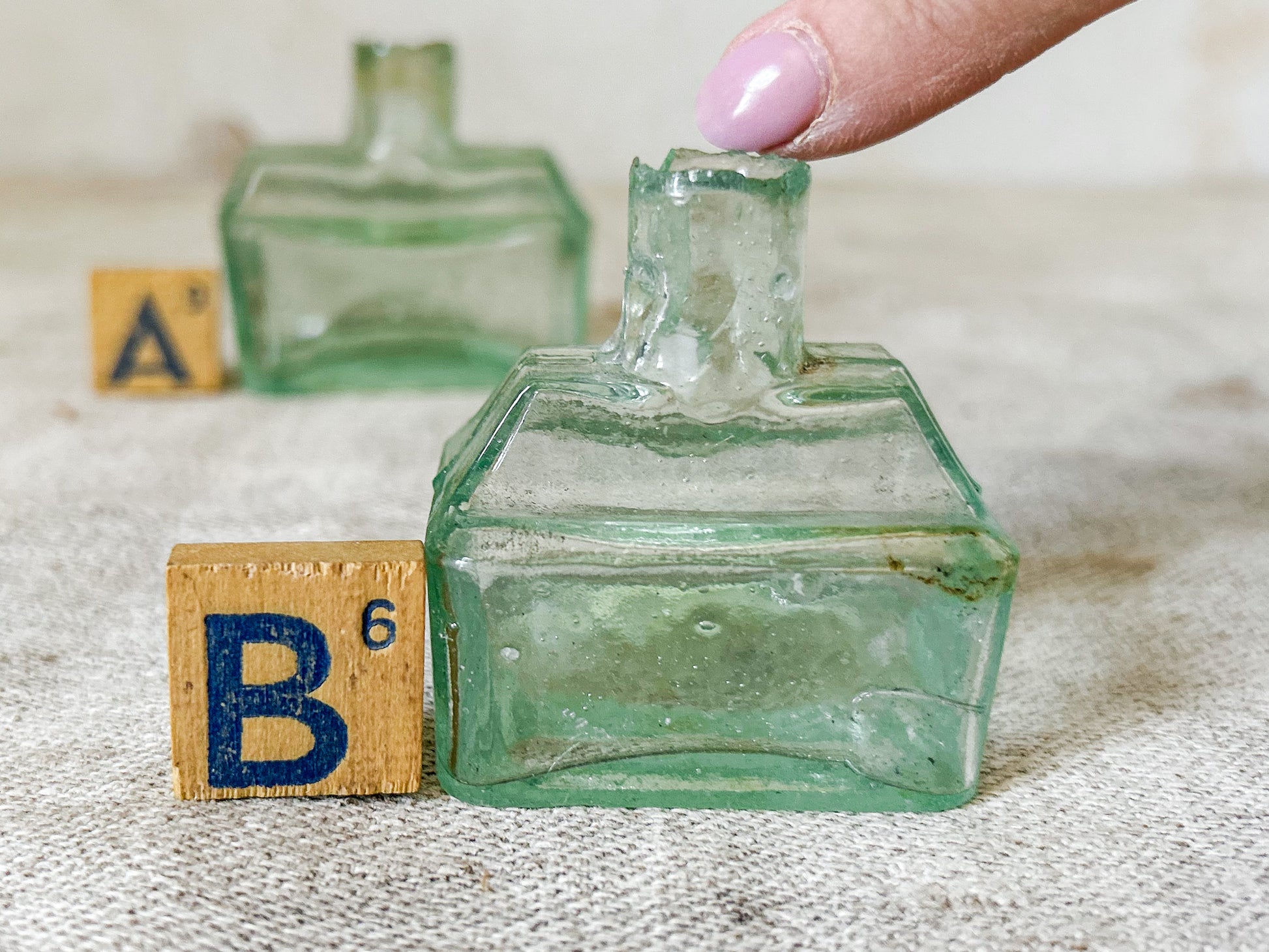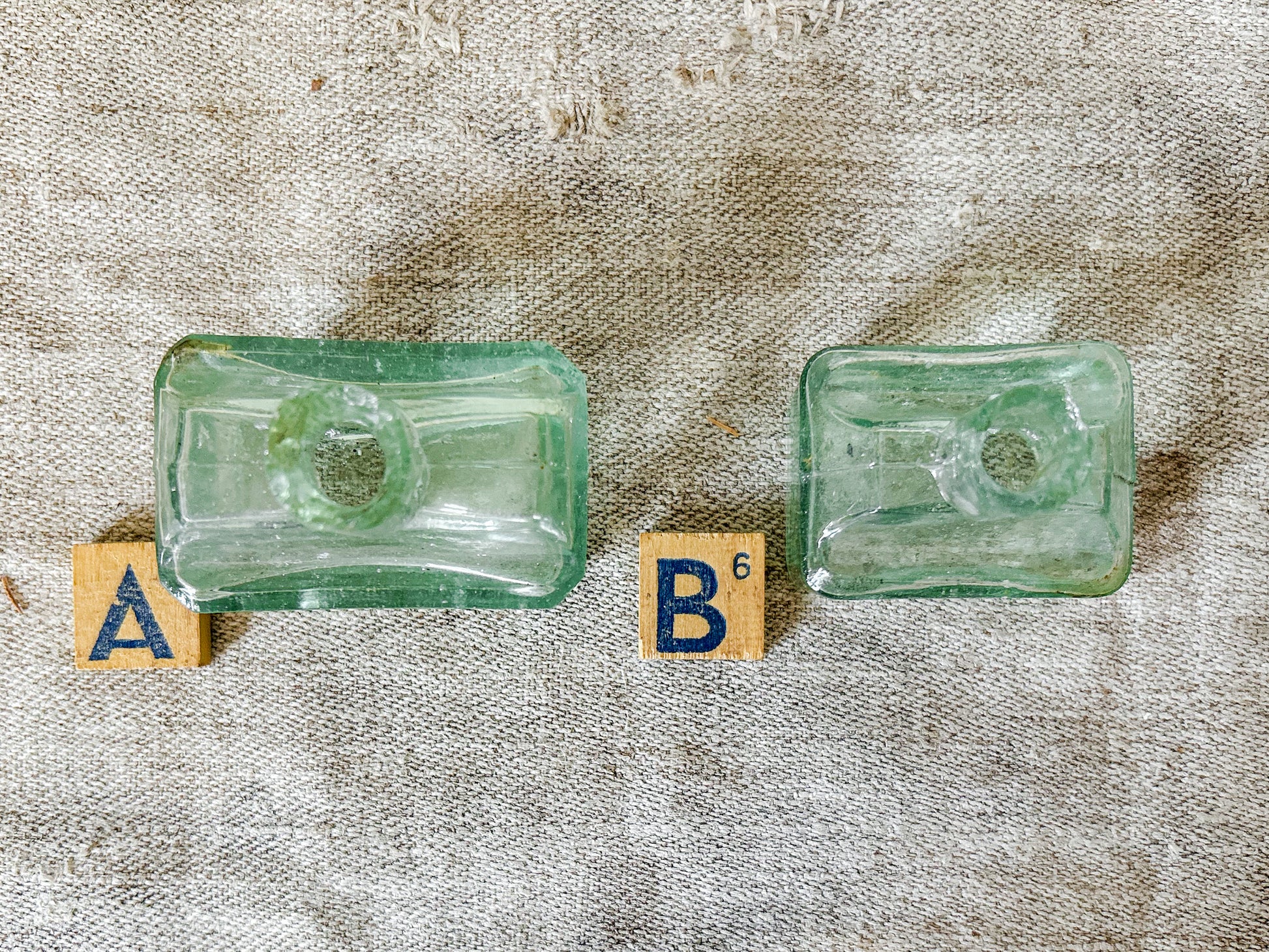 Available is your choice of antique English glass inkwells. These rectangular bottles are the same shape and design, in two different sizes. The indentations on either side of the neck were used as pen rests for ink pens. These were mass produced in the late 19th and early 20th centuries in England and were salvaged from a Victorian dump site in England.