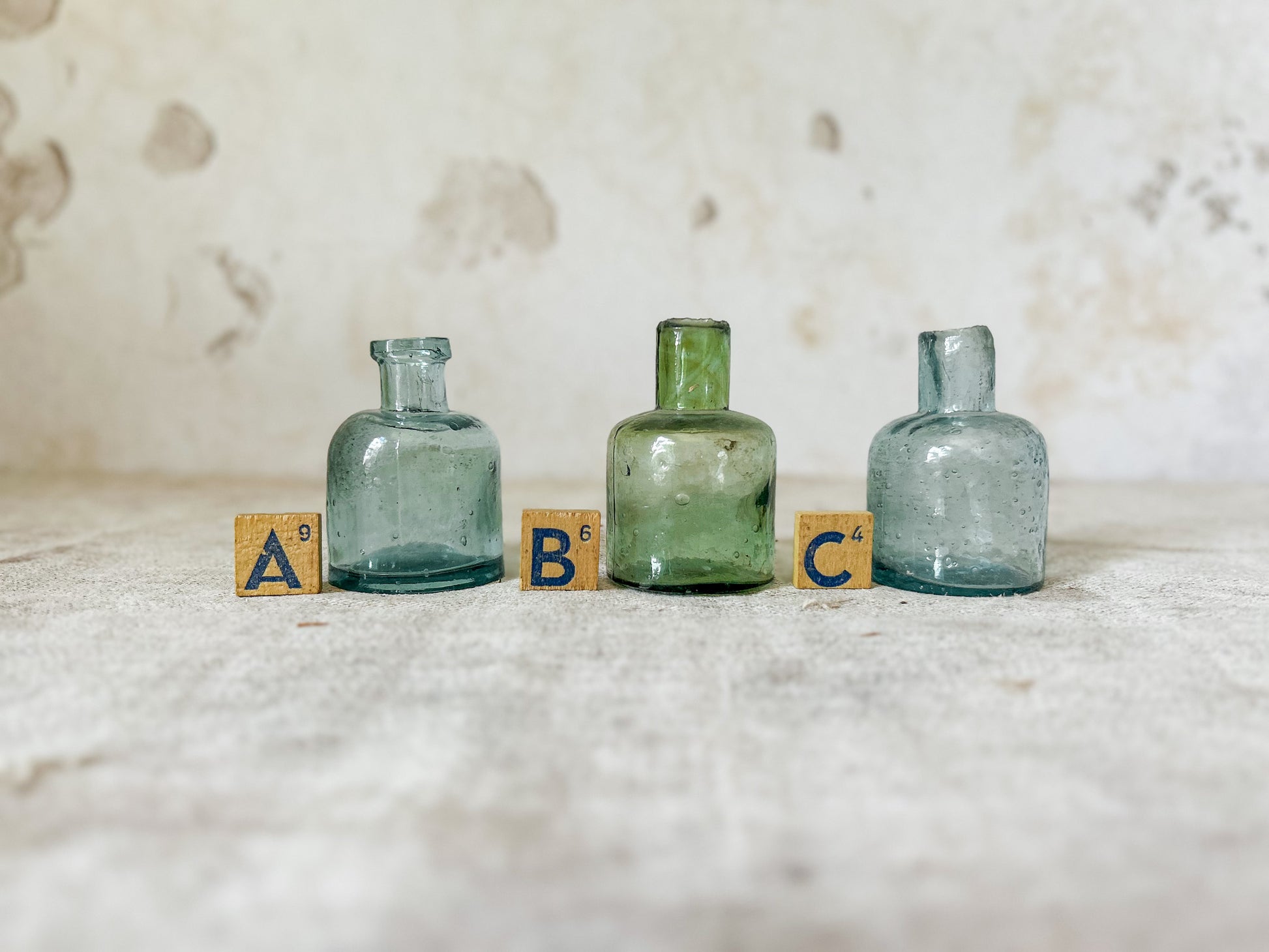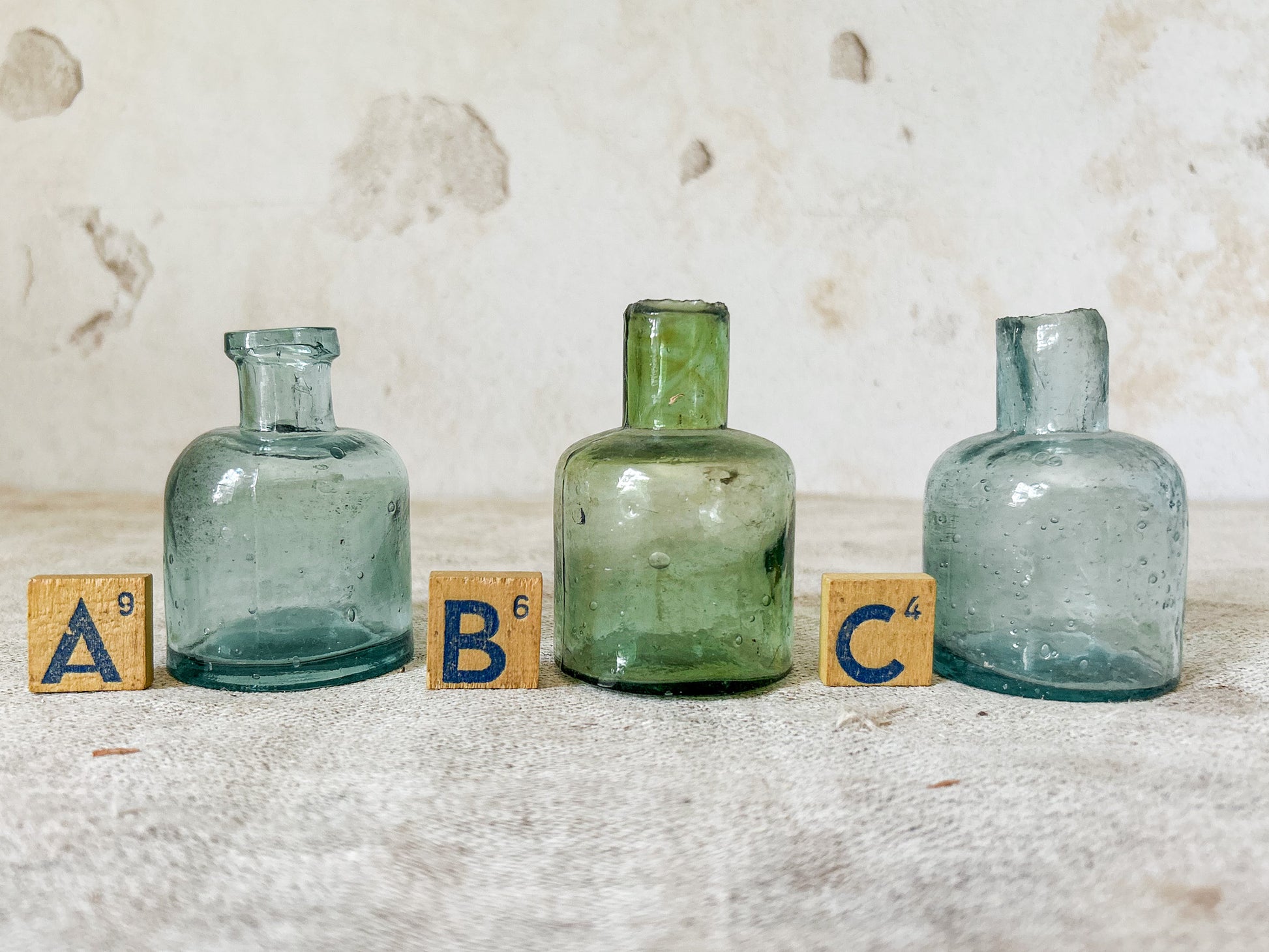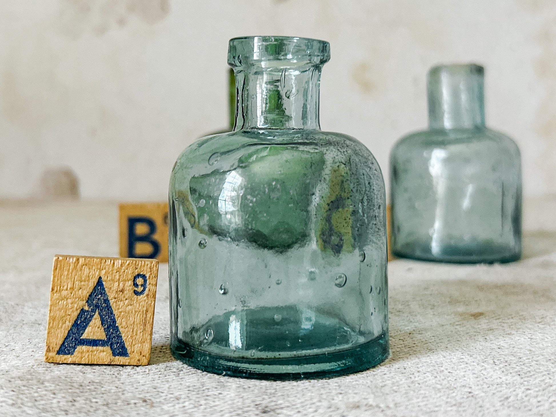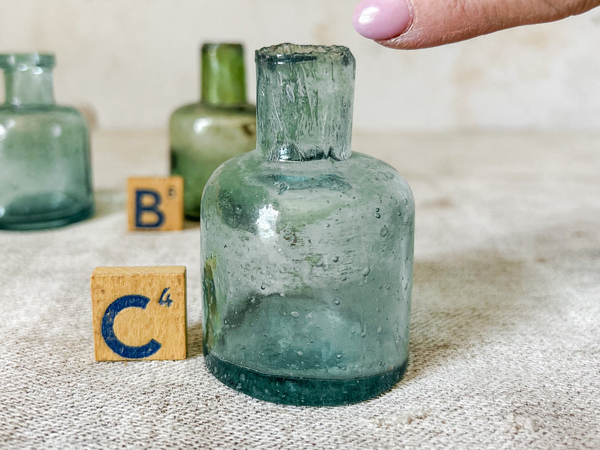 Available is your choice of antique English inkwell. Each one is a lovely shade of aqua, varying from kelly green to light aqua blue. The round shapes and blown tops have a handmade quality.
