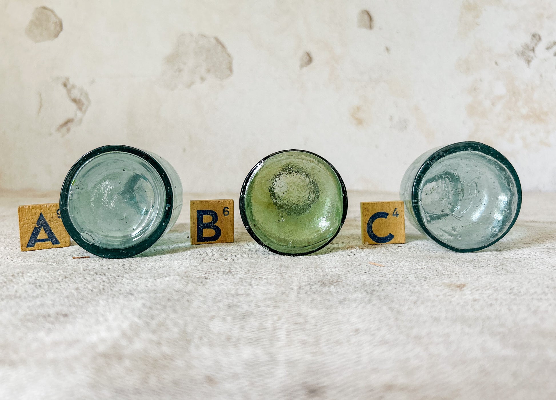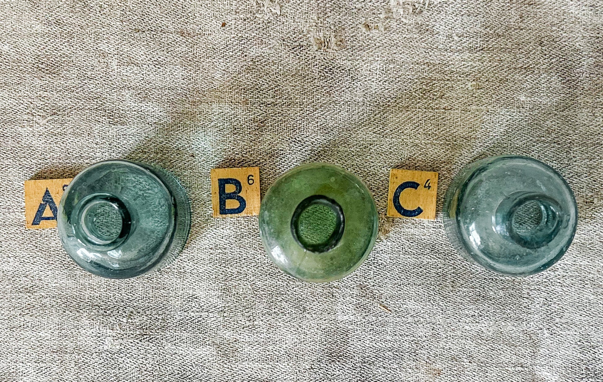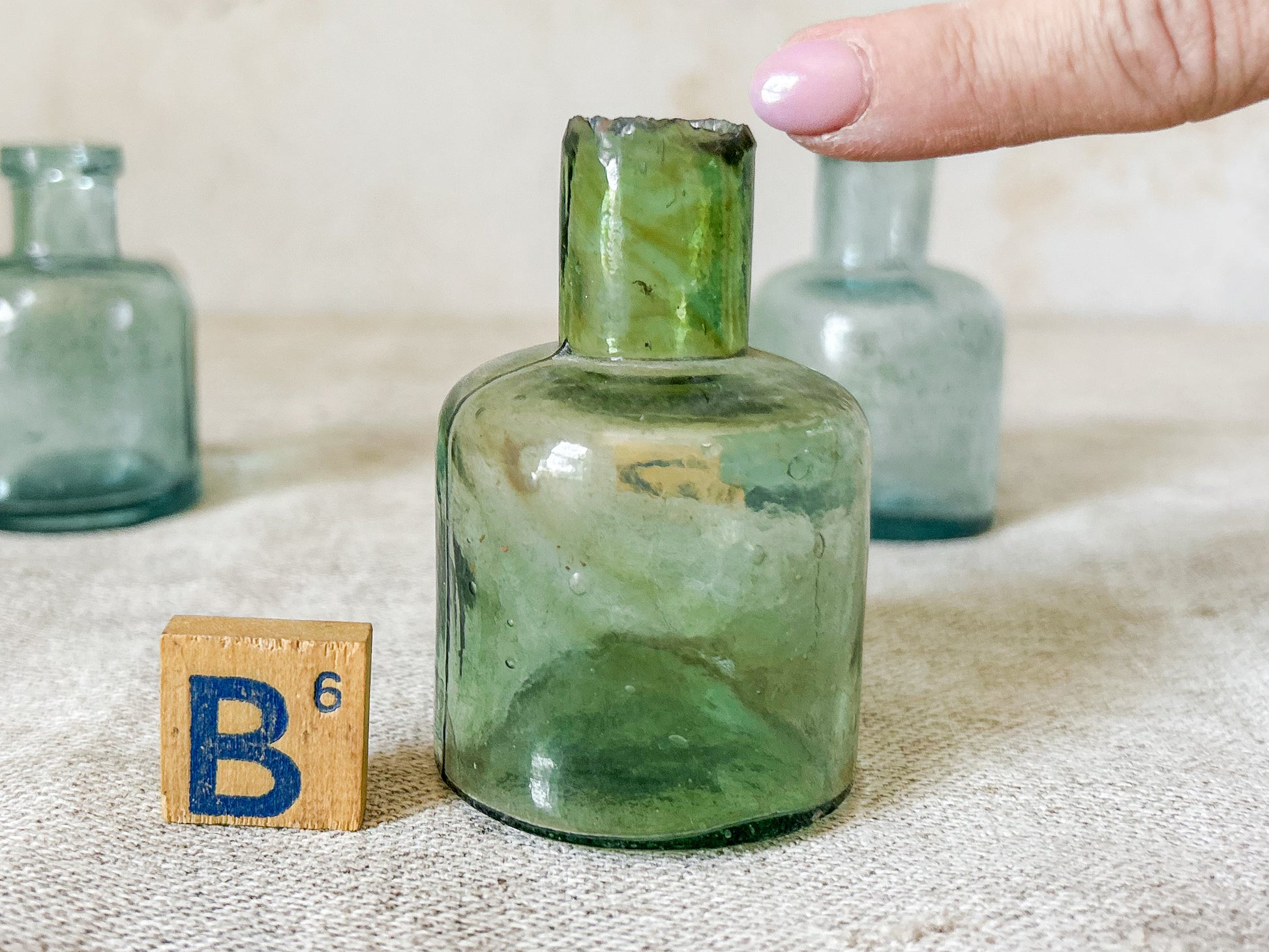 These were salvaged from a Victorian dump site and are also known as 'penny inks.' They were mass produced in the Victorian era as small inkwells. They are the perfect petite size for mini vases and pops of color in your decor.