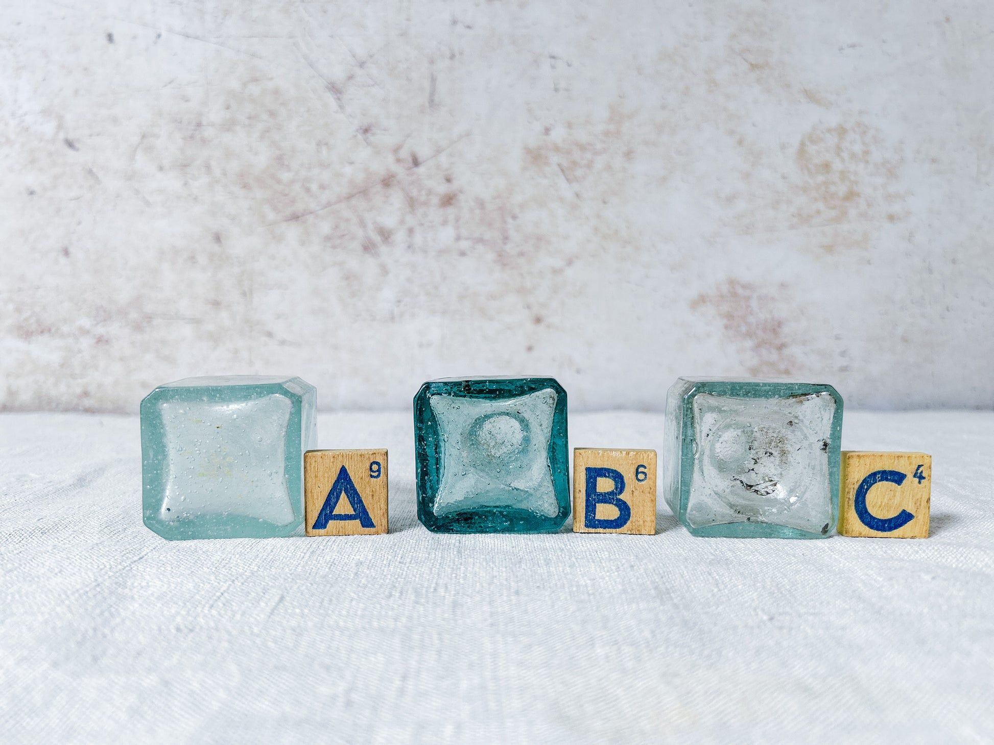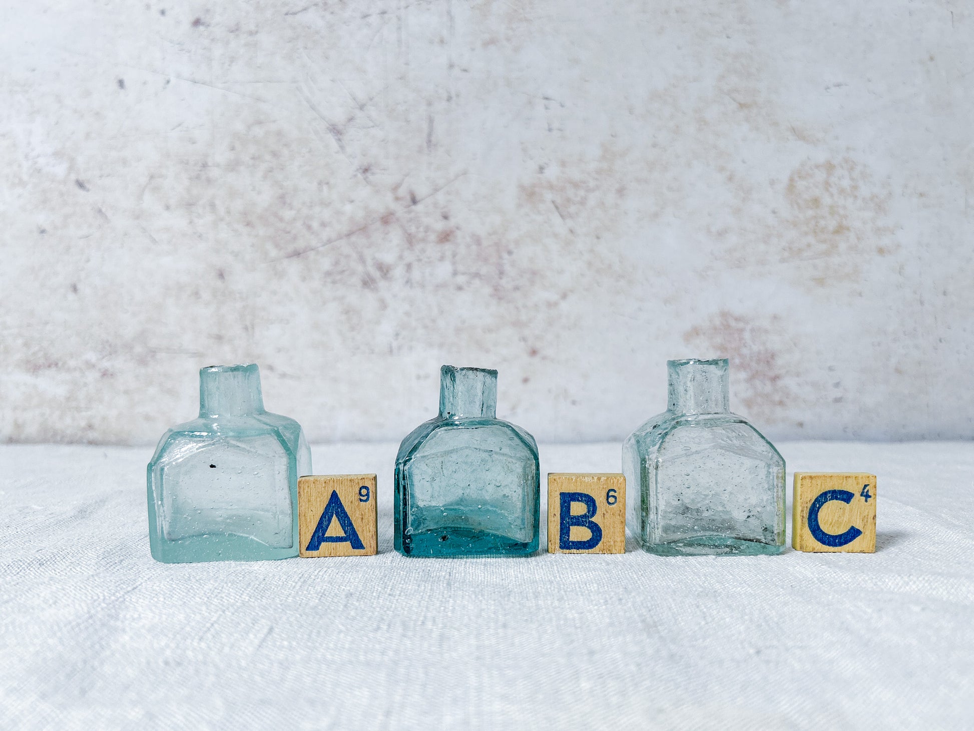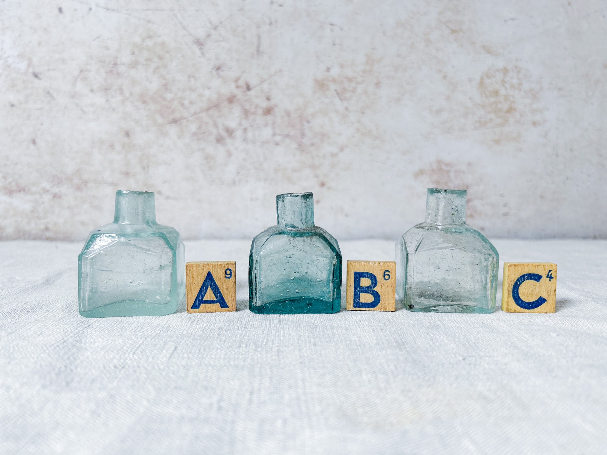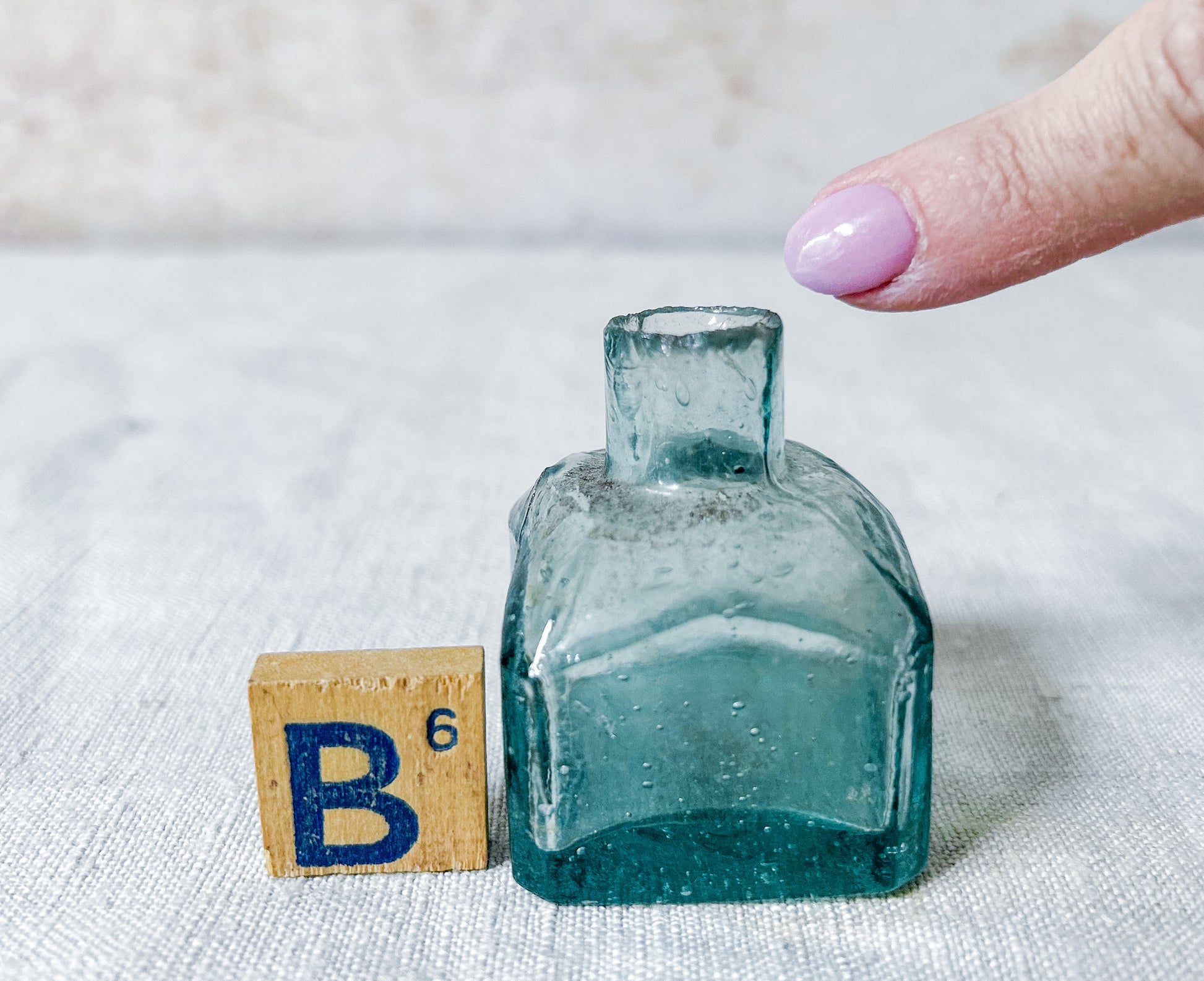 Available is your choice of antique English glass inkwells. Each one has a faceted square side and shoulders, with a sheared hand-blown top. Attractive colors of aqua glass, similar to sea-glass tones of turquoise and blue-green.