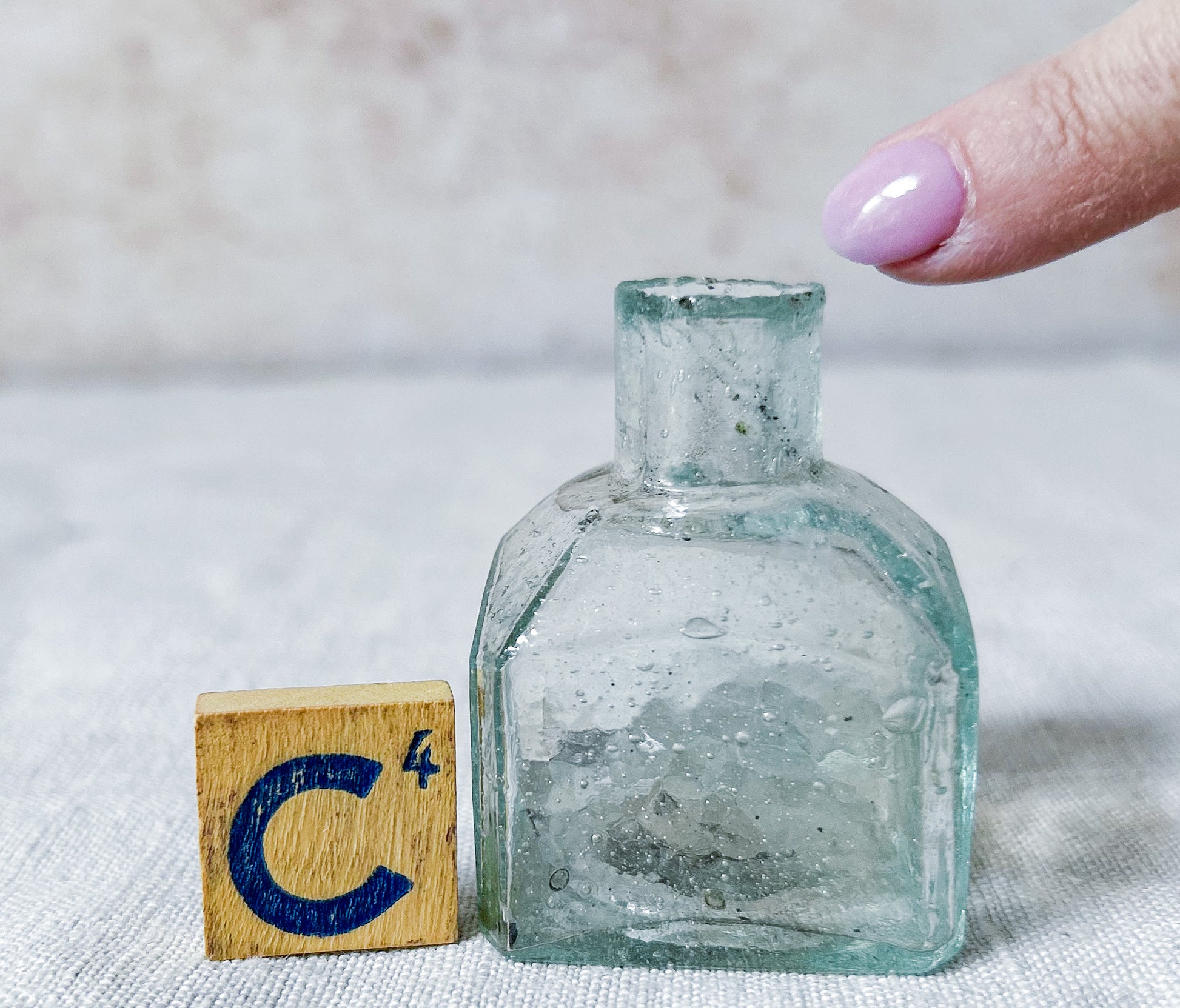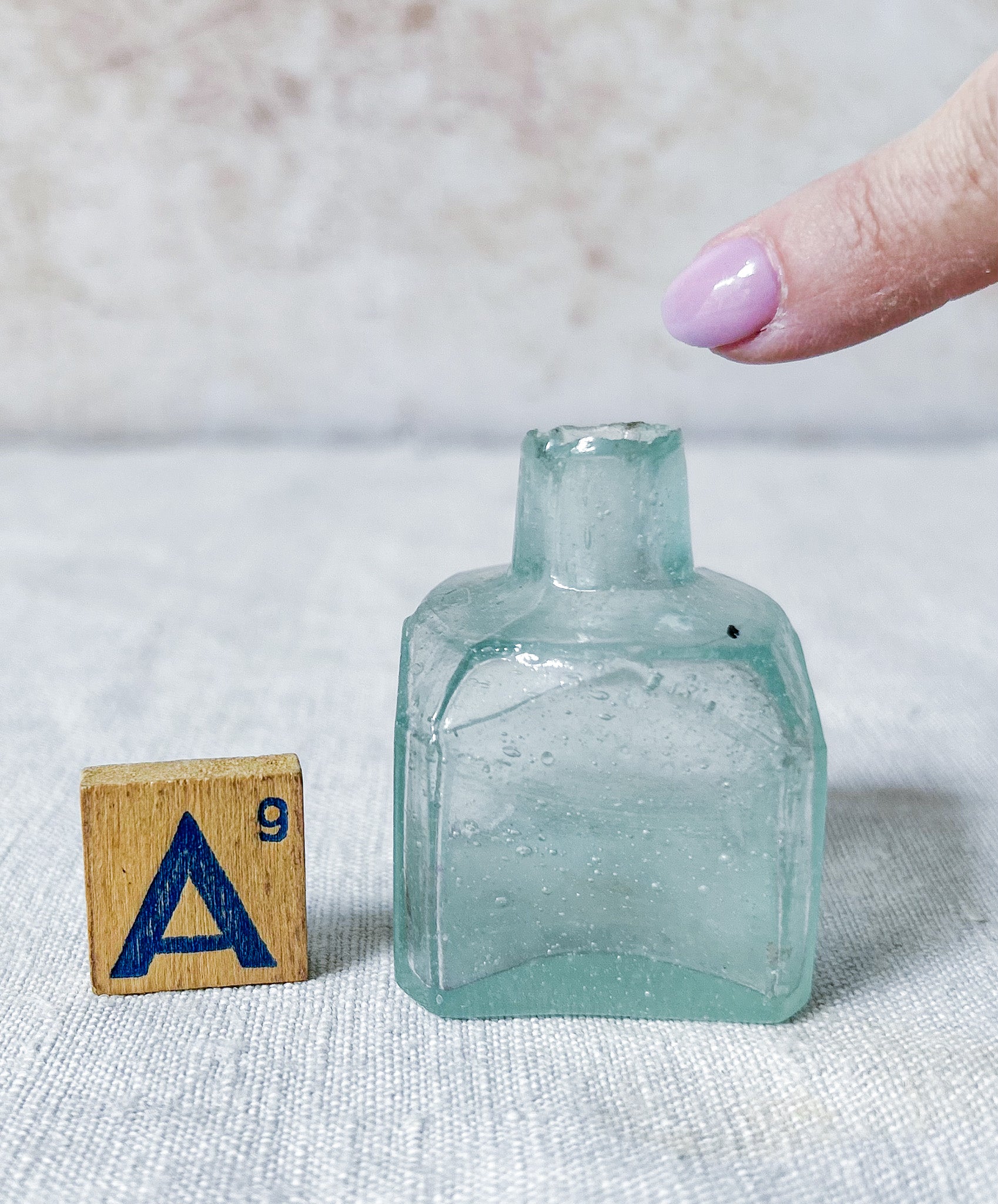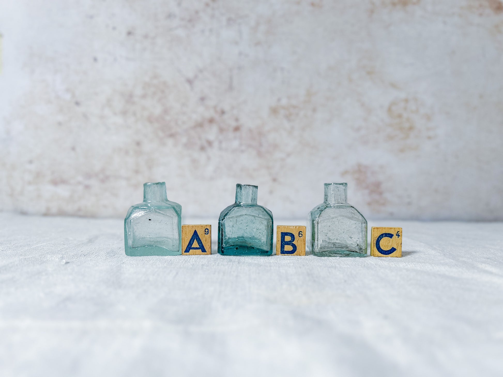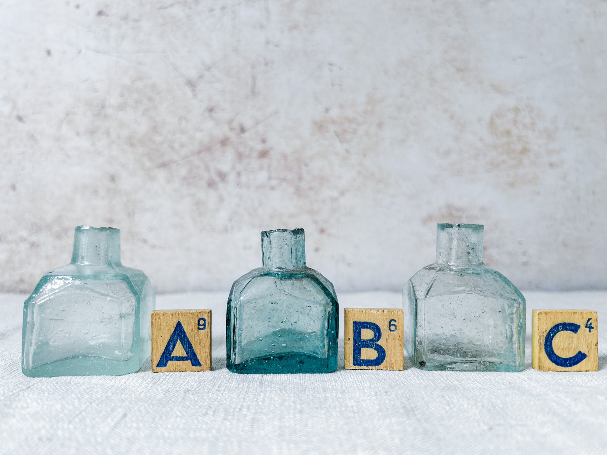 Available is your choice of antique English glass inkwells. Each one has a faceted square side and shoulders, with a sheared hand-blown top. Attractive colors of aqua glass, similar to sea-glass tones of turquoise and blue-green.