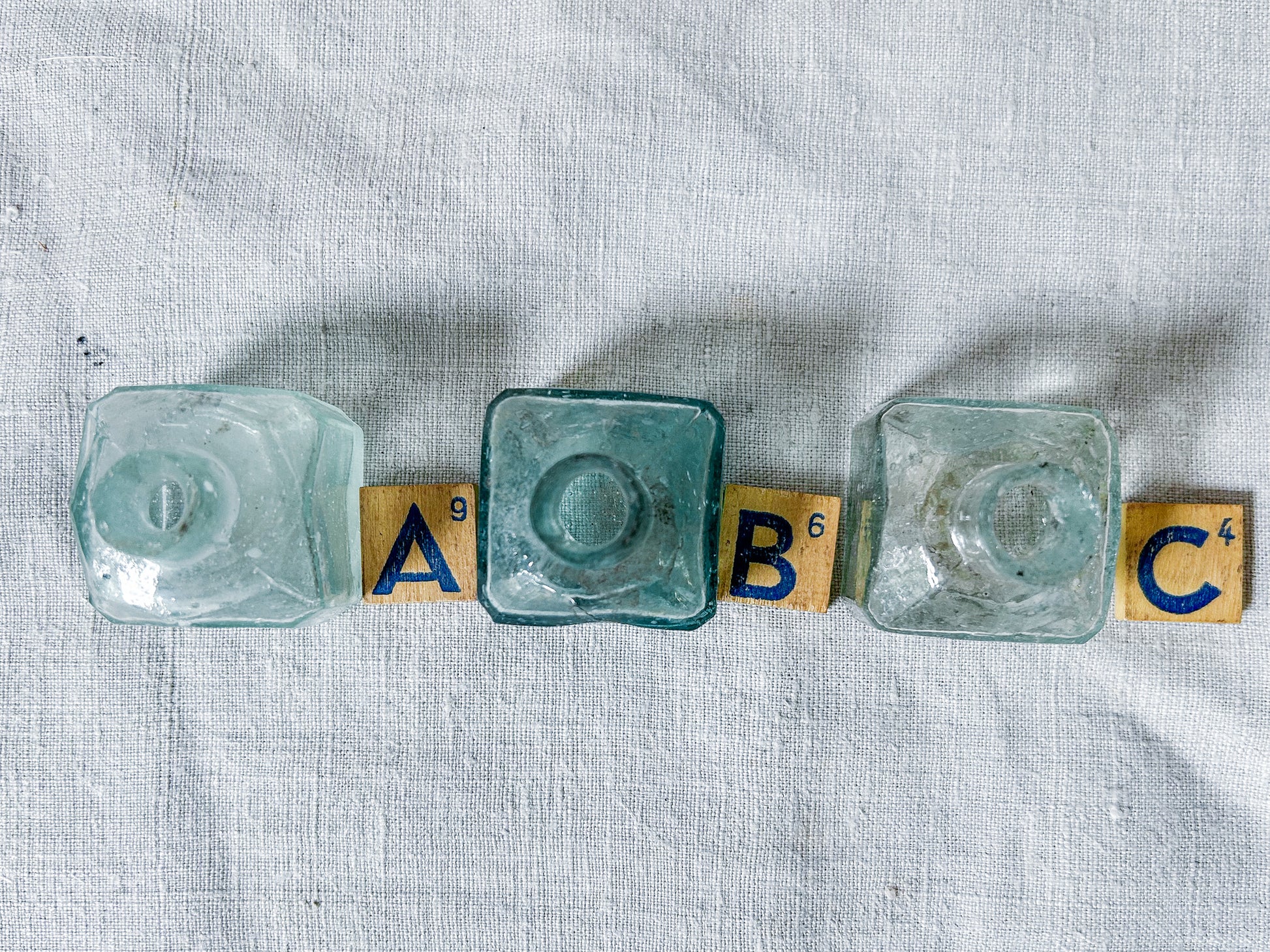 These were salvaged from a Victorian dump site in England. Penny inkwells were mass produced and sold cheaply, and as they were one-time use products, they were often chucked out after they were emptied.