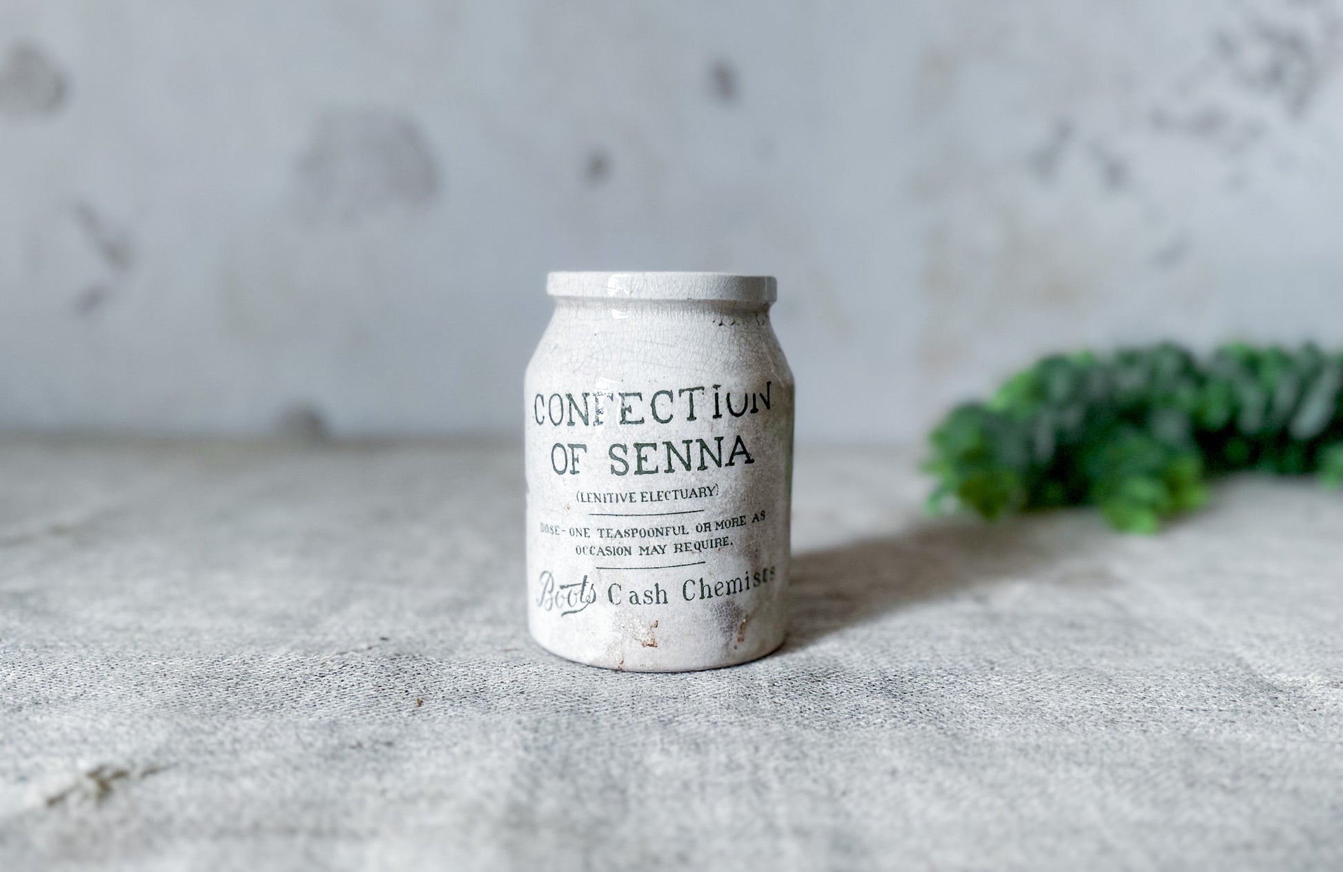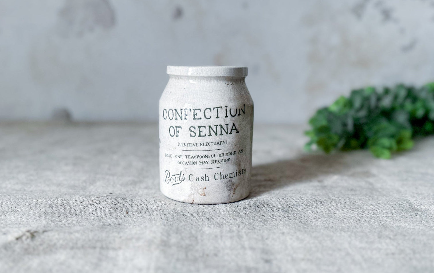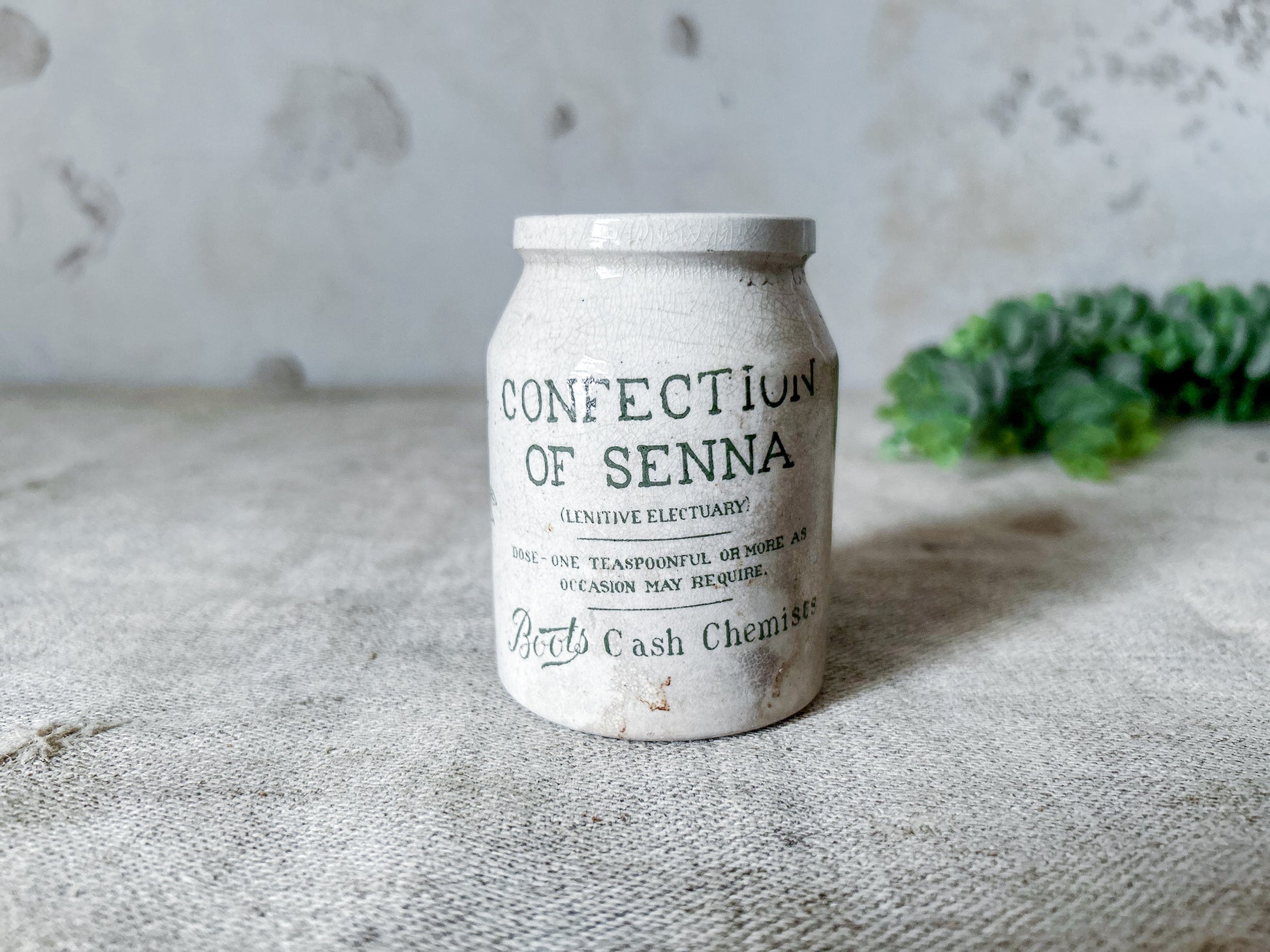 Available is an antique pharmaceutical stoneware jar from Boot's Chemist, England. The jar has green print that reads "Confection of Senna, Boot's Cash Chemist", a detailed leaf, and further details on the maker and contents.