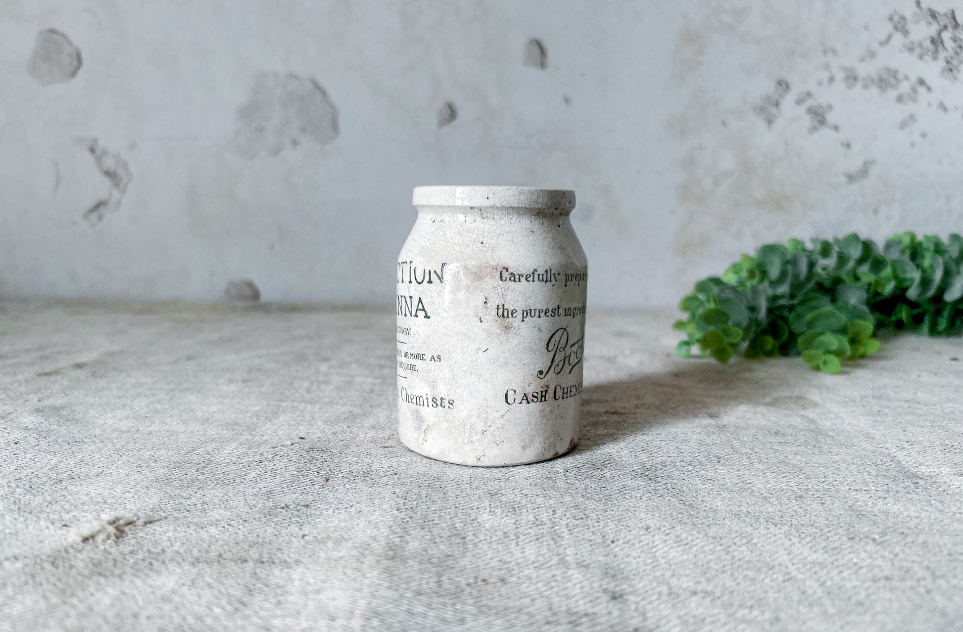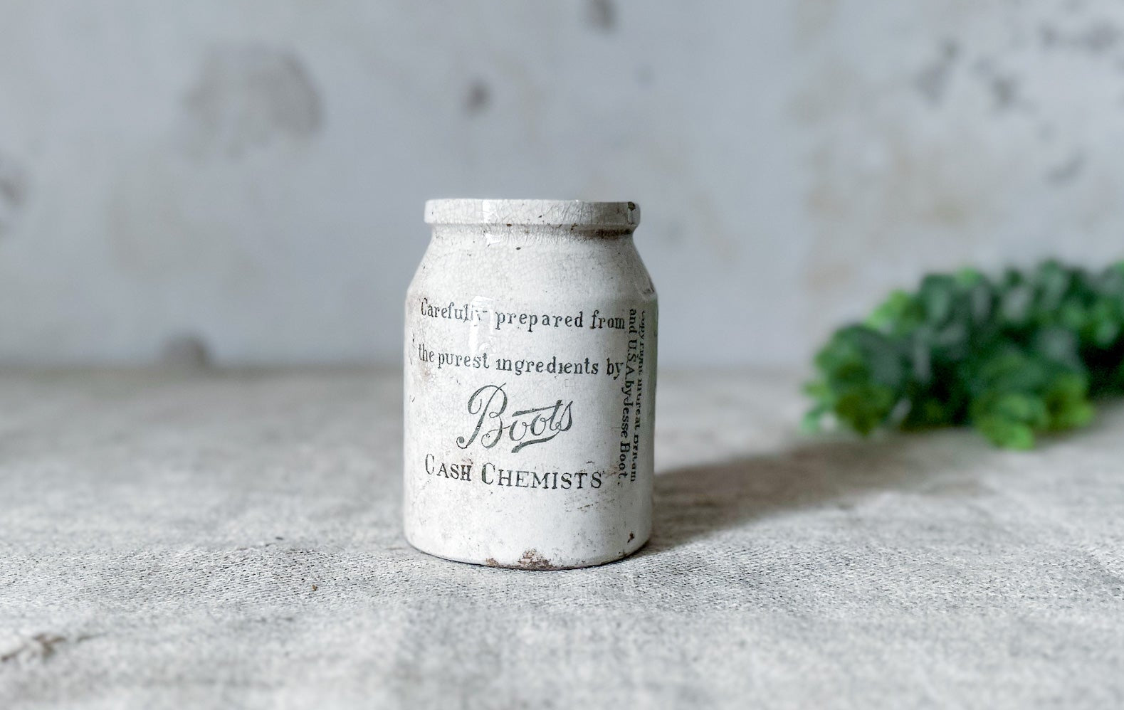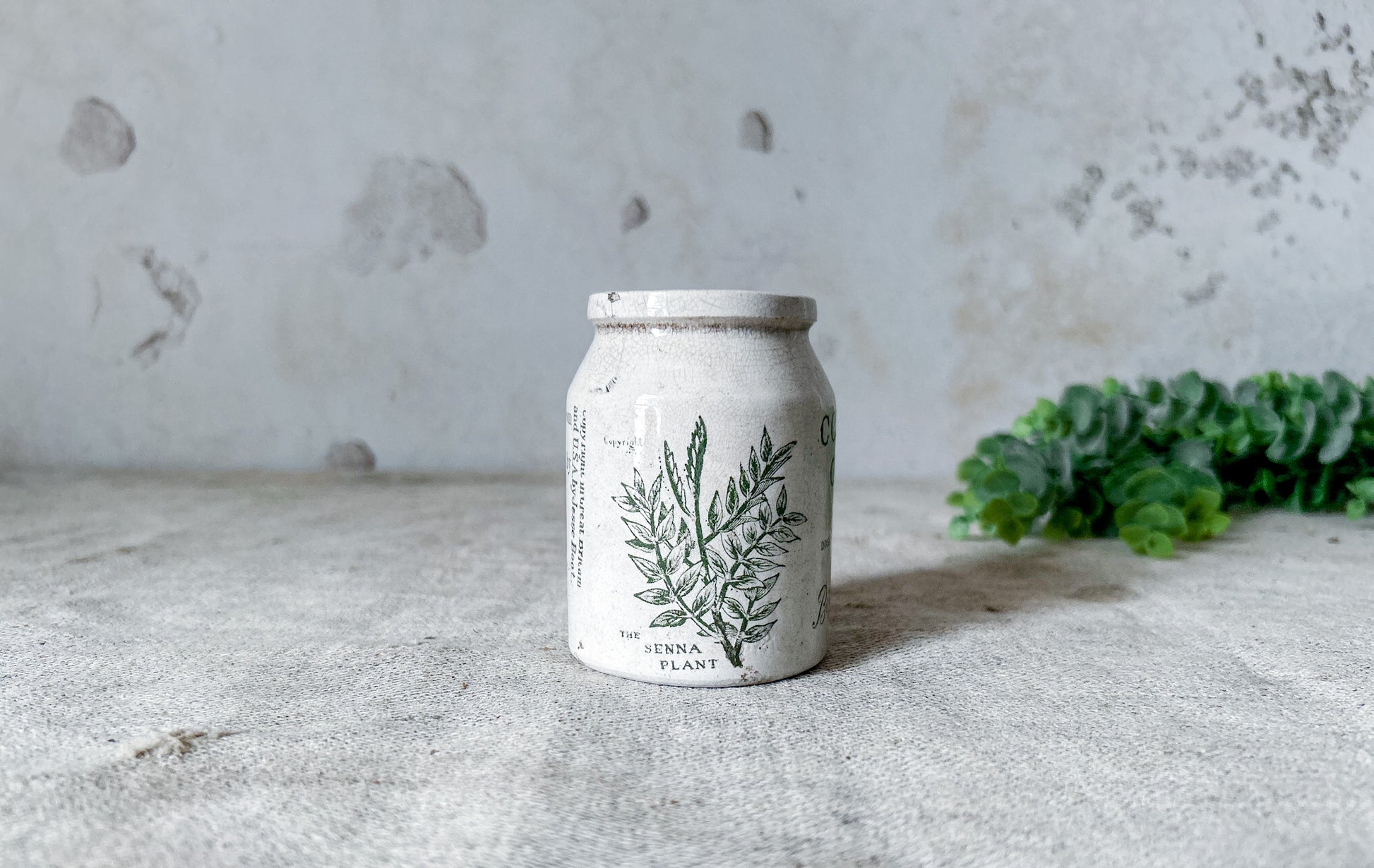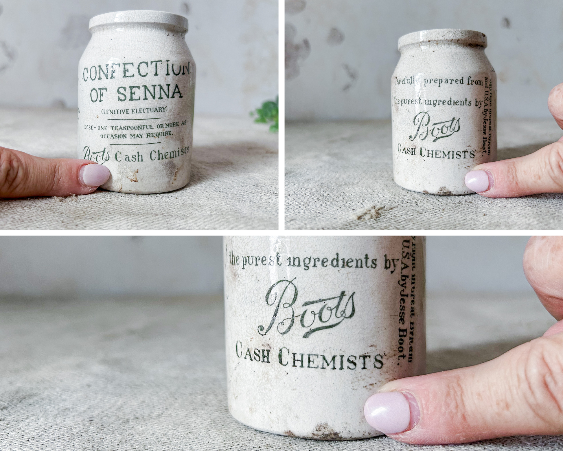 Available is an antique pharmaceutical stoneware jar from Boot's Chemist, England. The jar has green print that reads "Confection of Senna, Boot's Cash Chemist", a detailed leaf, and further details on the maker and contents.