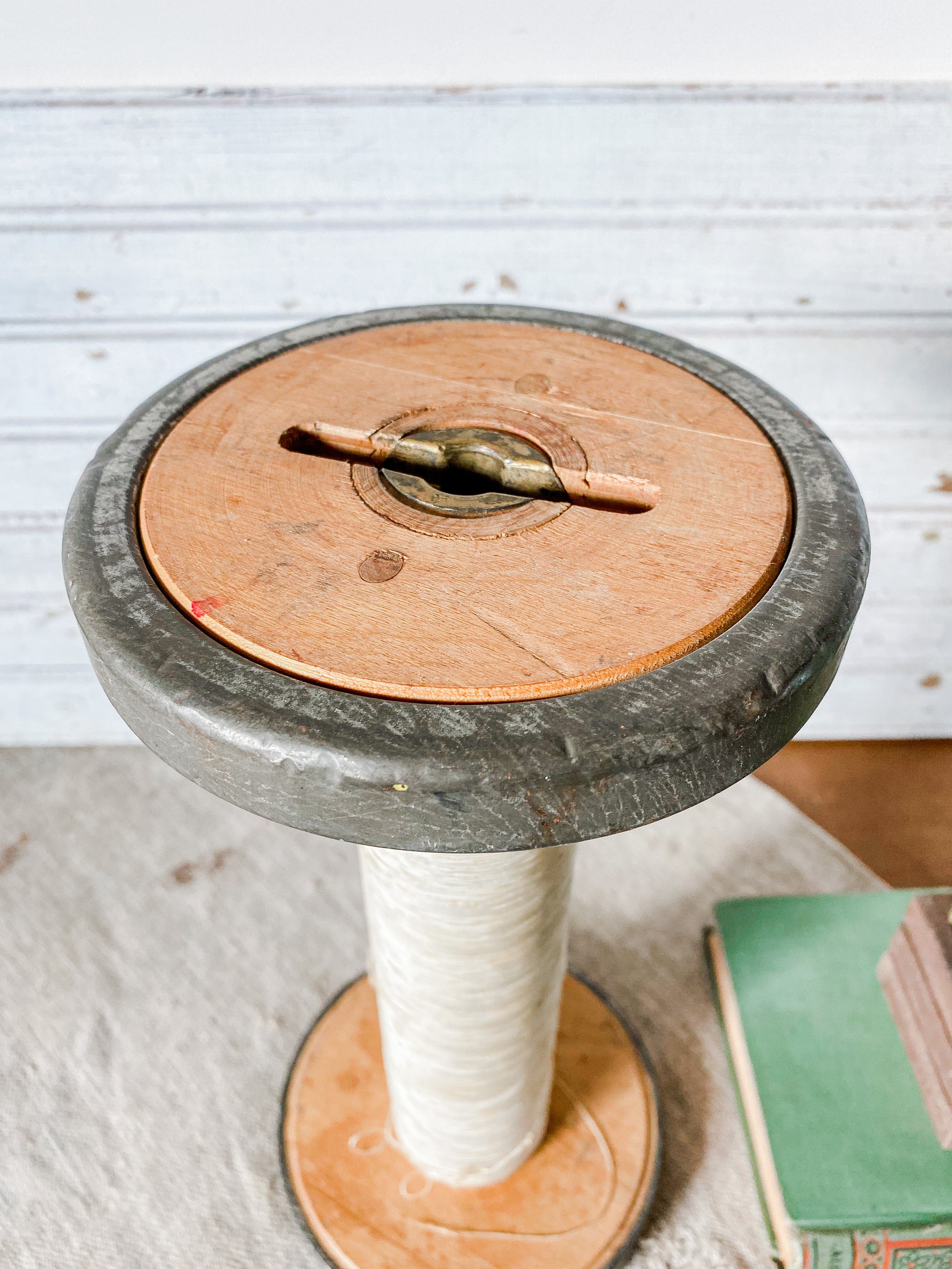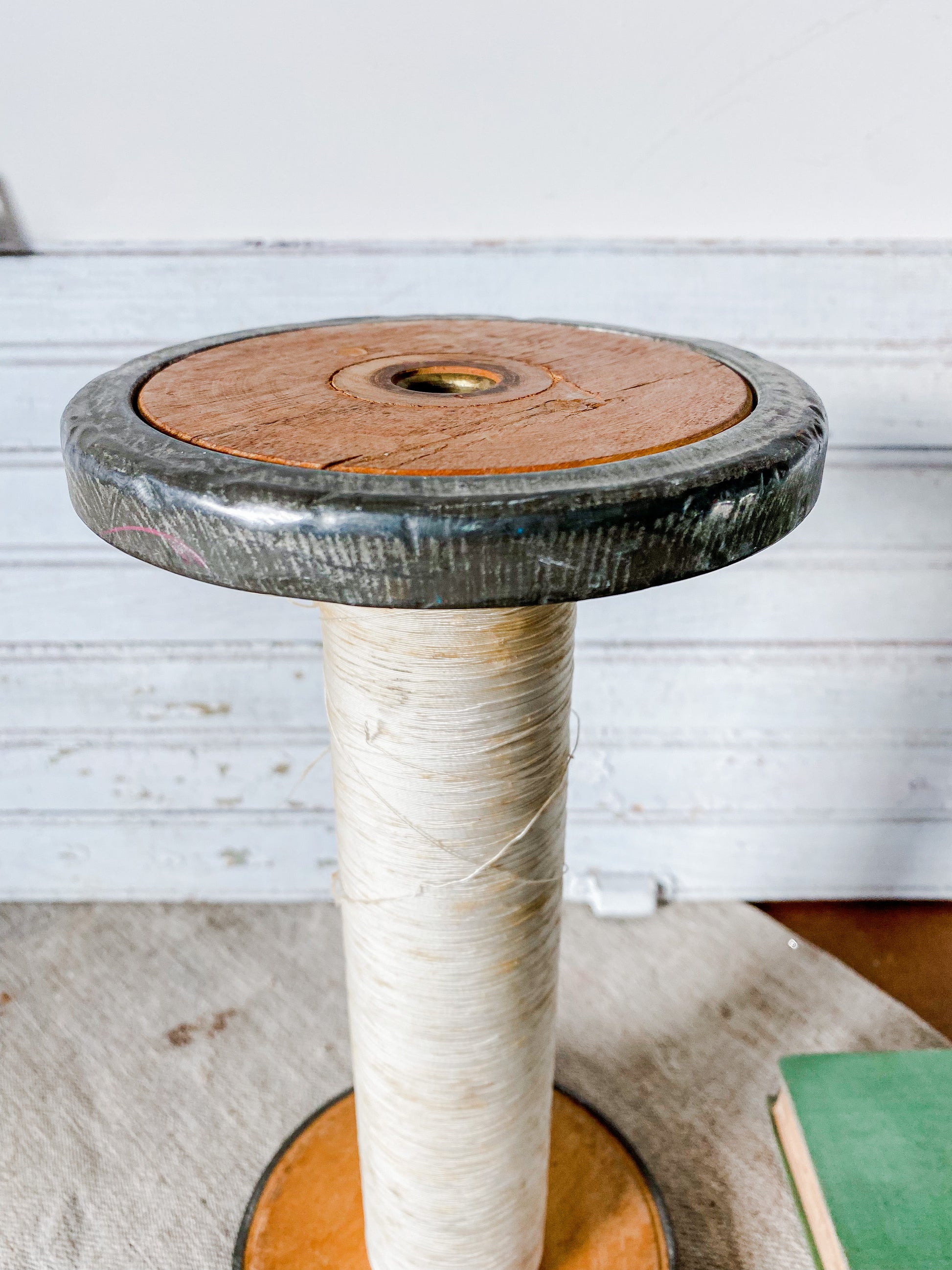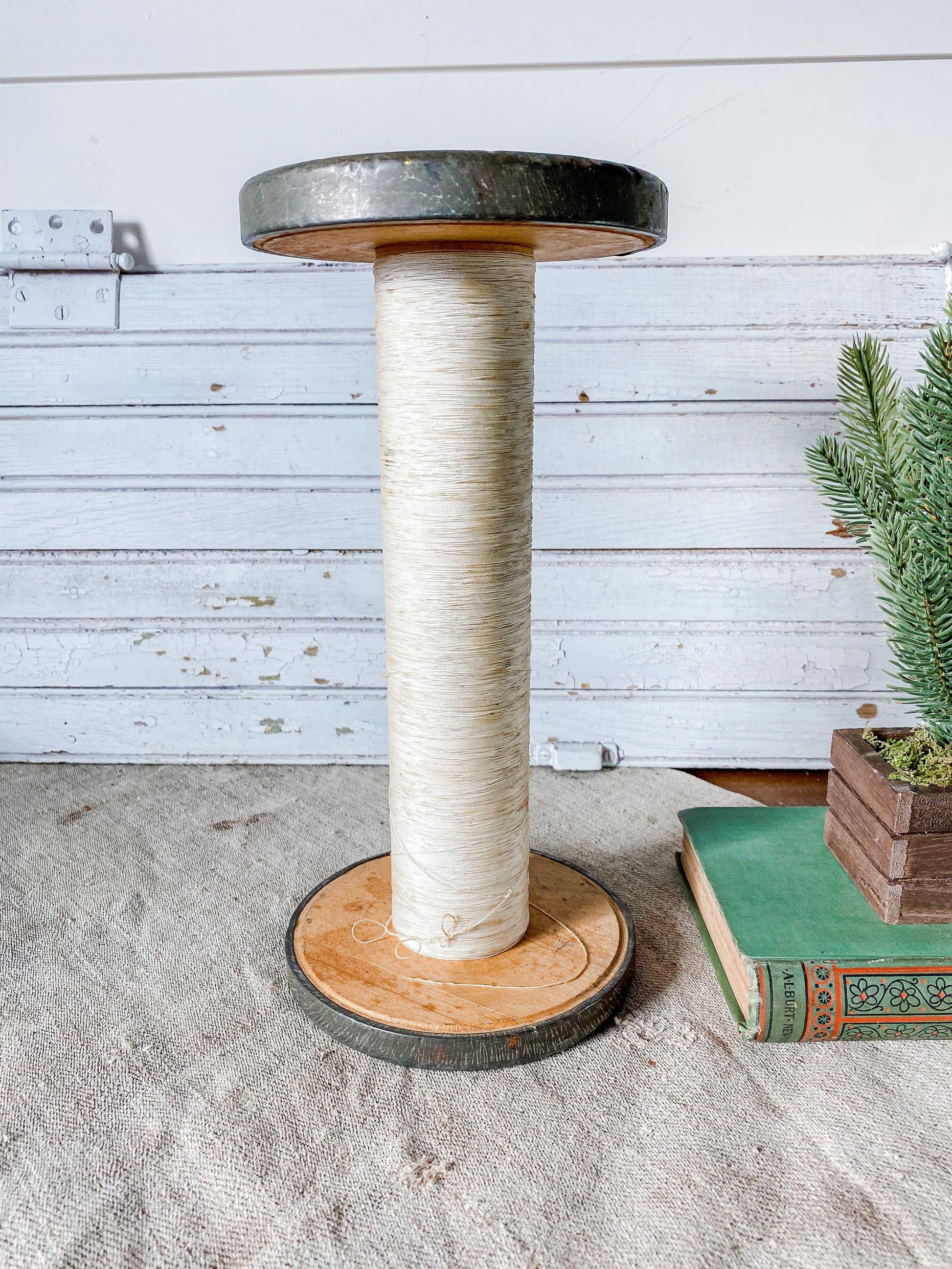Available is an amazing vintage industrial thread spool with thread still in place. This tall spool works great as a riser in a vintage display and also looks wonderful grouped in a spool or bobbin collection with various heights.
