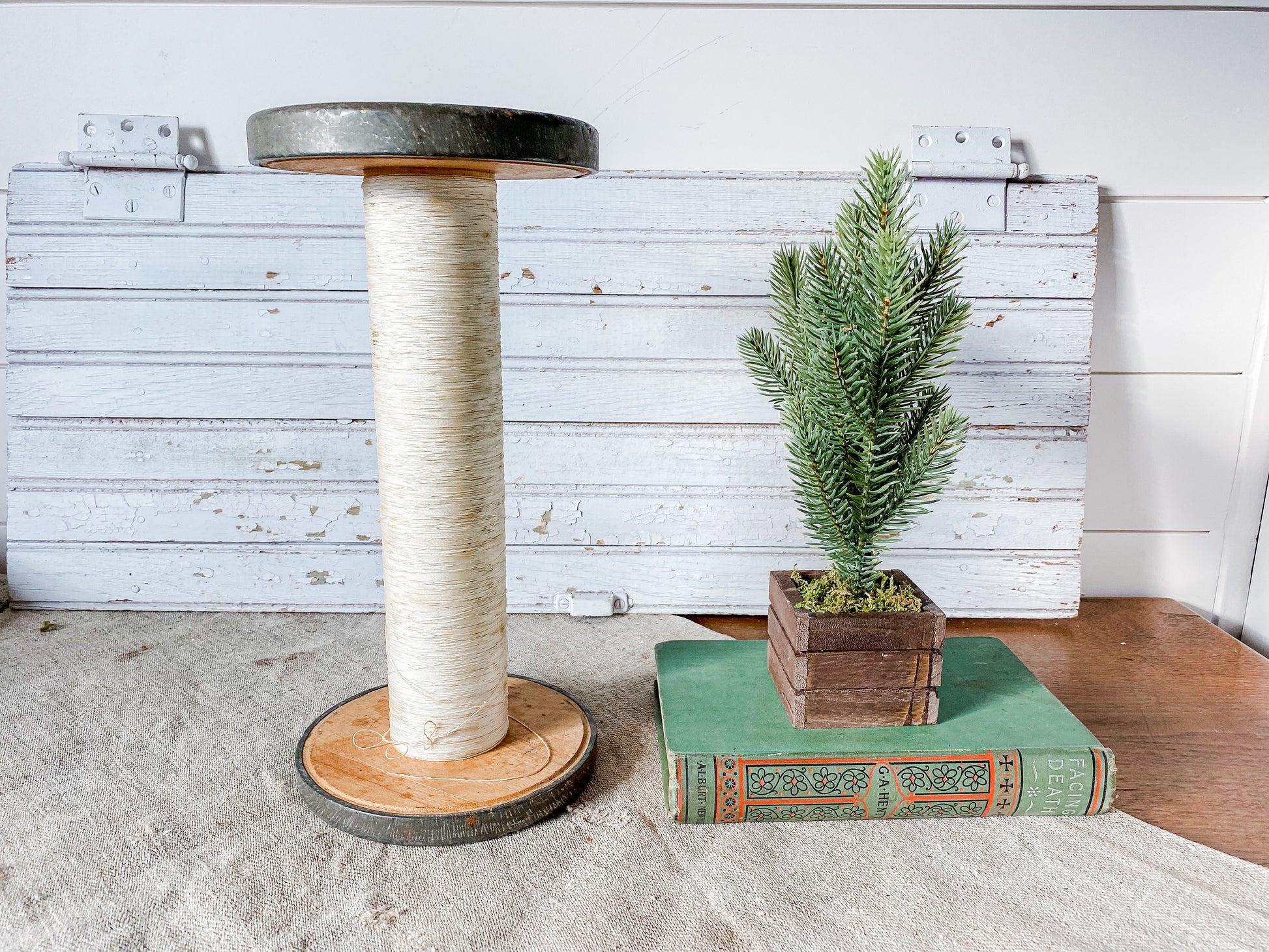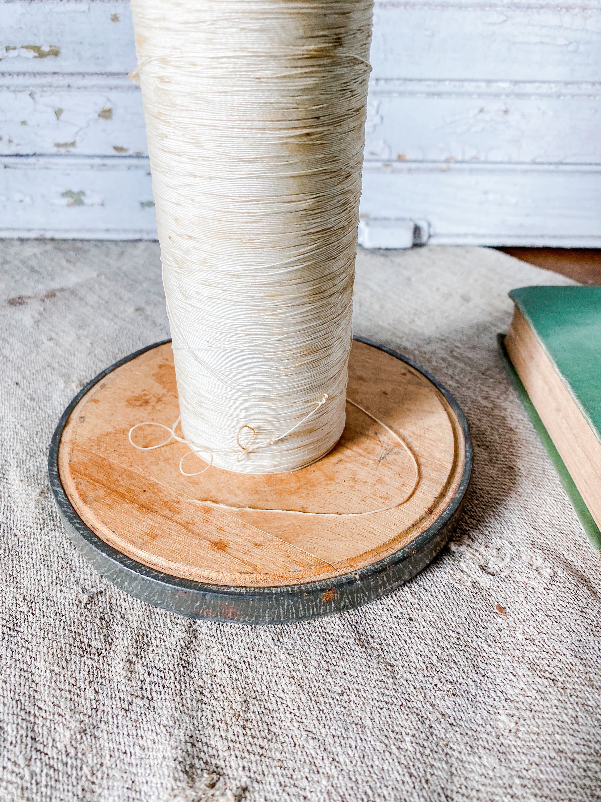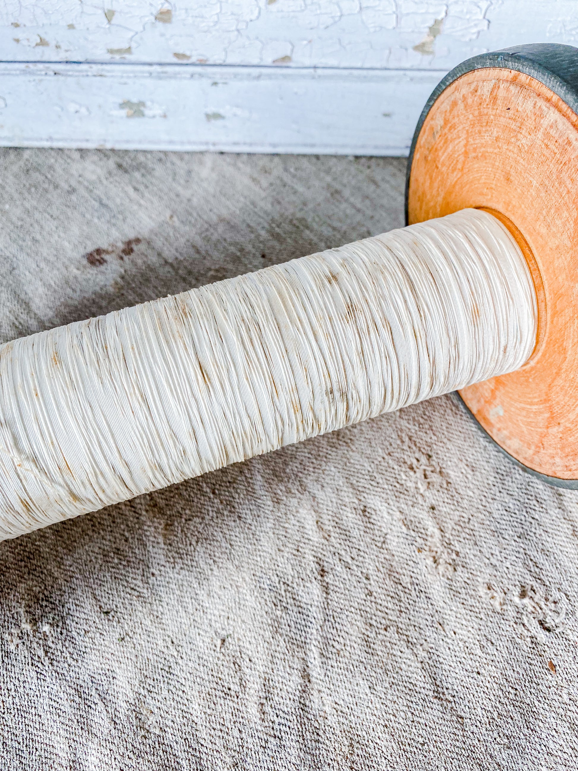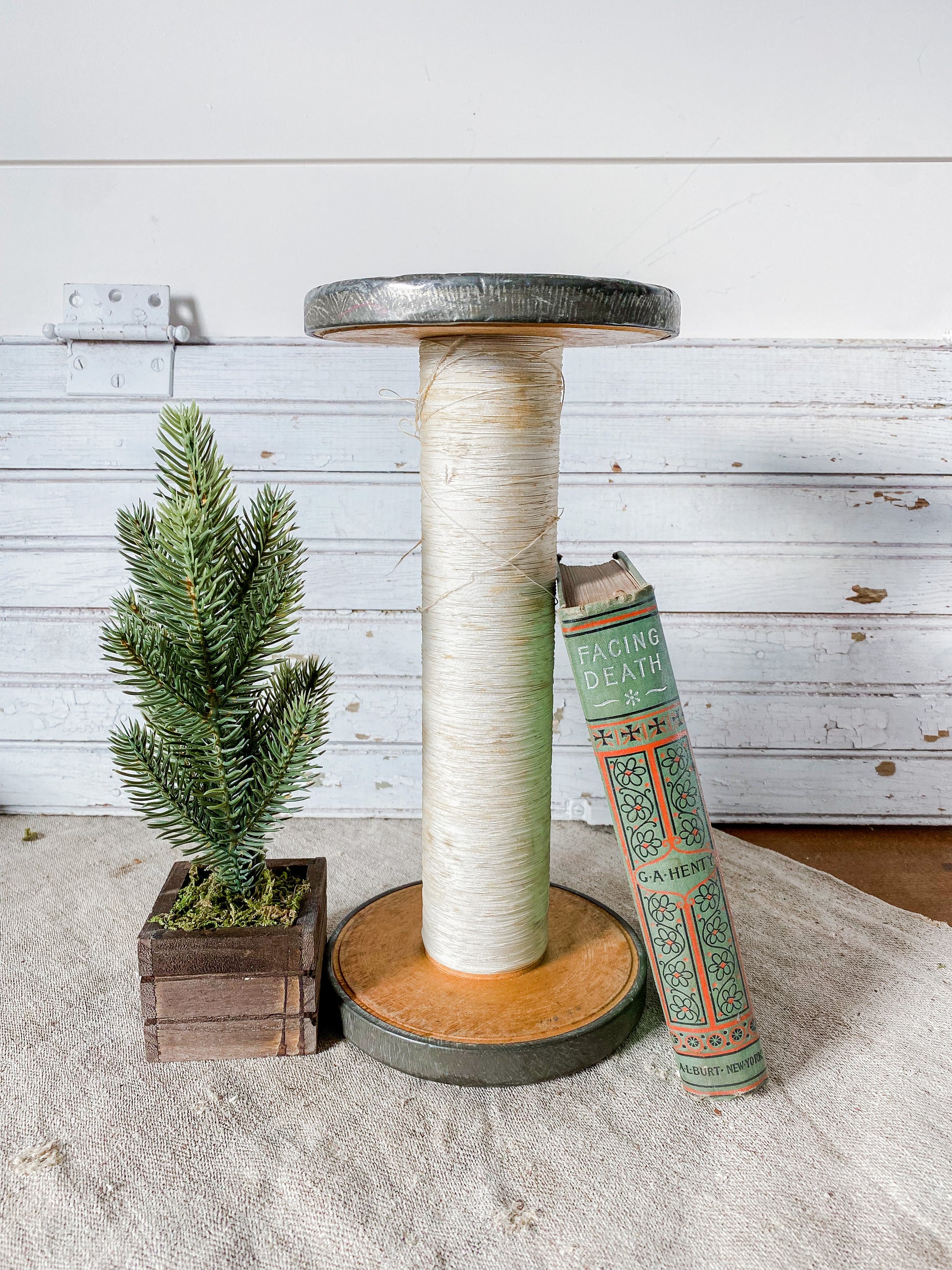 Available is an amazing vintage industrial thread spool with thread still in place. This tall spool works great as a riser in a vintage display and also looks wonderful grouped in a spool or bobbin collection with various heights.