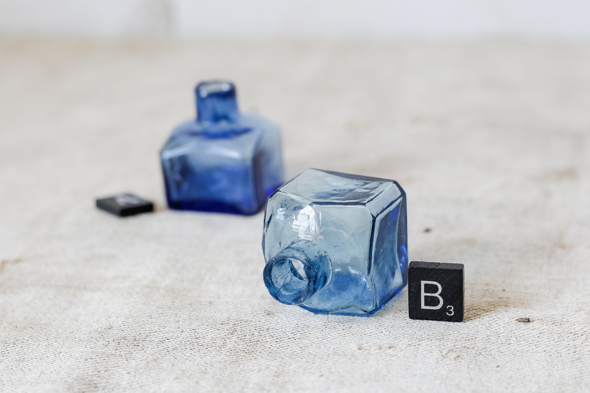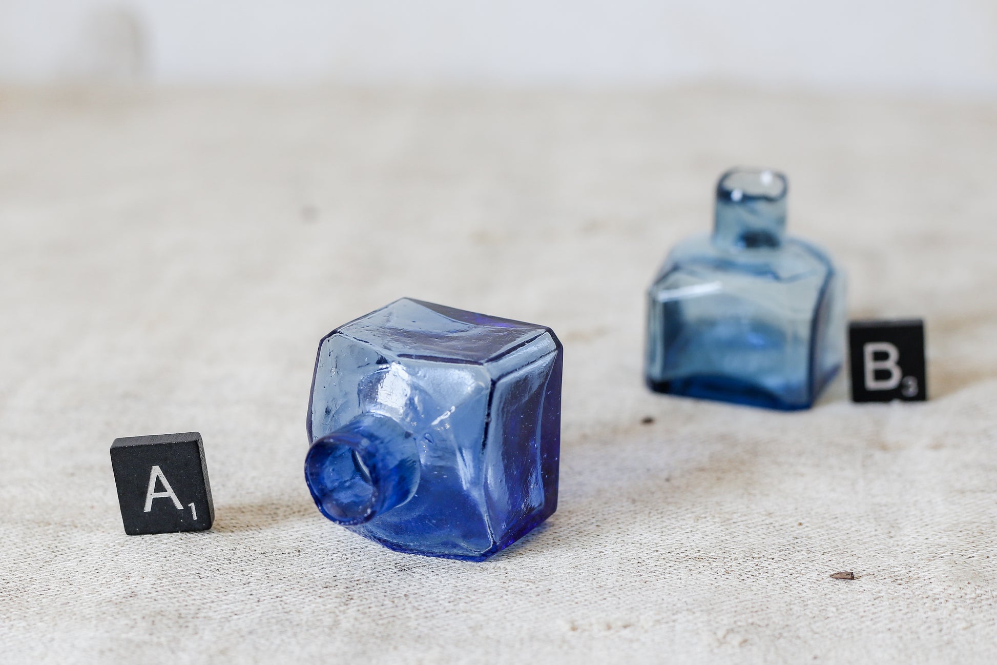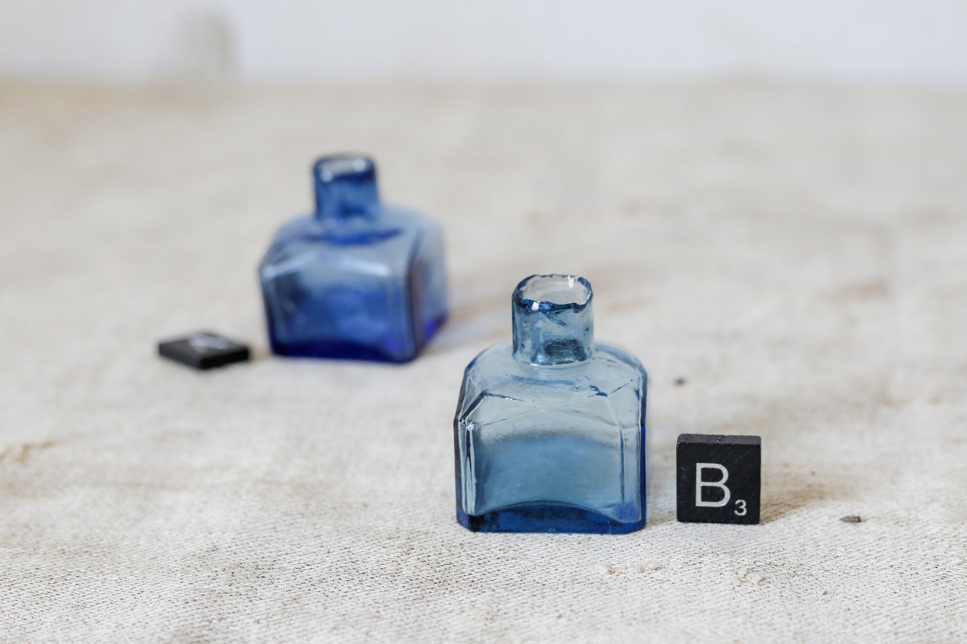Charming miniature inkwells crafted from vibrant blue glass, perfect for adding a pop of color to any desk or collection. These vintage pieces capture the elegance of classic English design, offering both beauty and functionality in a compact size.