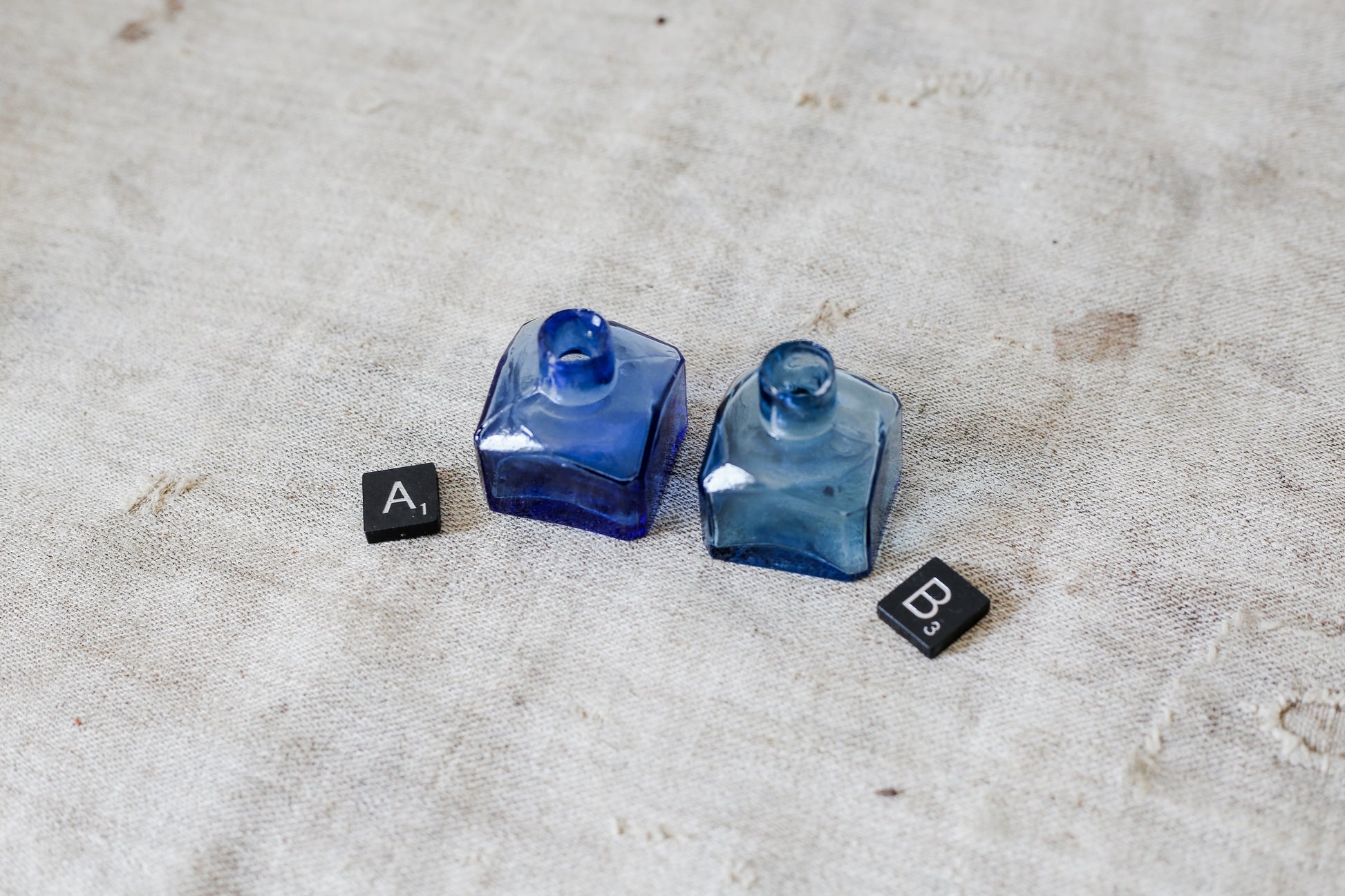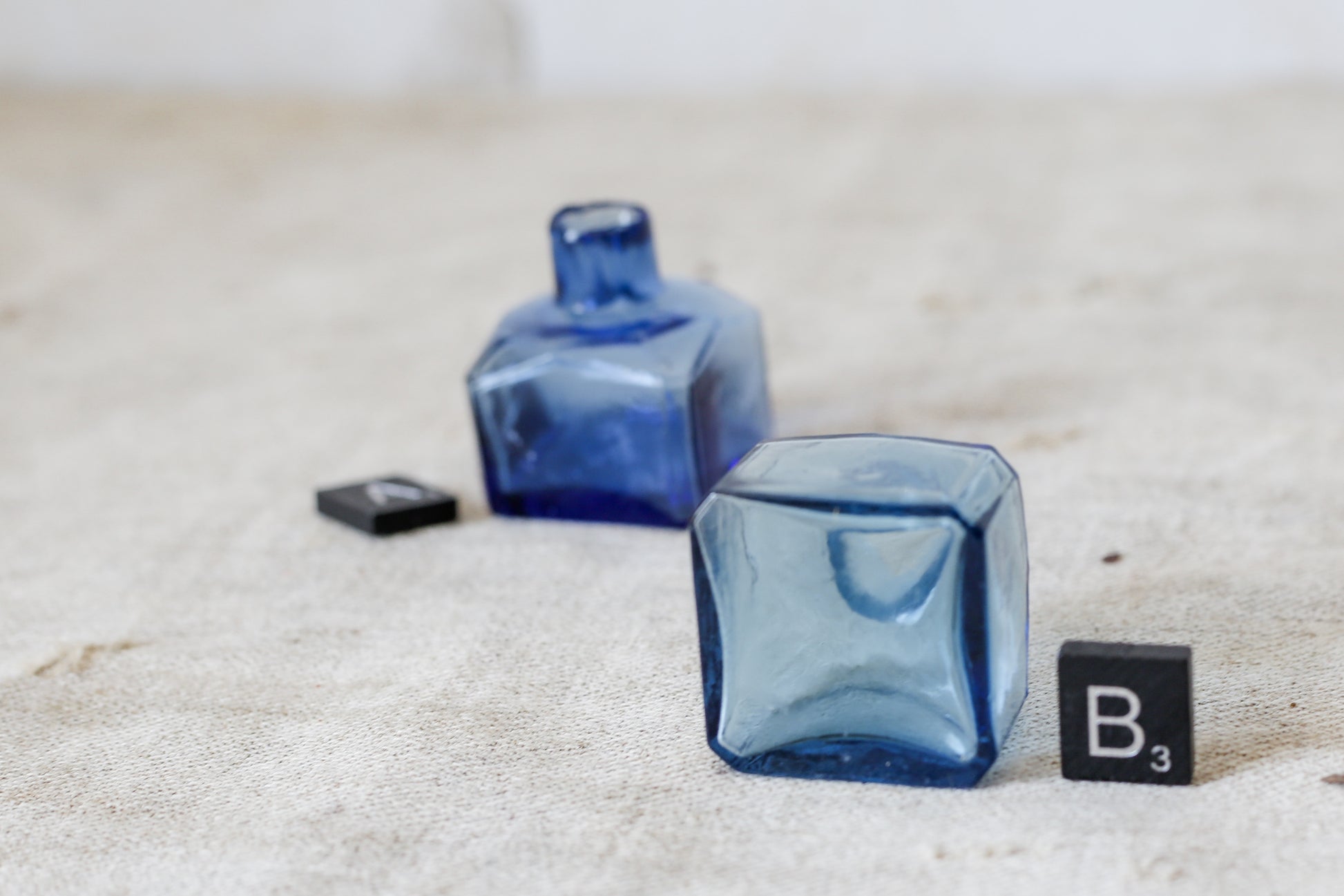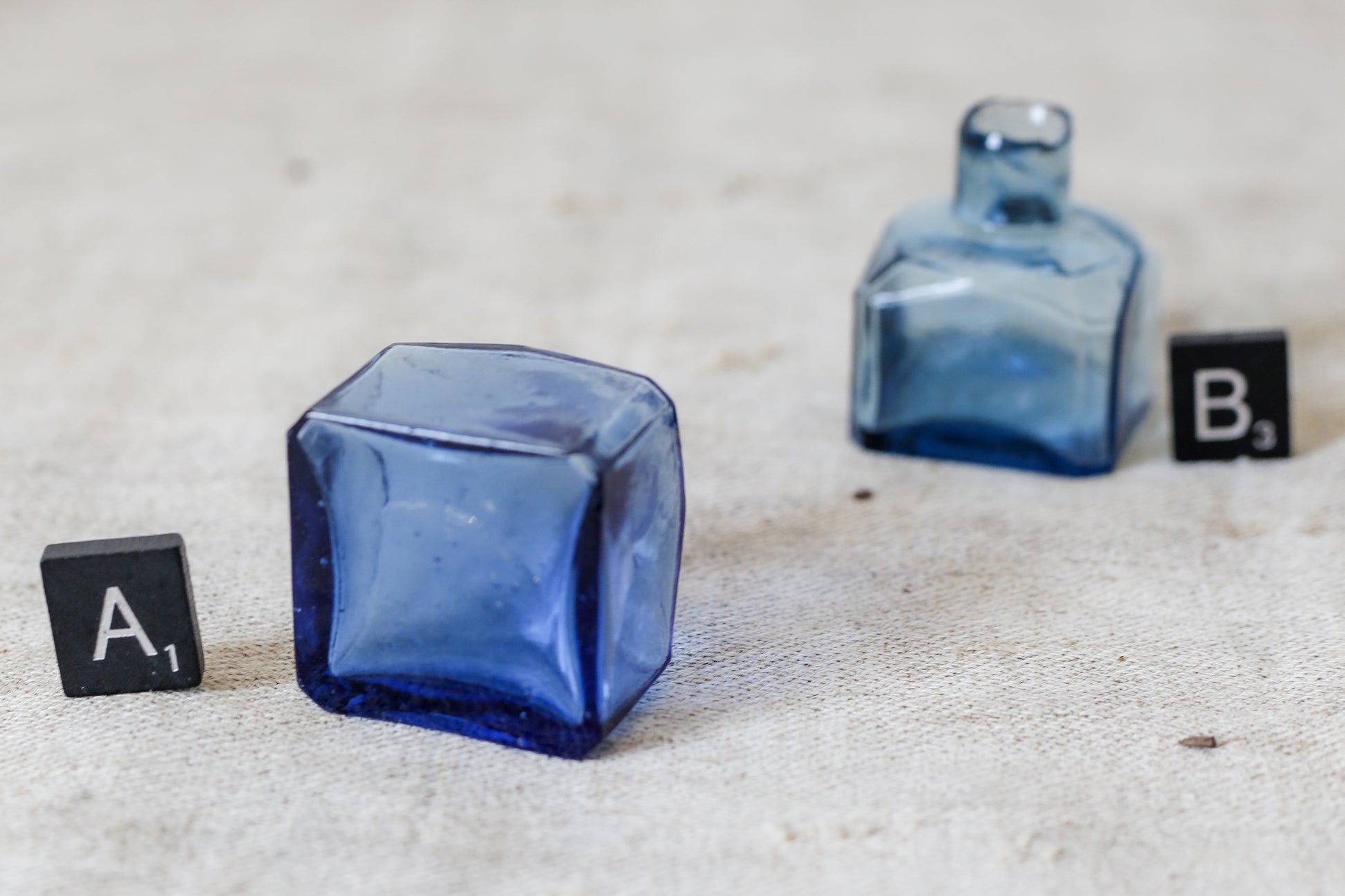 Charming miniature inkwells crafted from vibrant blue glass, perfect for adding a pop of color to any desk or collection. These vintage pieces capture the elegance of classic English design, offering both beauty and functionality in a compact size.