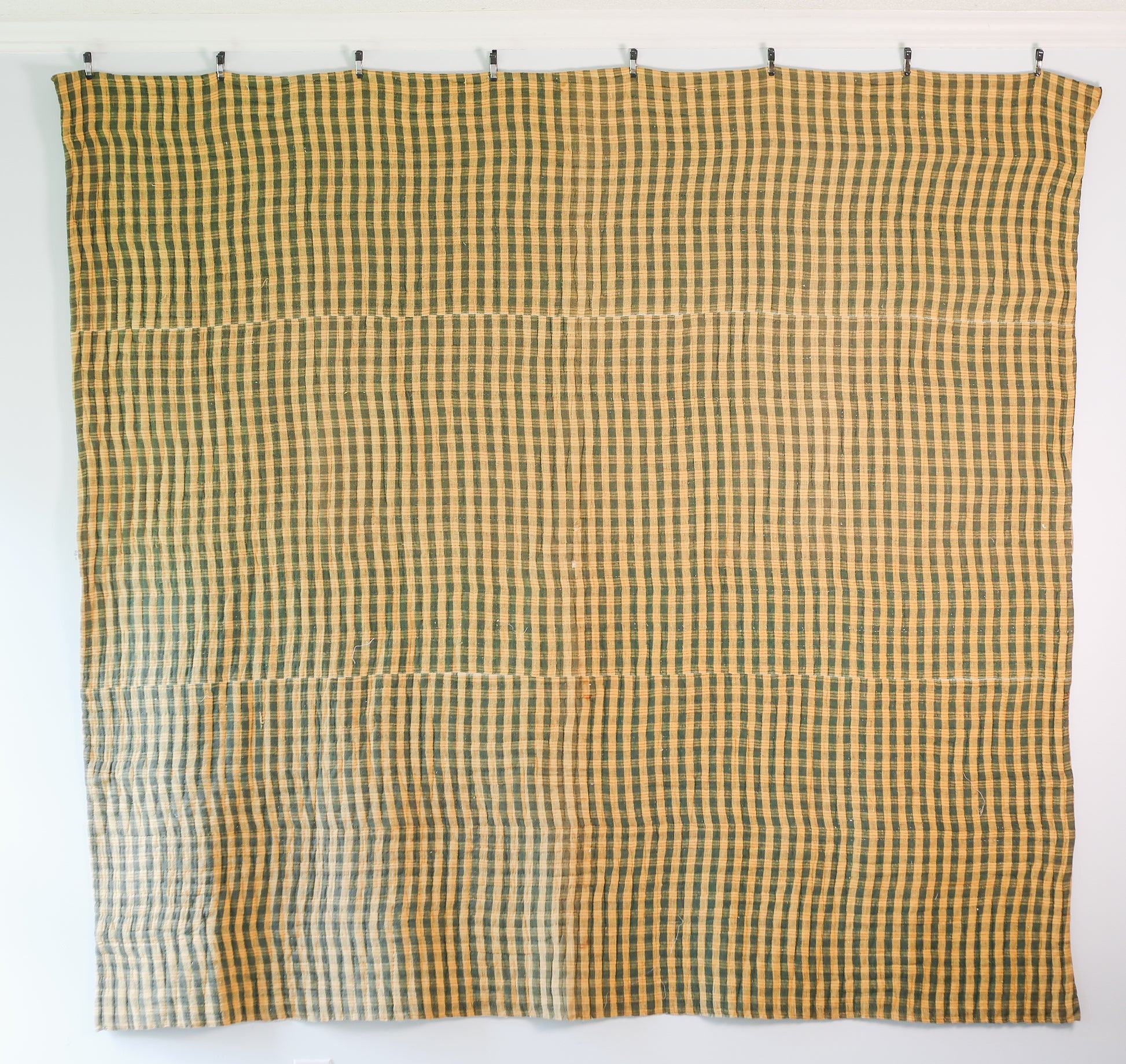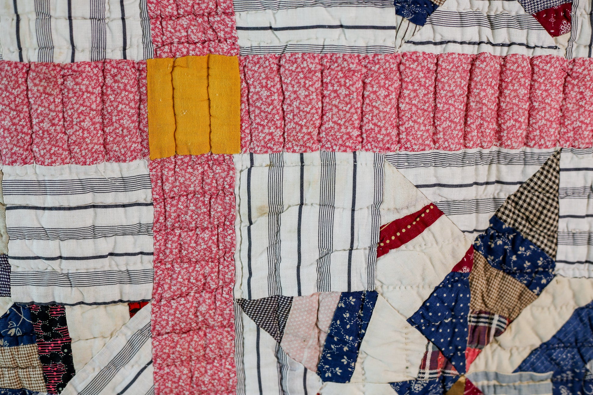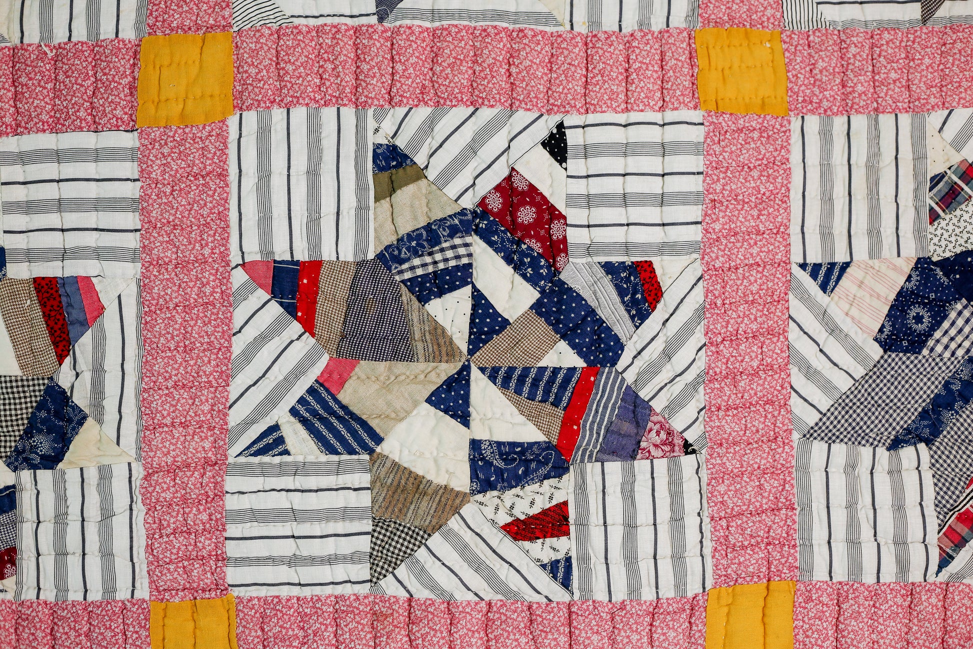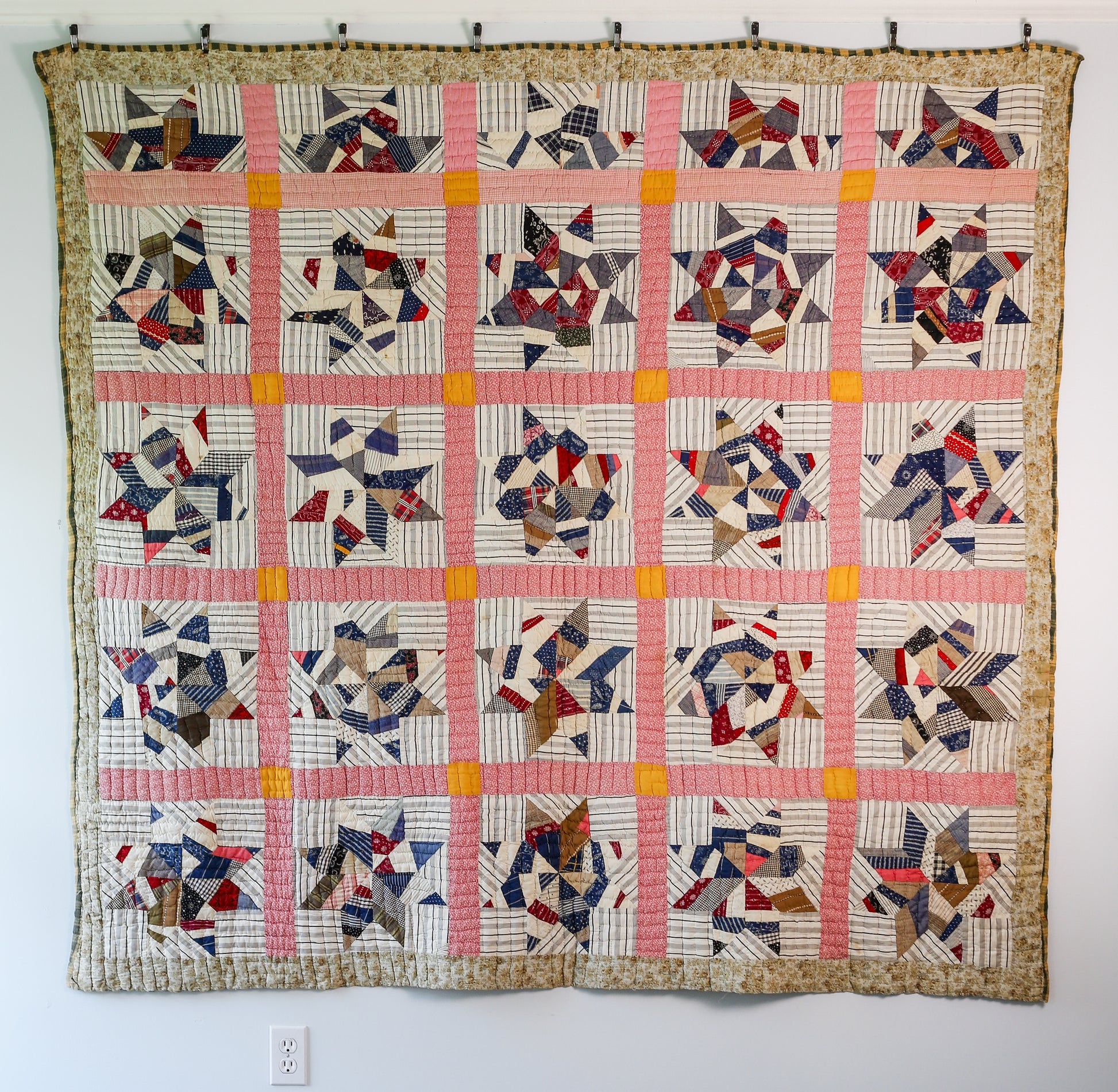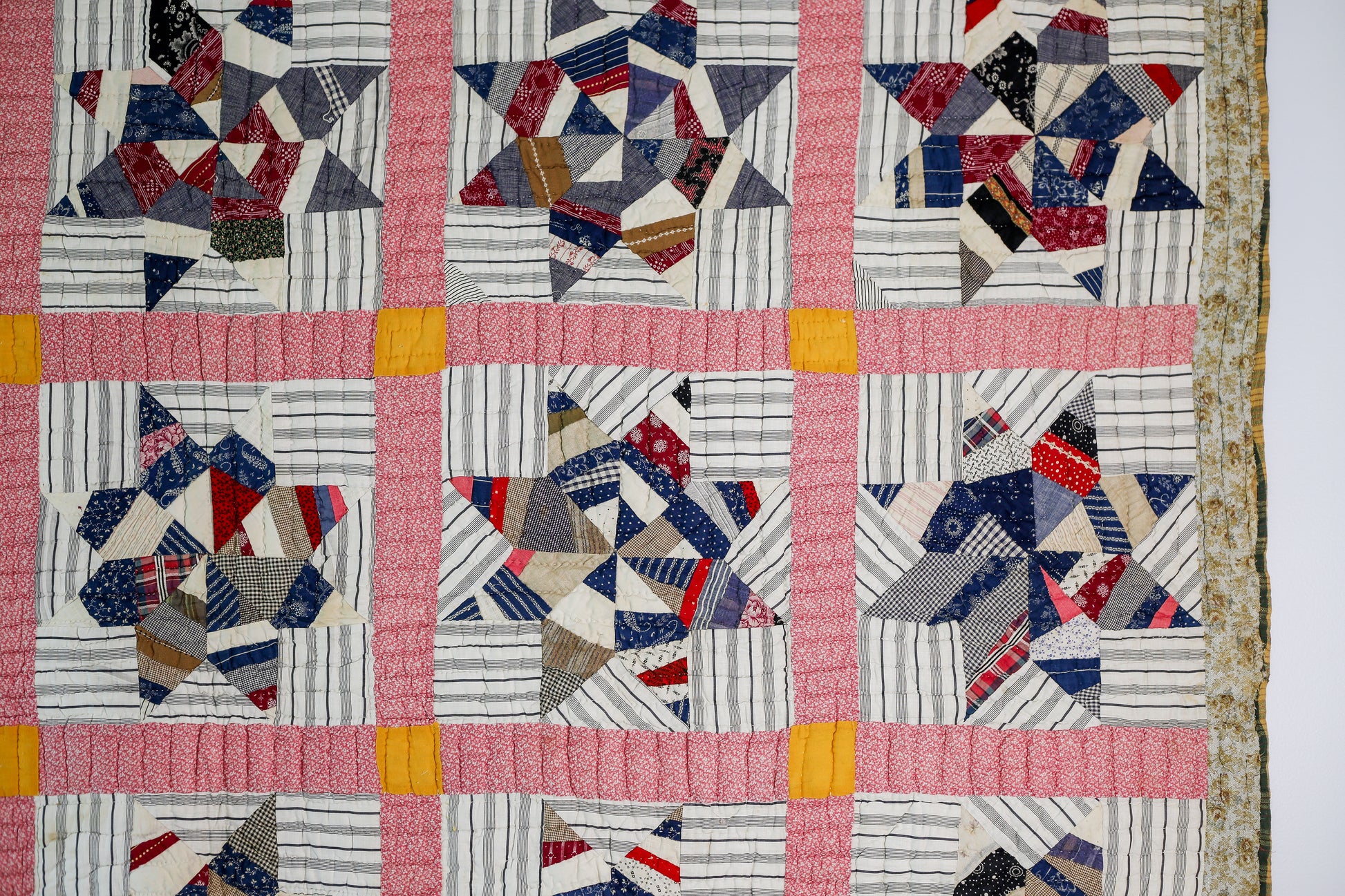 The quilt is in a String Star pattern, with eight-point stars made of scrappy strips of fabric. They are set in black and white shirting fabrics, with double pink sashing and cheddar setting blocks. The top and bottom borders have a strip of floral flannel. The backing is lovely homespun flannel in green and yellow. It is hand quilted in white thread. Bound back to front. Medium weight cotton batting.