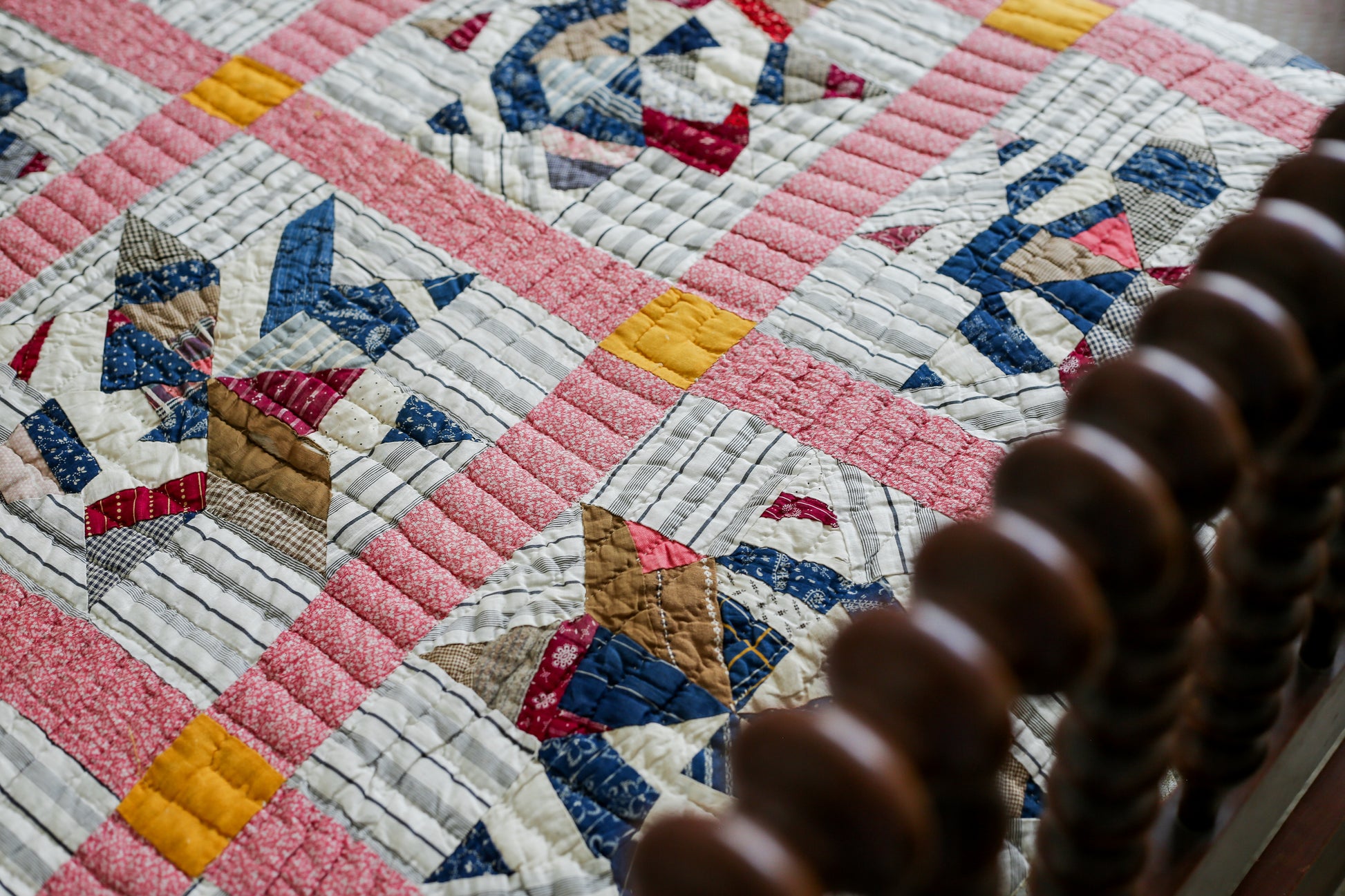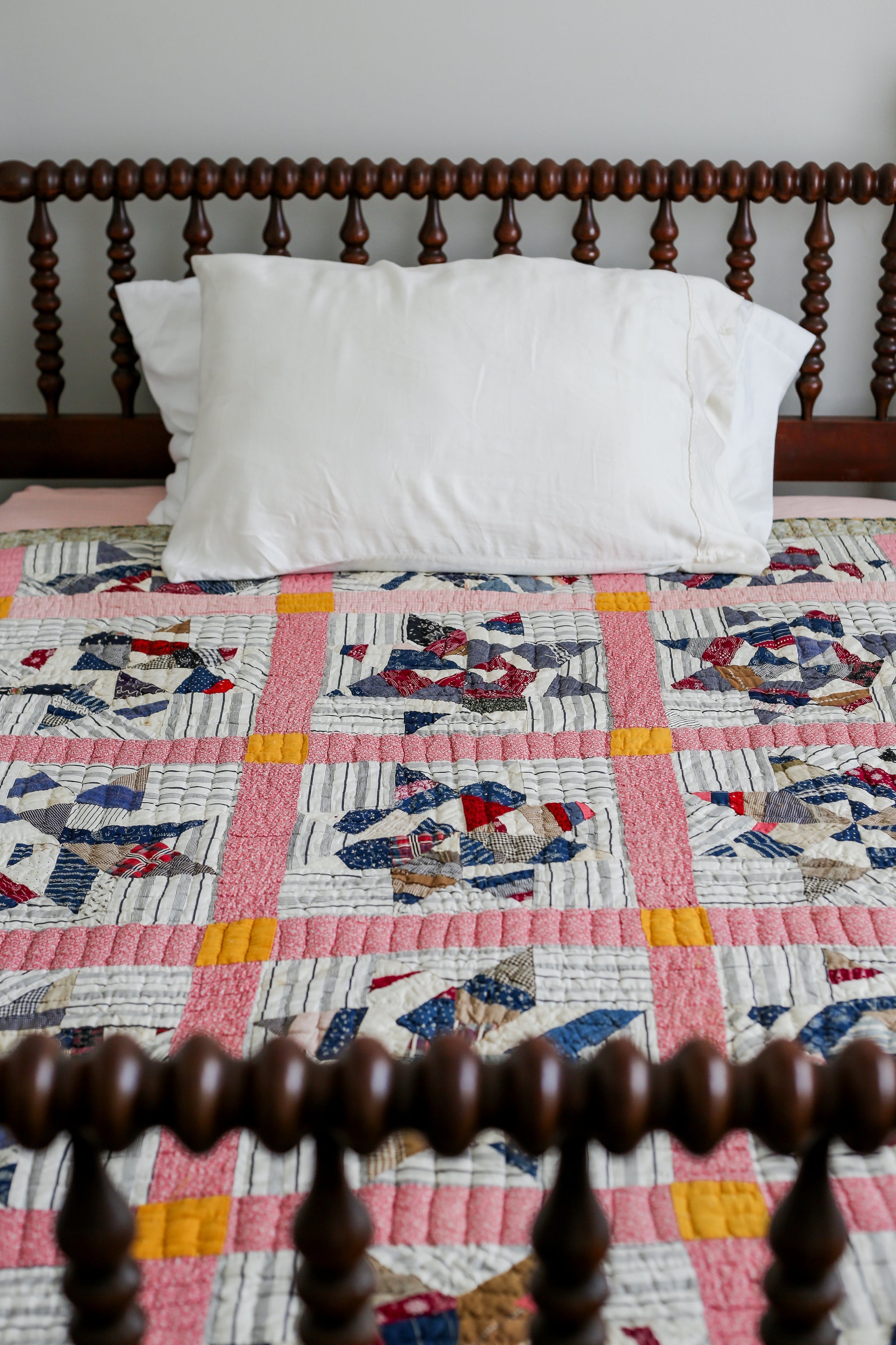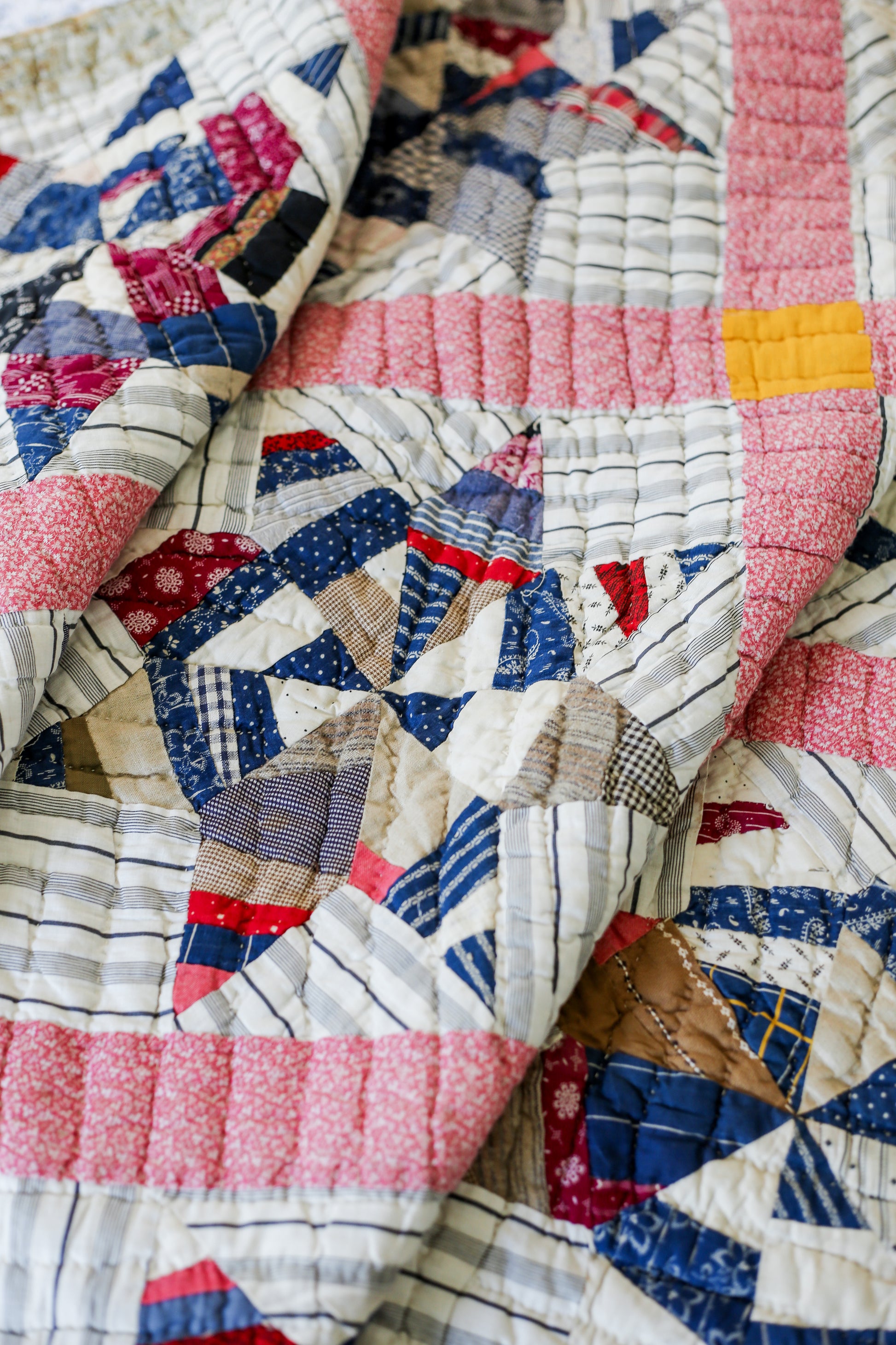 Available is the perfect farmhouse quilt for snuggling, with flannel backing and scrappy fabrics.