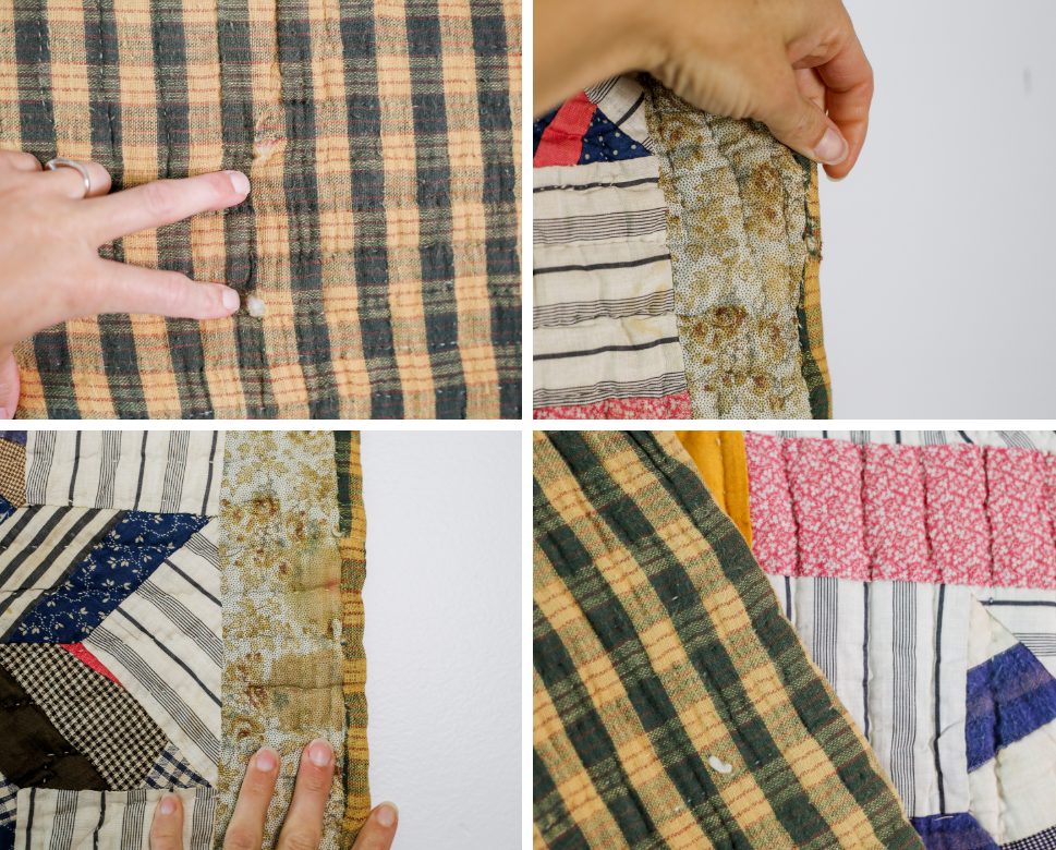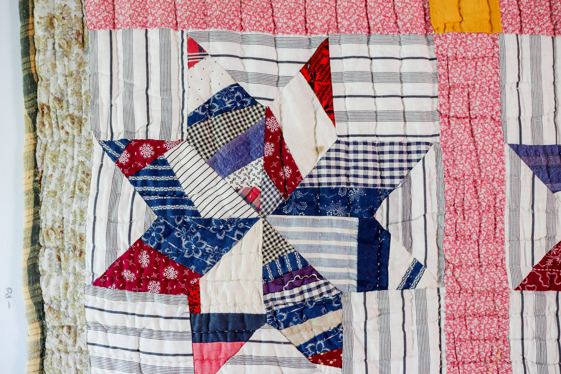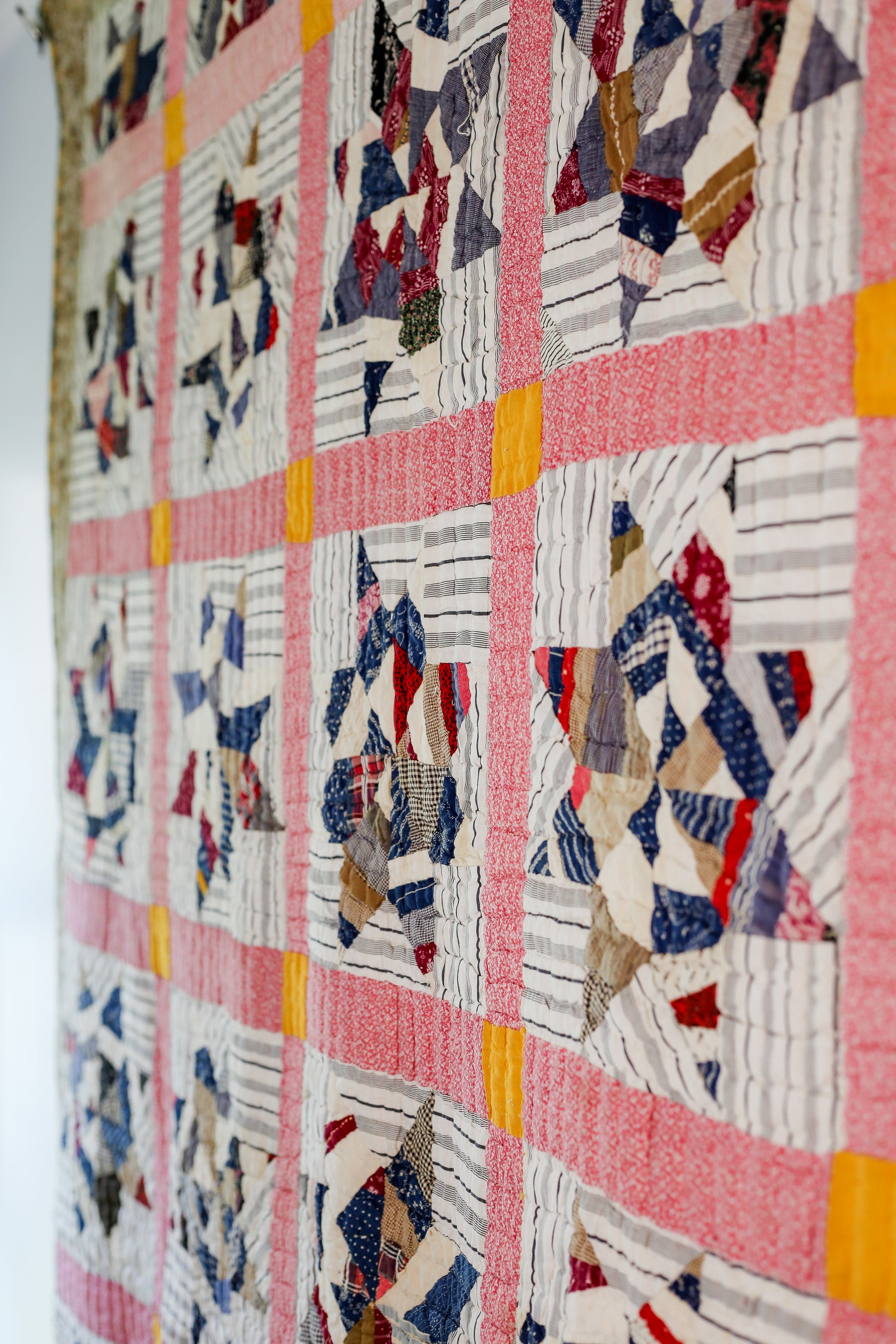 Available is the perfect farmhouse quilt for snuggling, with flannel backing and scrappy fabrics.