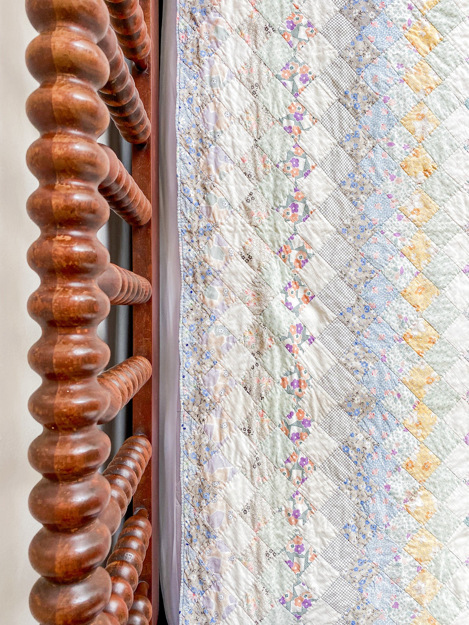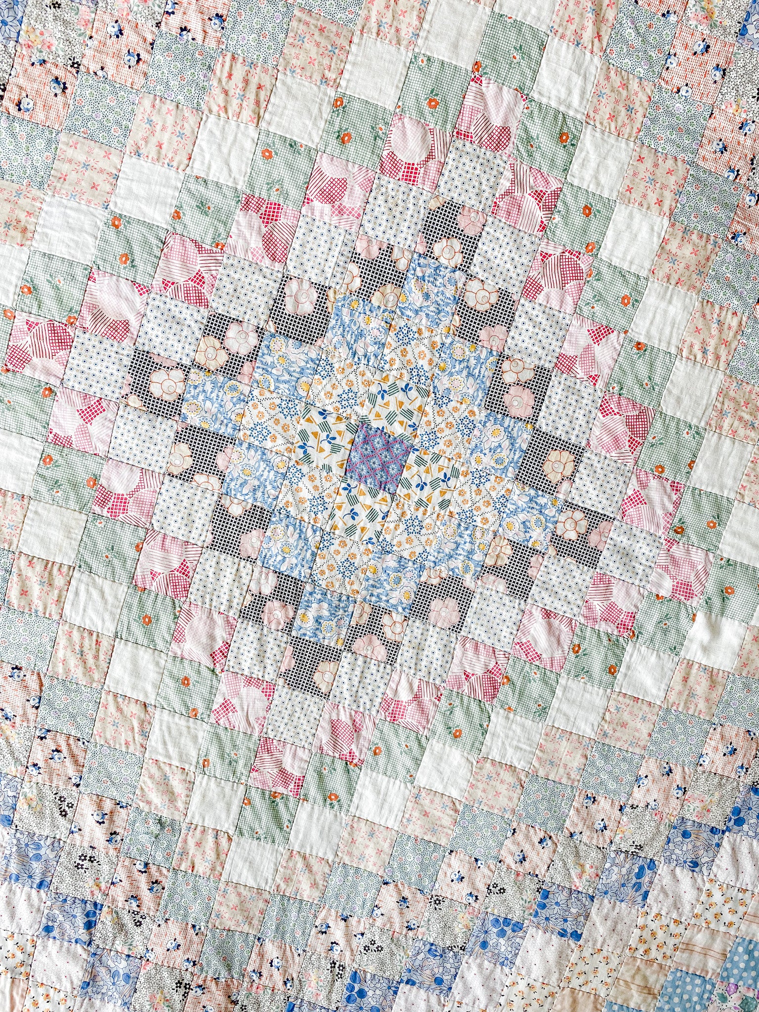 The quilt is in the Around the World pattern, with squares on point set in concentric bands of alternating light and dark printed fabric. The fabrics are all printed fabrics with small printed florals. The quilt has a thin flannel sheet batting, which makes this a summer weight blanket. Backing is printed floral fabric. Hand quilted.