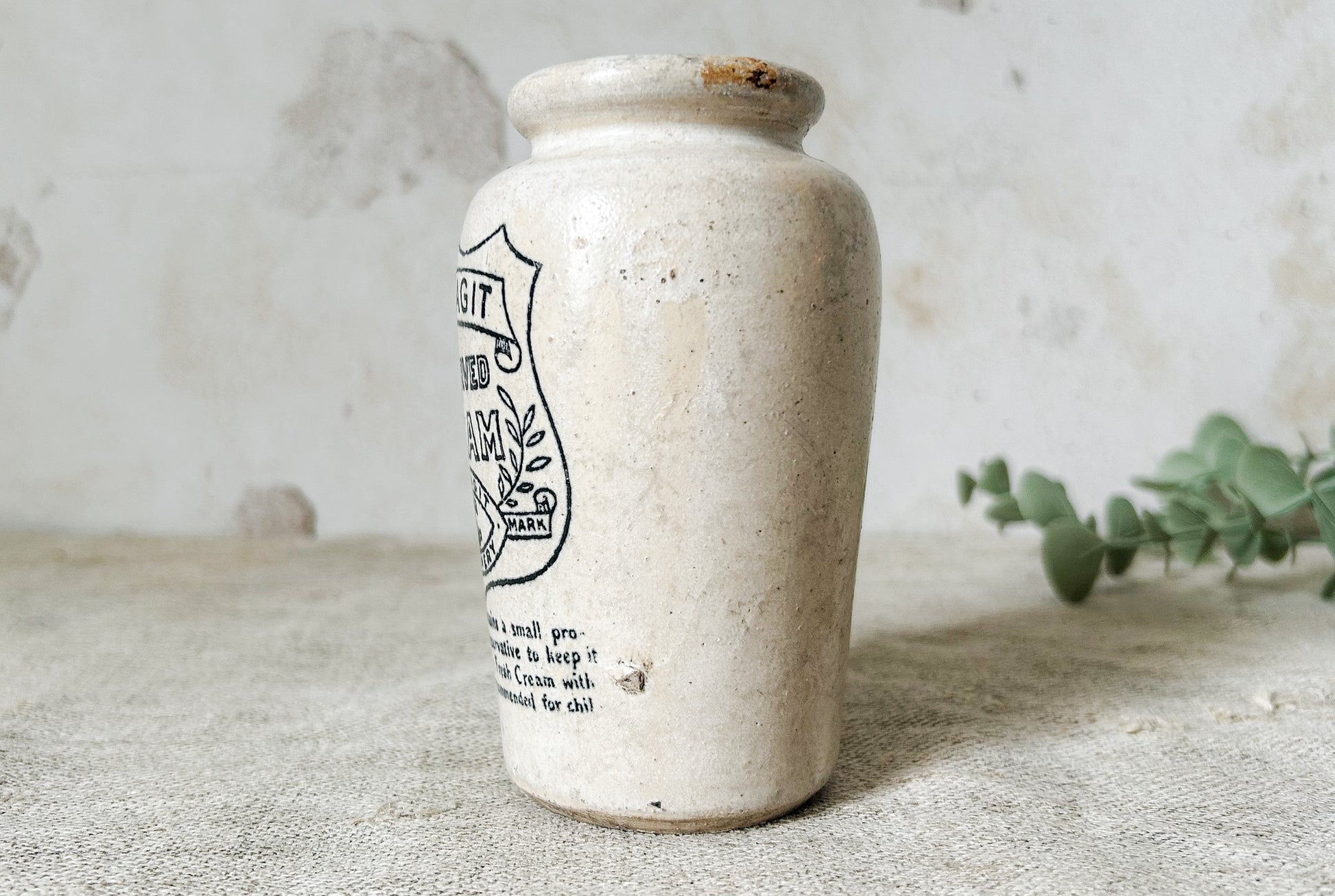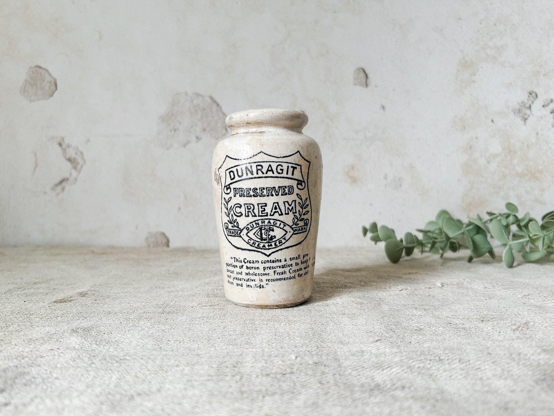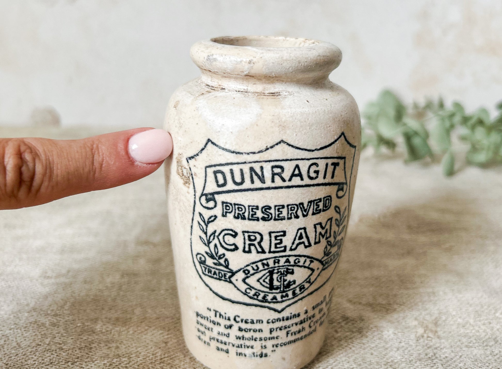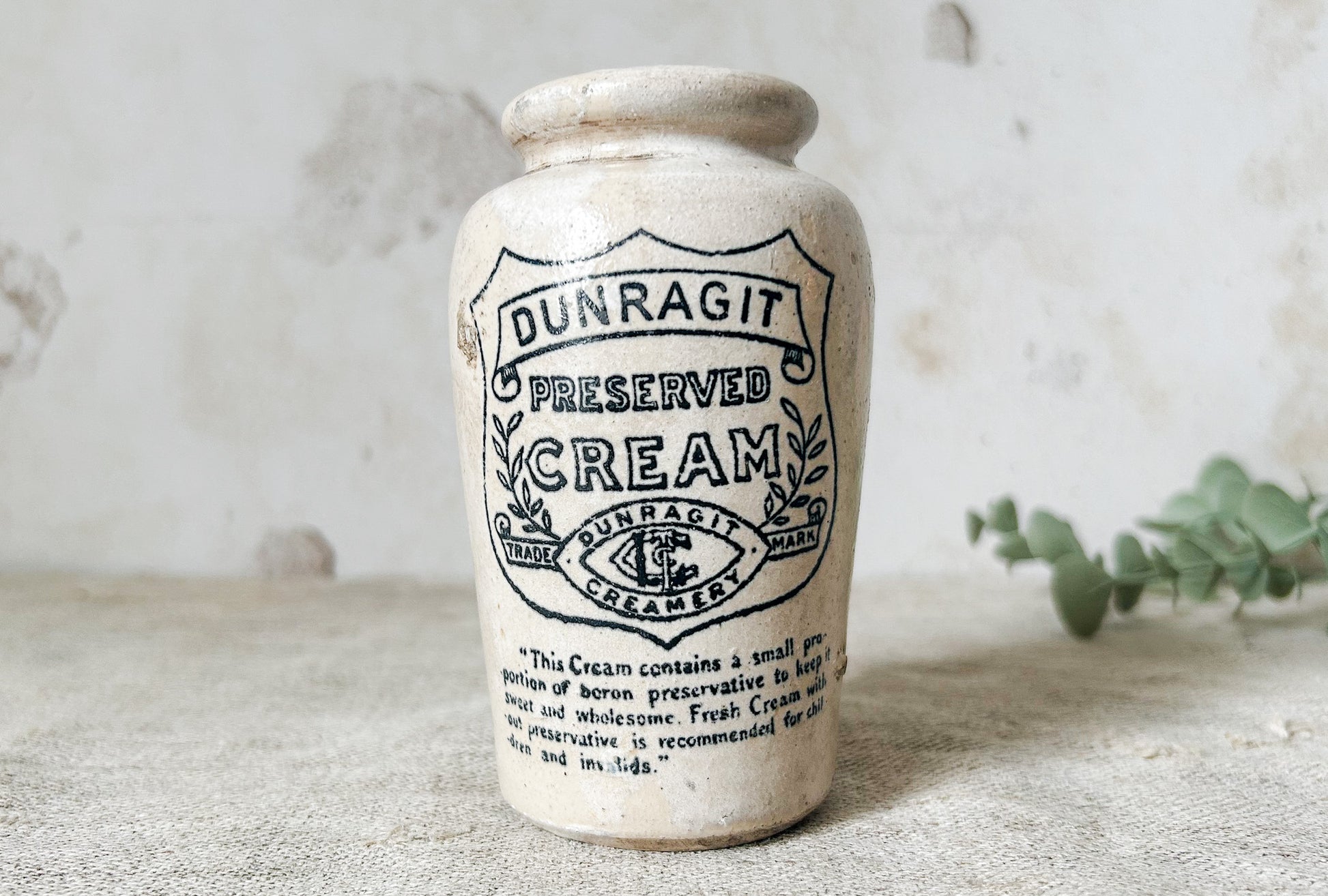 Available is an antique stoneware cream pot with strong black graphics. The pot reads "Dunragit Cream." with banner and medallion. The stoneware is soft off white cream with a rolled lip opening.