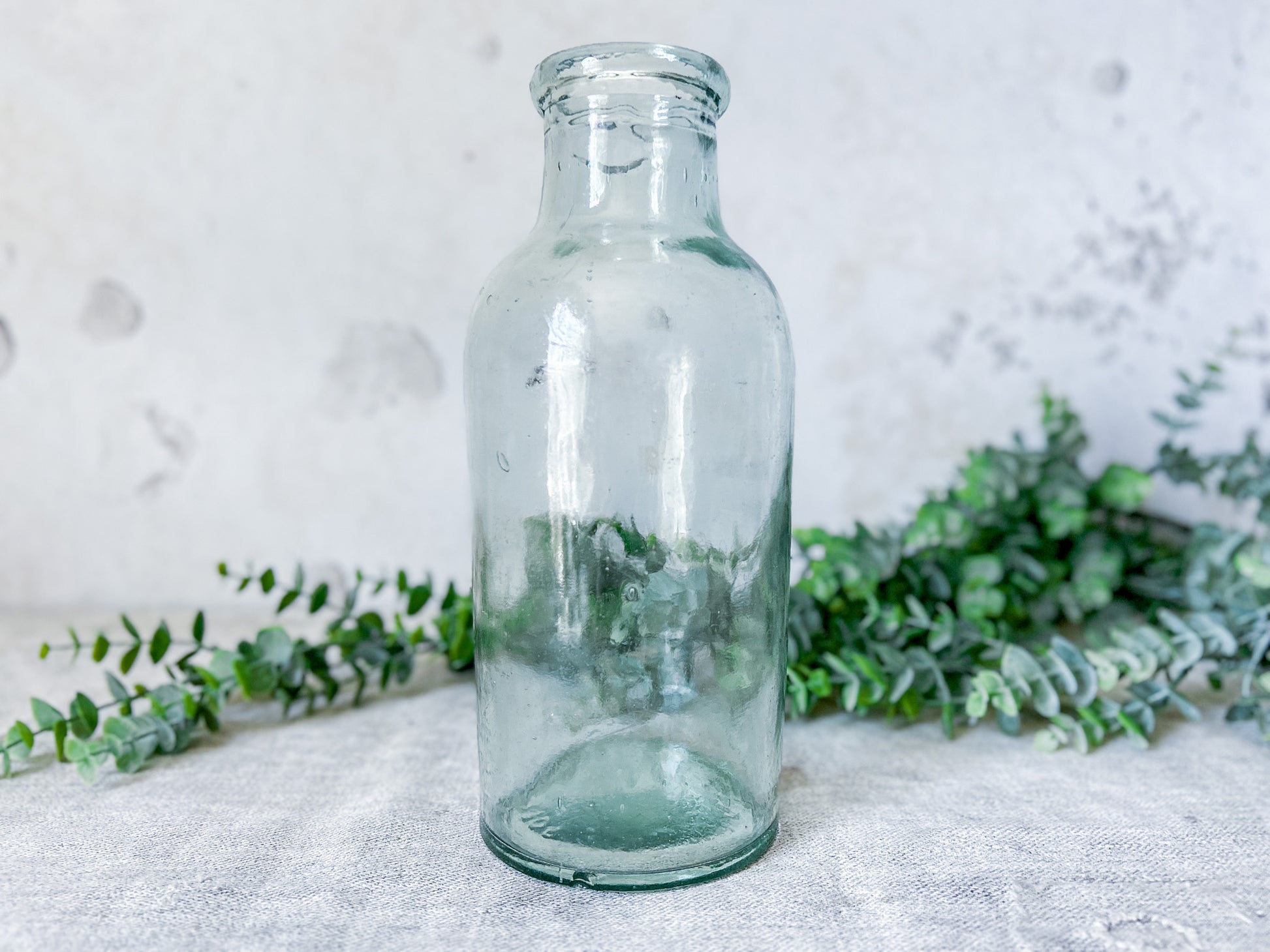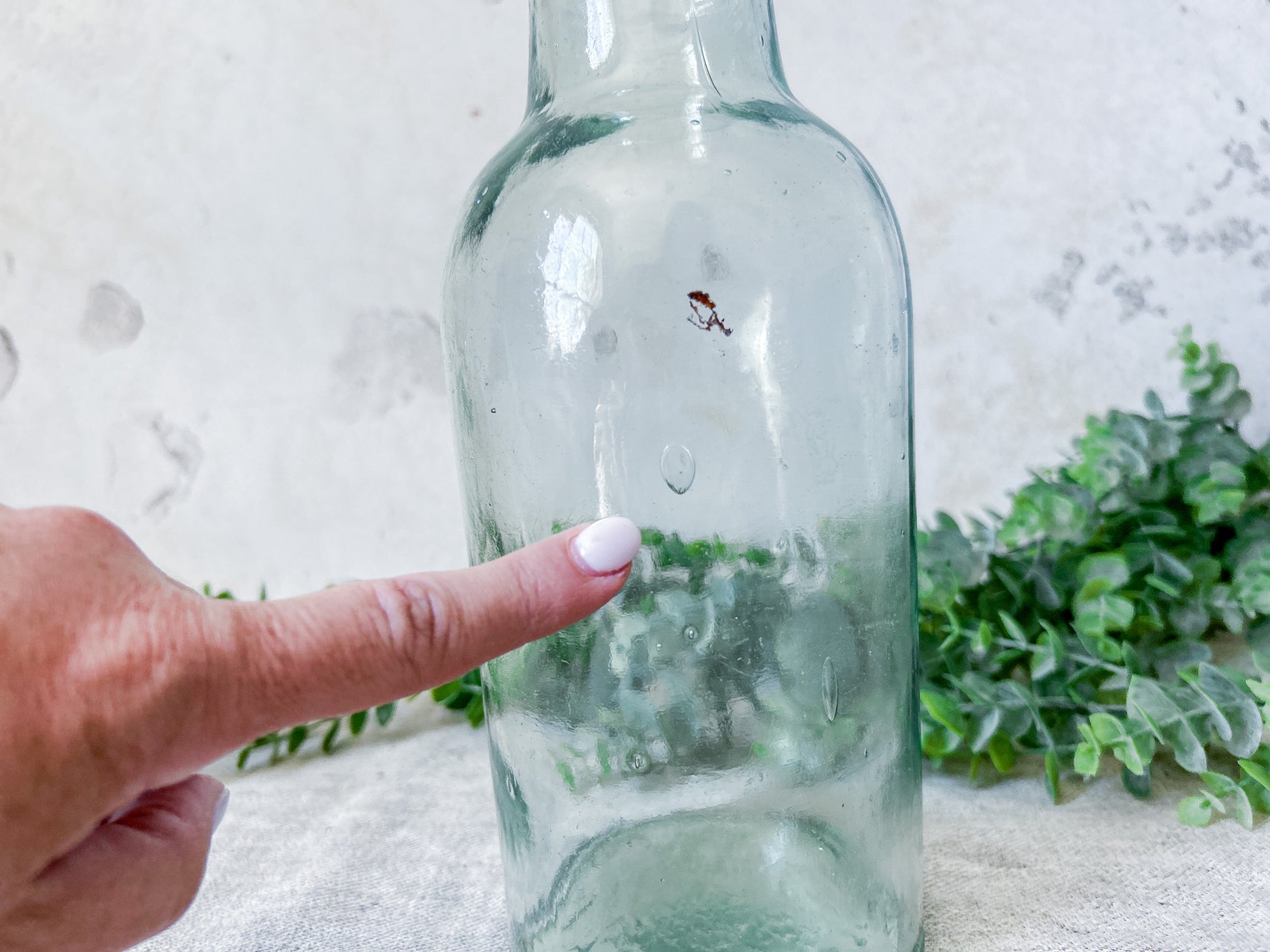 Available is an unusually shaped large jar from England. This aqua glass jar has a long neck with blob top opening. Soft light green color. Salvaged from a Victorian dump site in England.