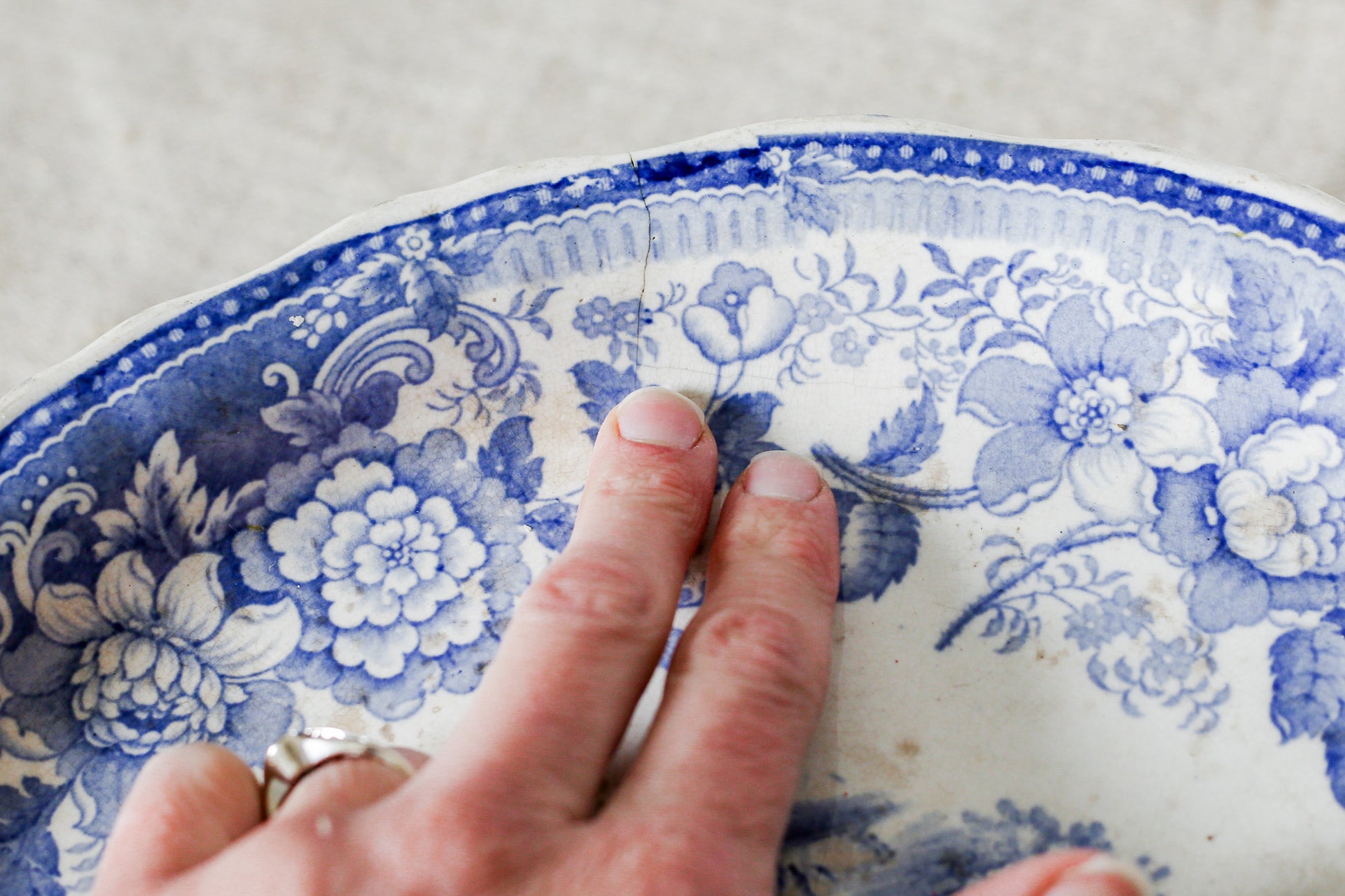 There is a stable old "L"-shaped hairline crack in one side; see photos.