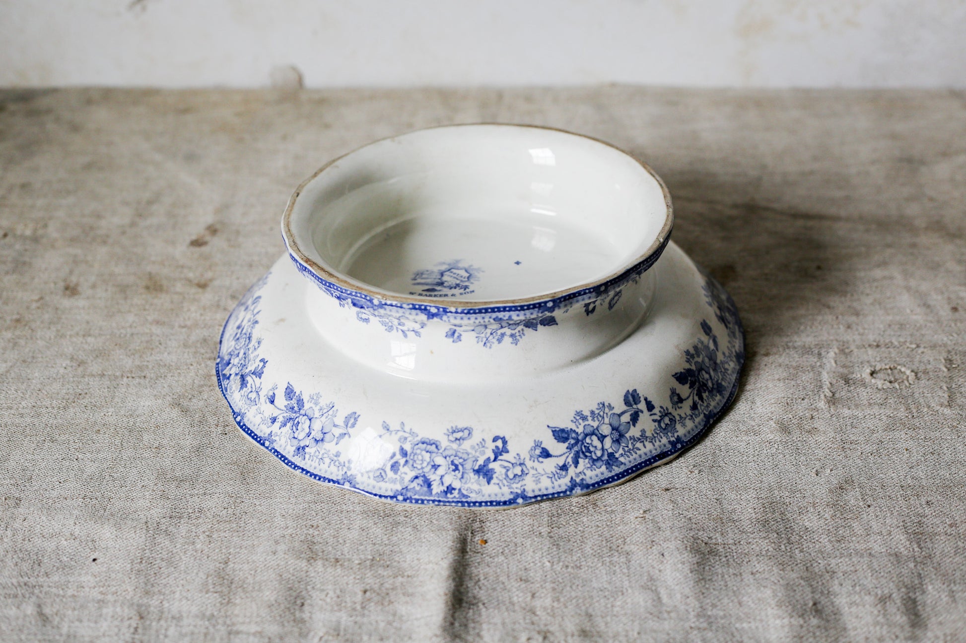Antique ironstone footed pedestal bowl with lovely chinoiserie scene and floral detail. The compote has curved raised edges and a flared short pedestal base. The scene shows a cottage scene with gardens and trees in light blue transfer.
