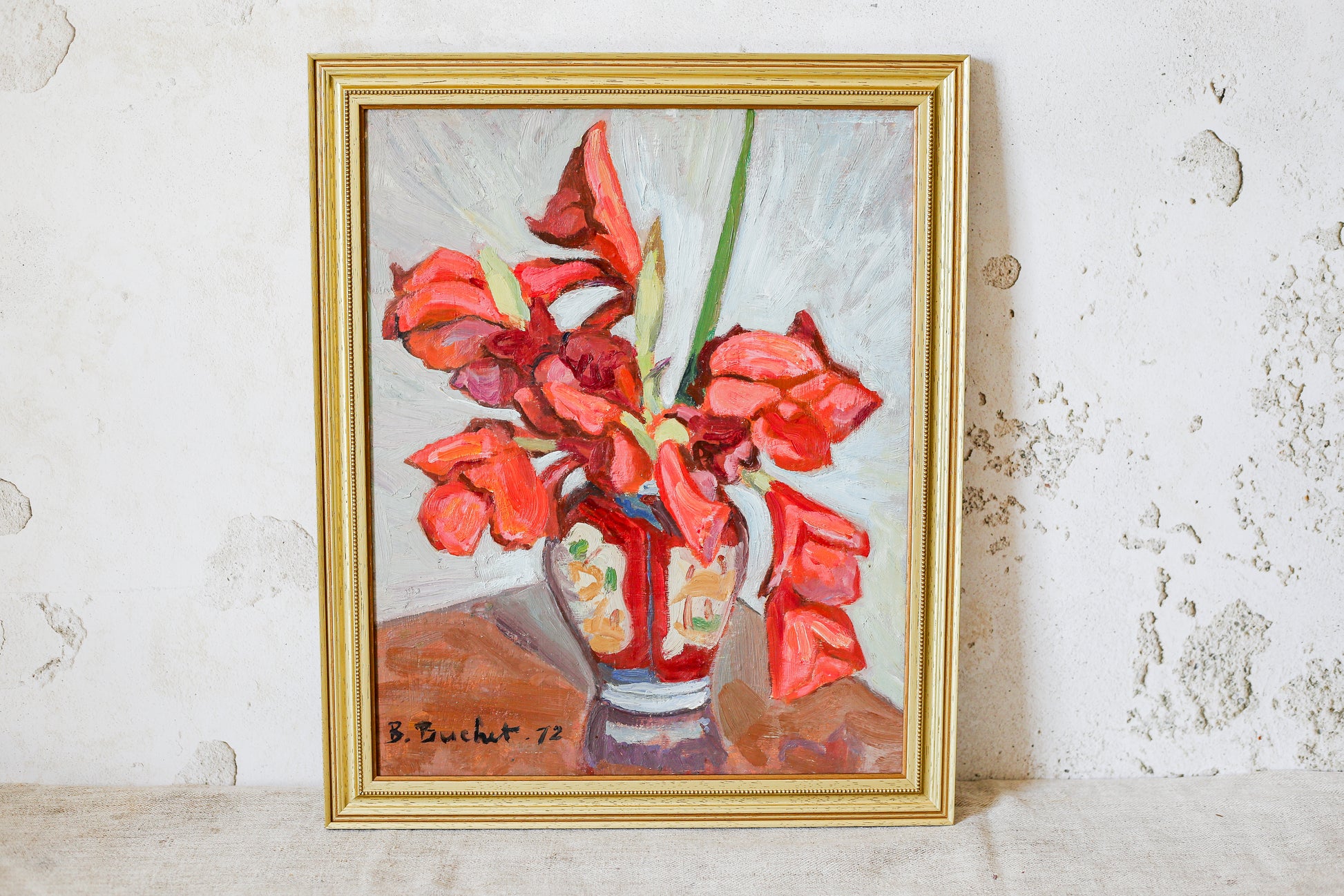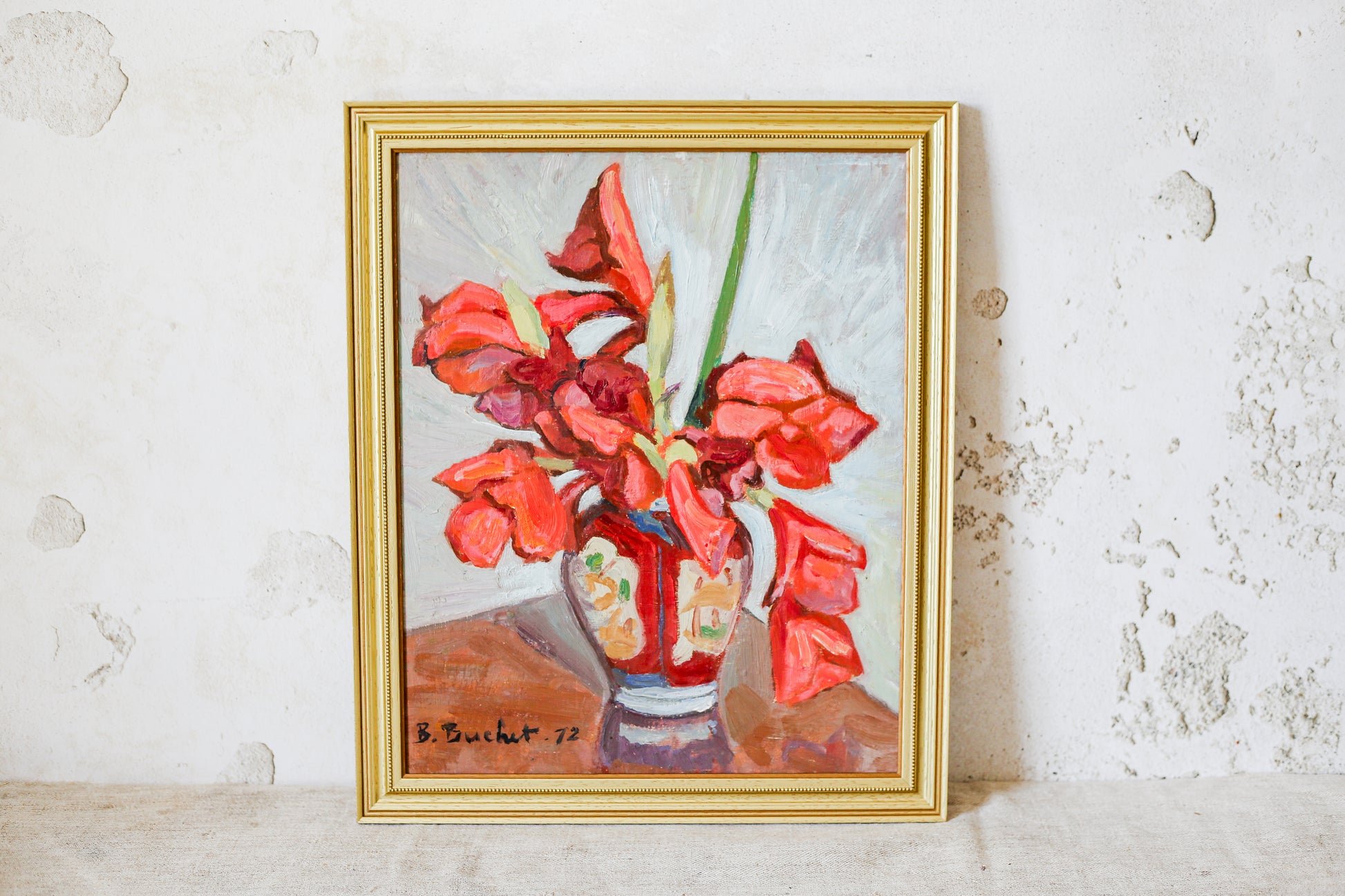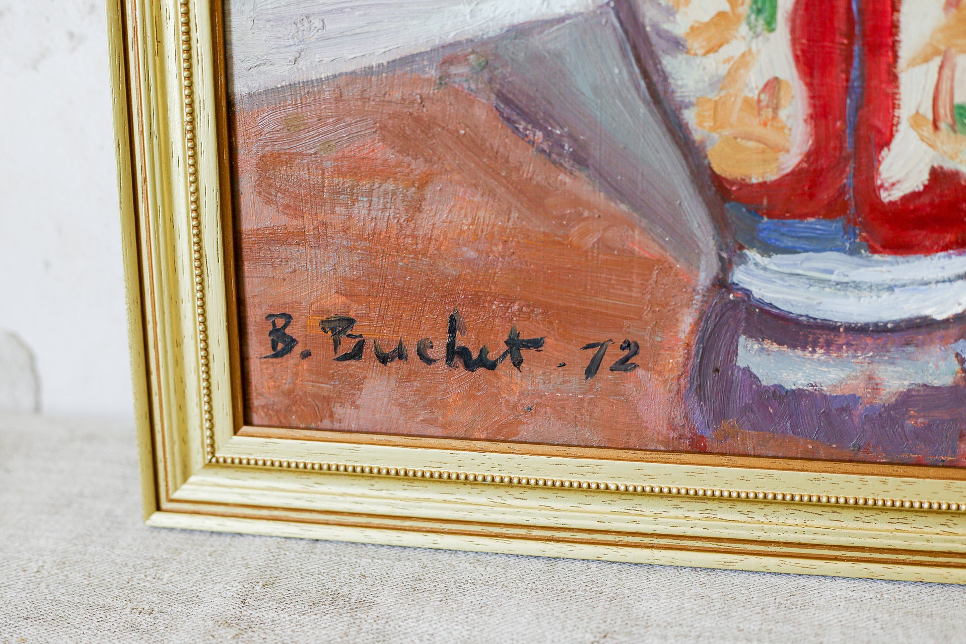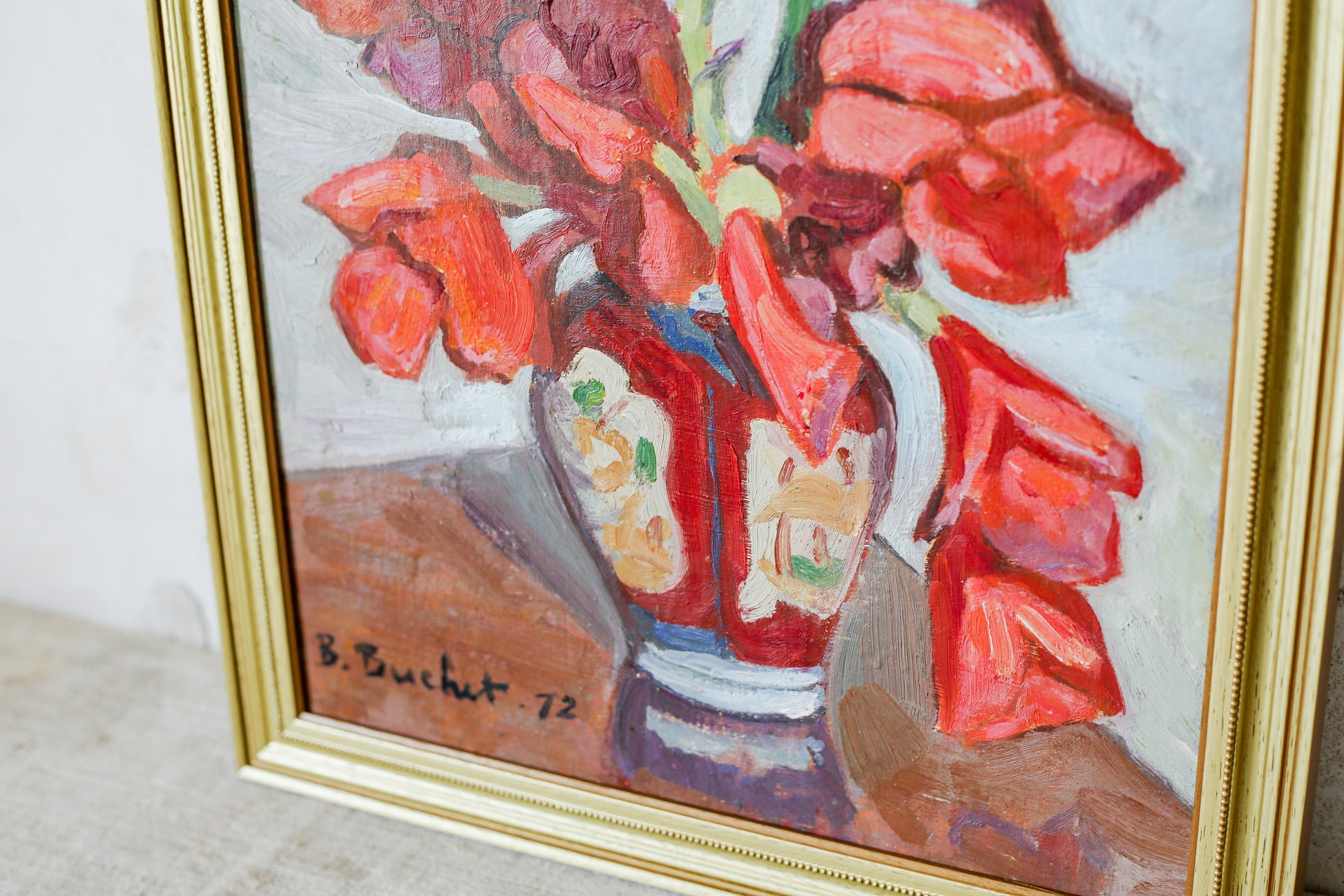 Available is an original oil painting of a striking floral still life. It is signed "B. Buchet '79" and was originally sourced in Paris.