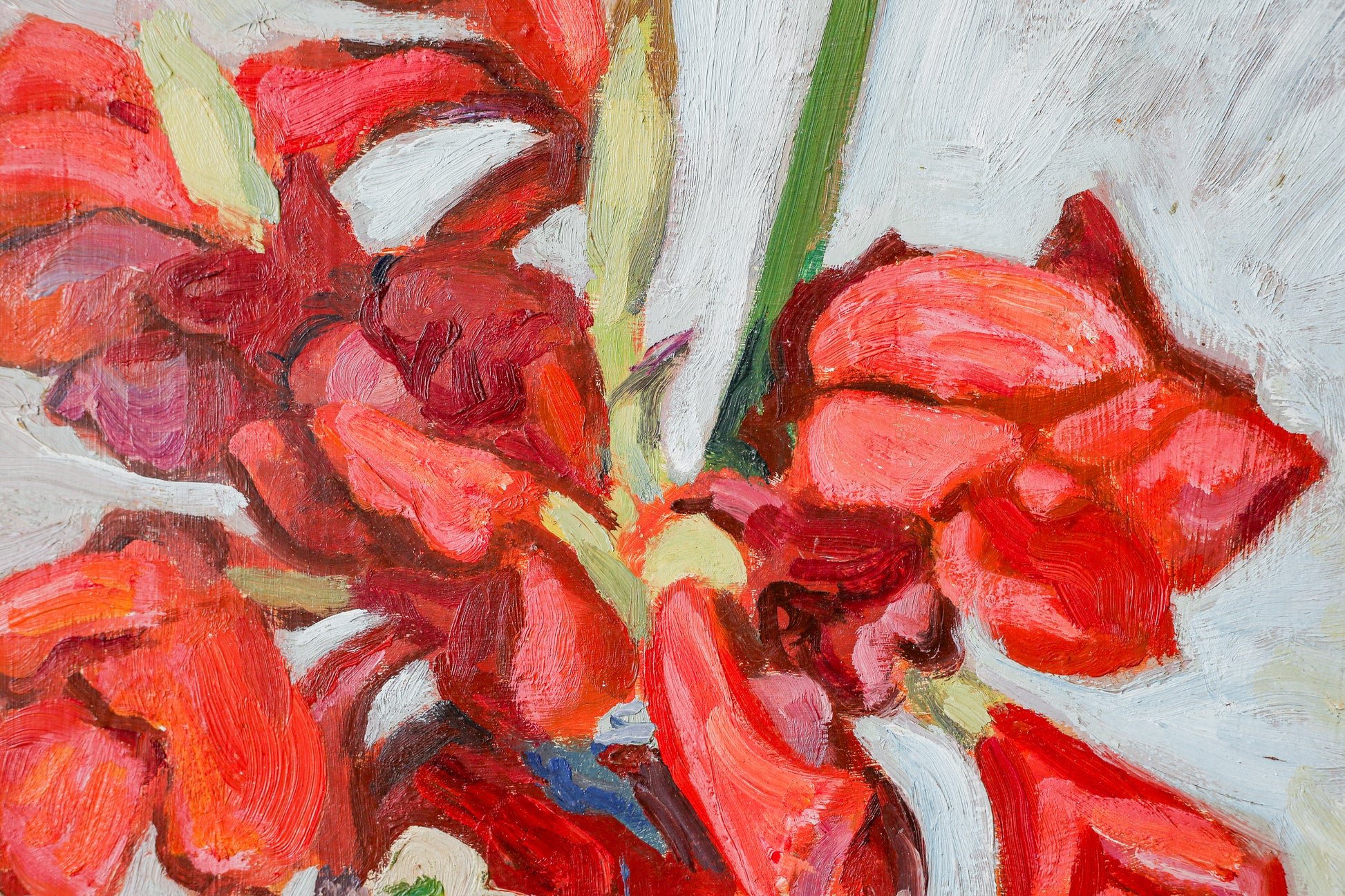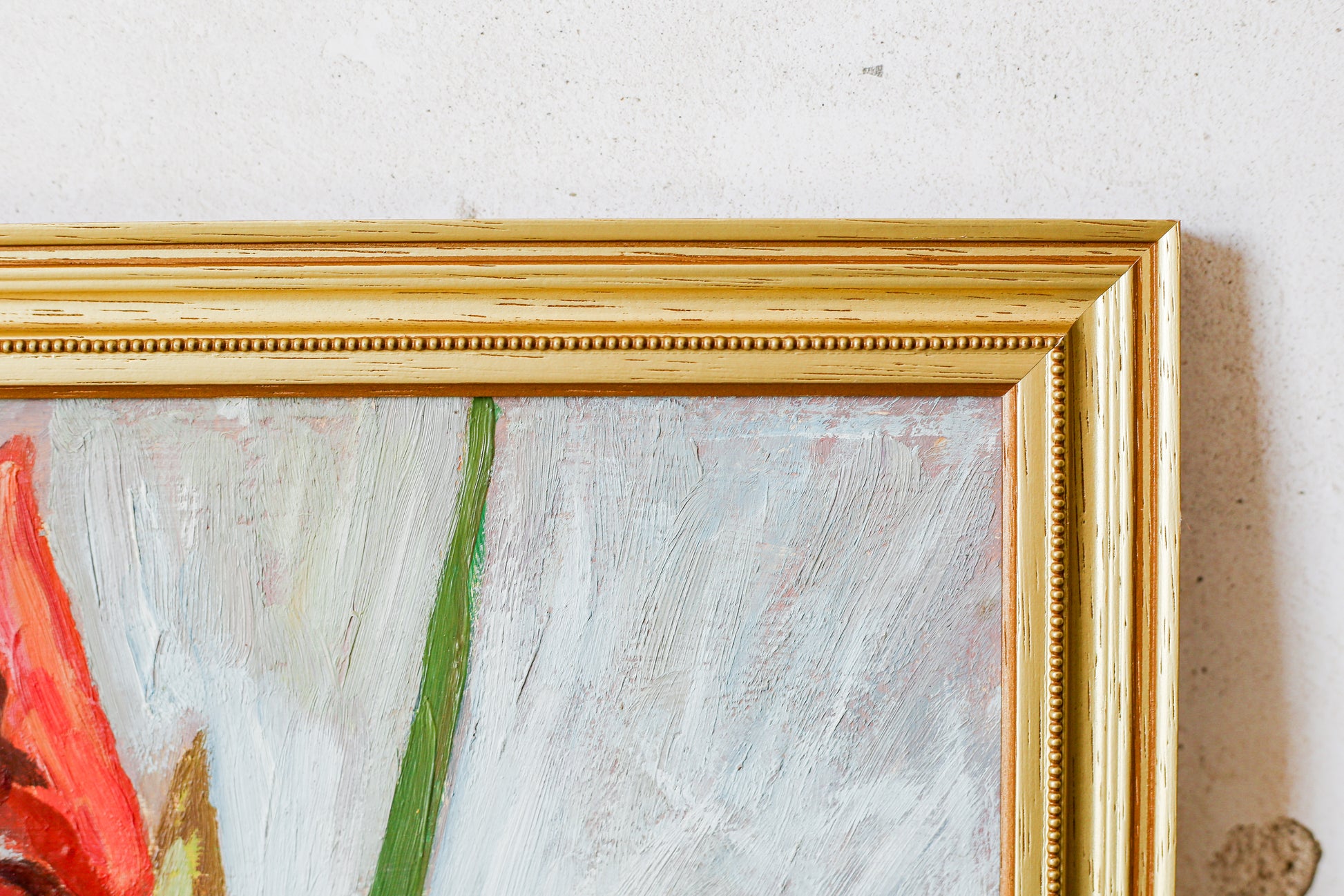 This vibrant still life portrays an arrangement of red flowers in a chinoiserie vase, set on a table against a pale blue background. Lovely impasto strokes and deft use of texture brings the scene to life. Painted on board. Signed in bottom left corner. Frame is gilt wood and new, with hanging wire in place.