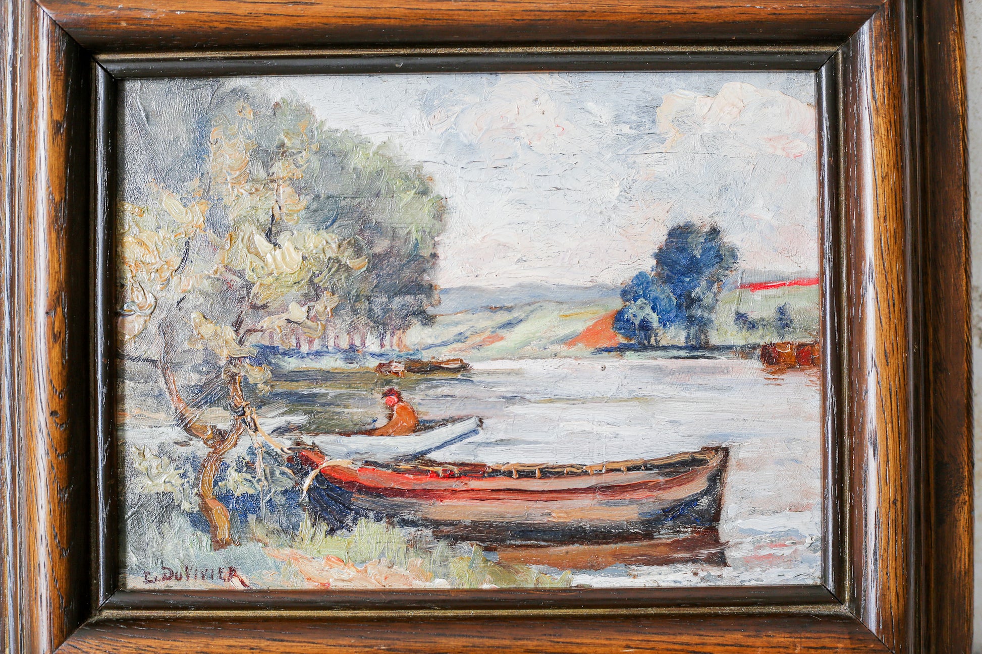 Framed original oil painting in rich colors and impasto technique shows a boater on a lake, surrounded by lush trees and greenery. Style is strongly reminiscent of early 20th century French art. Signed "DuVivier" in bottom left corner. Framed in molded oak frame, with new hanging wire attached.