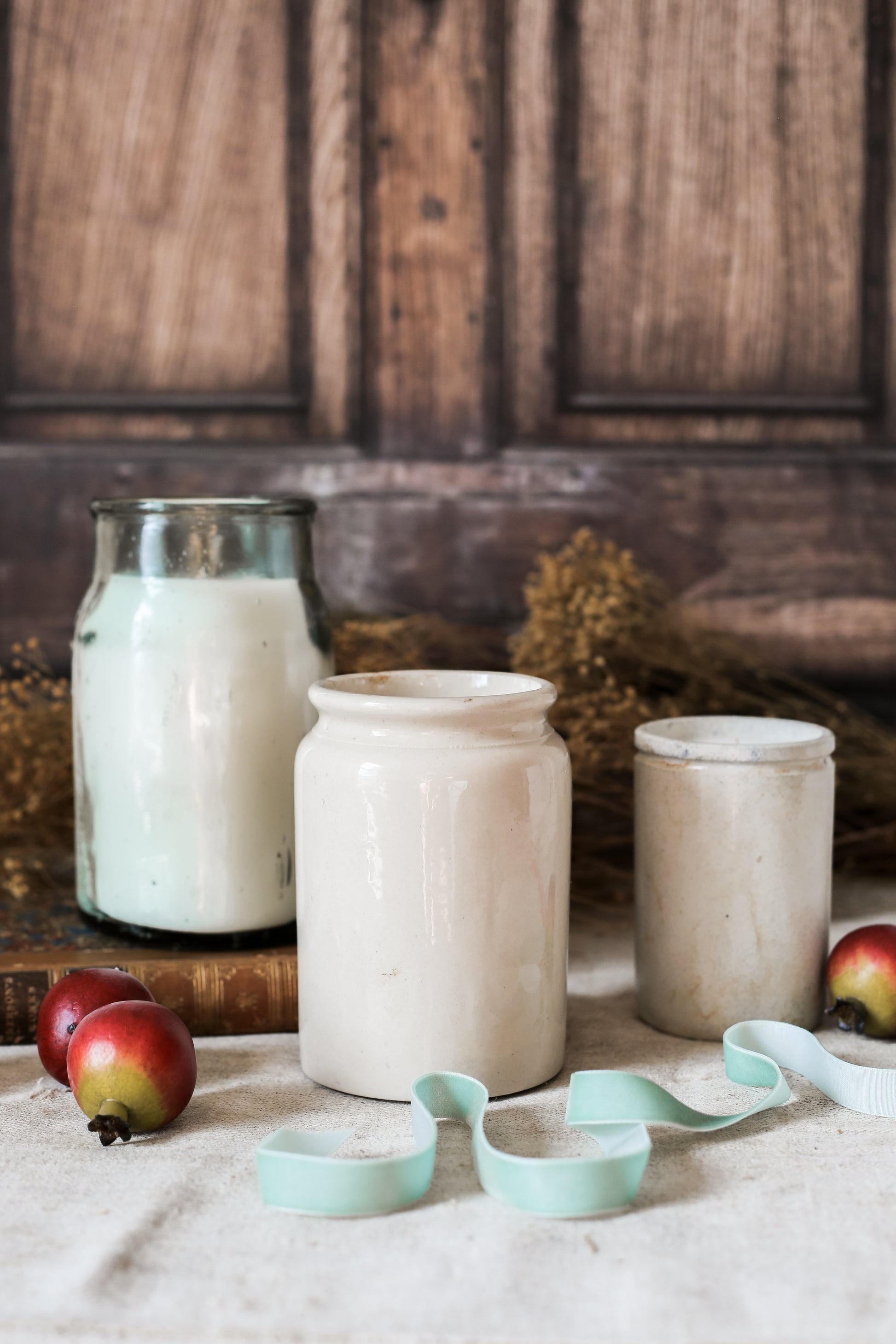 Each antique jar is sourced from England, salvaged from Victorian dump sites and carefully restored for modern use. We use a variety of stoneware and glass jars, originally used for preserving food. The warm neutral tones and natural textures bring an elevated farmhouse look.