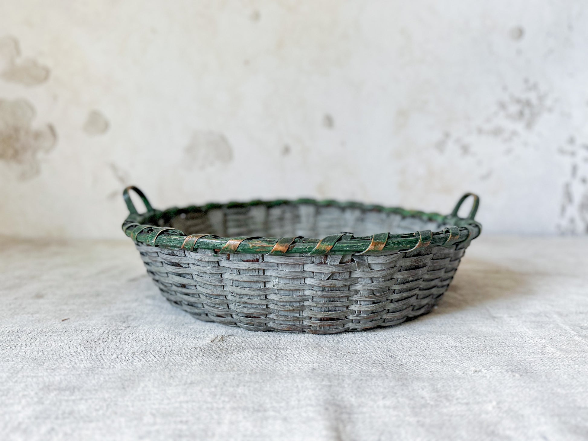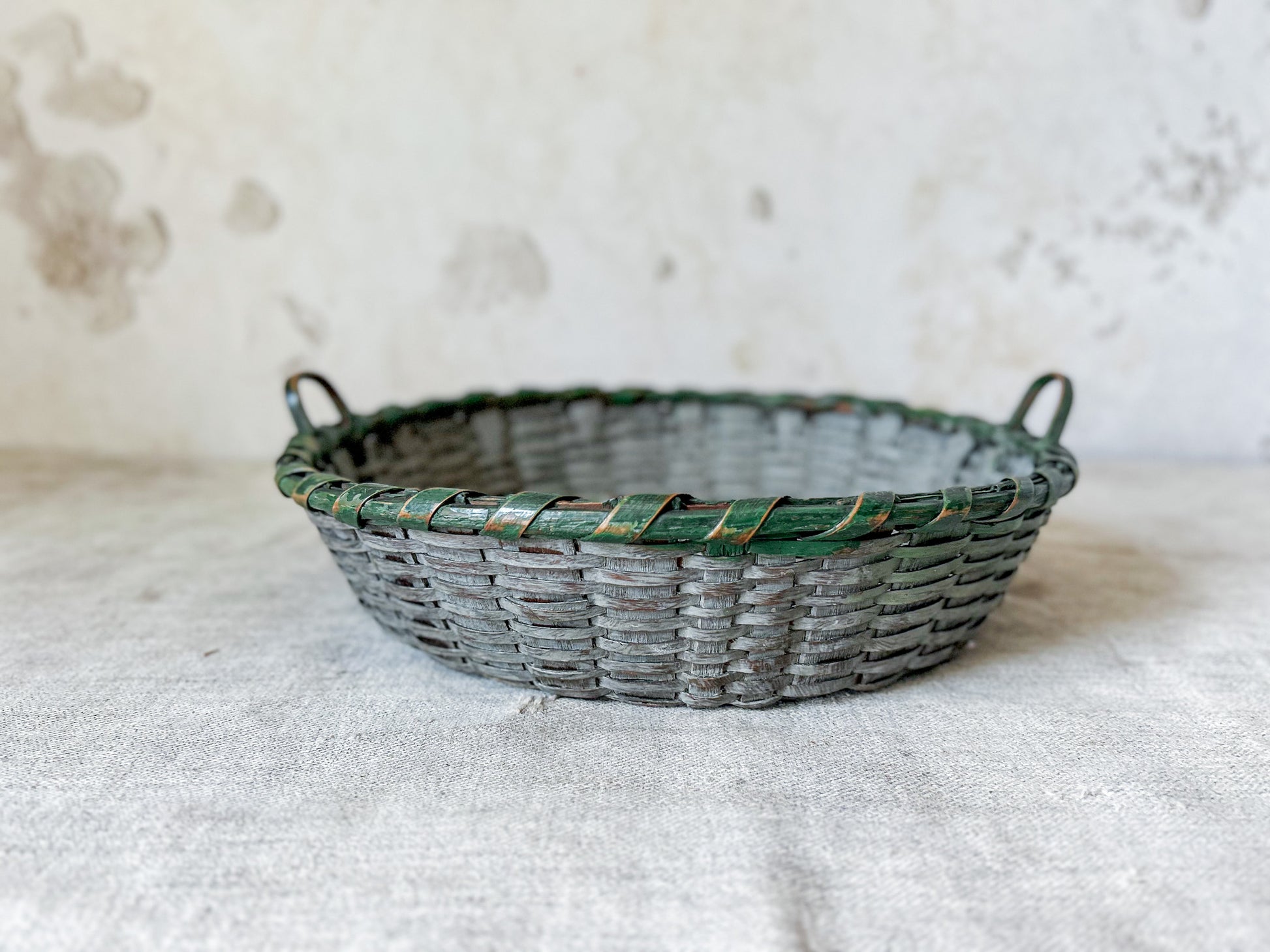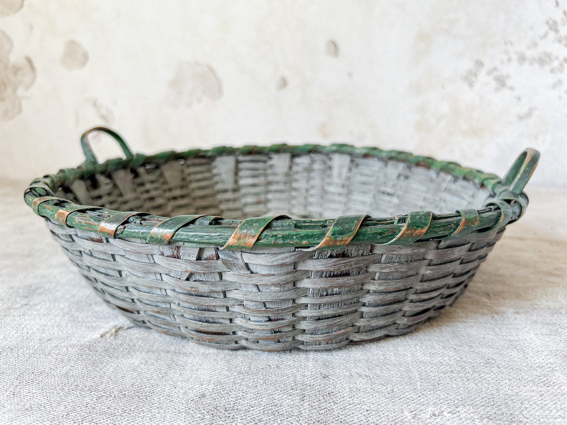 Available is a vintage split wood woven basket with handles. Attractive original paint in grey and green. Two handles make this a functional piece as well - the perfect size for displaying fruit, florals, or small collections.