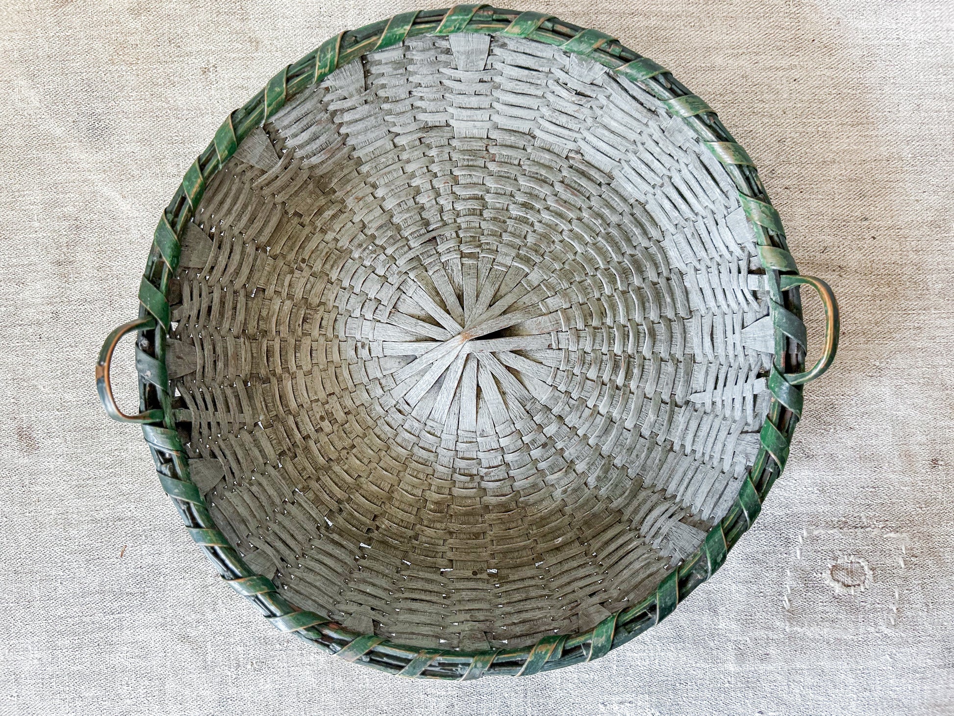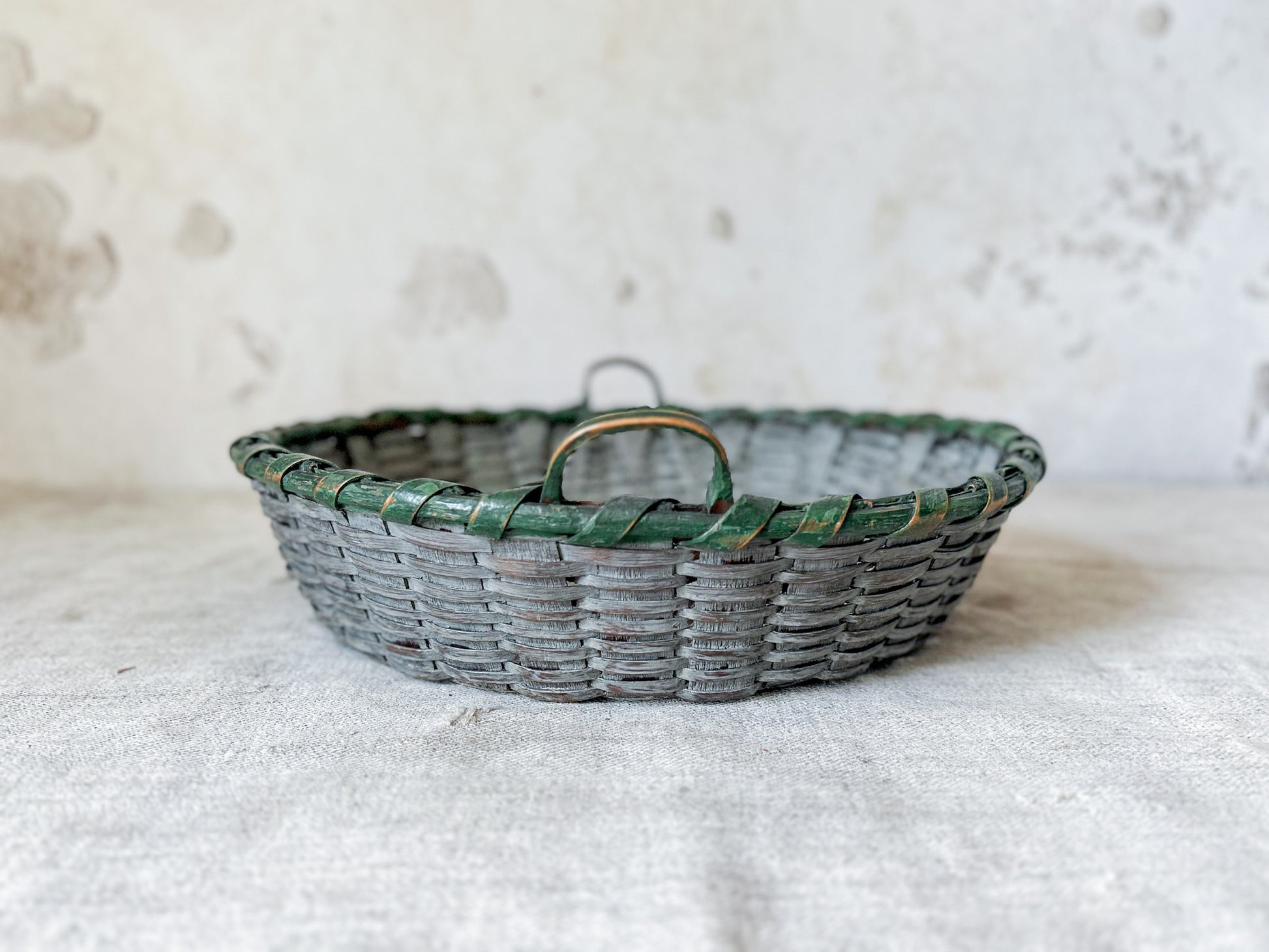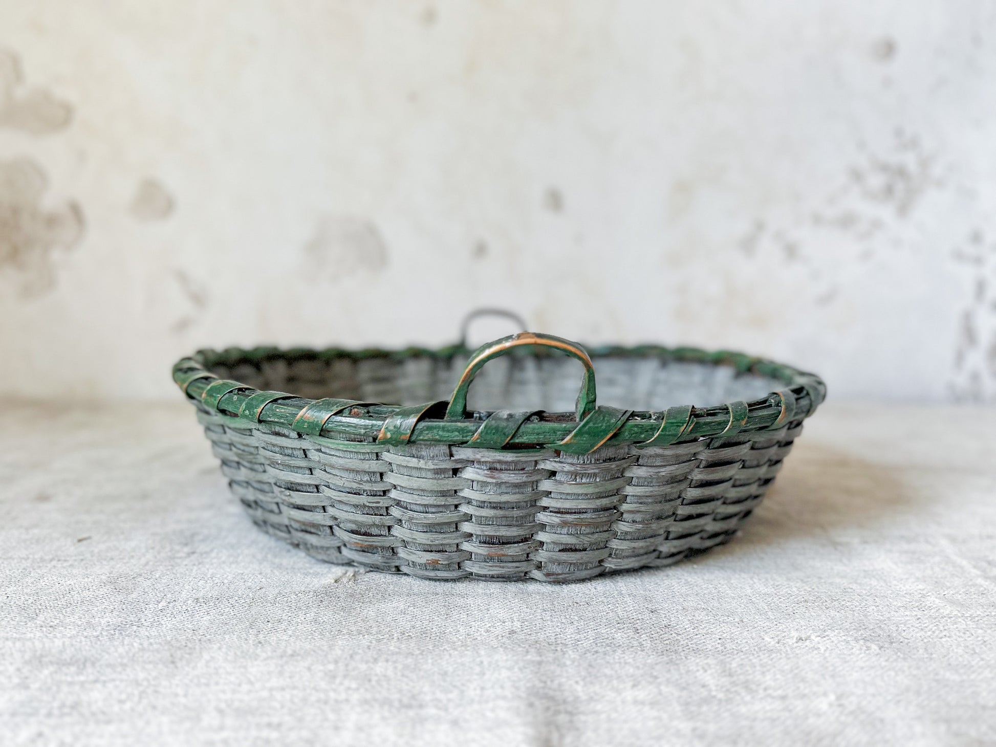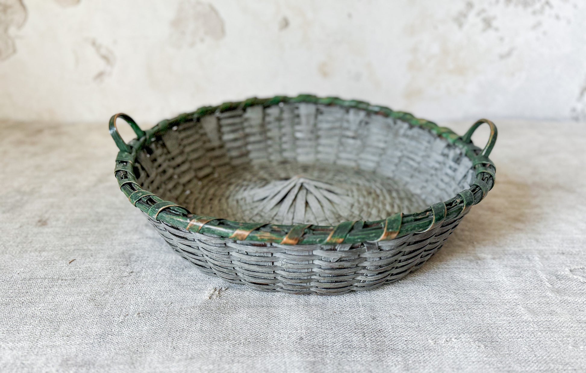 Available is a vintage split wood woven basket with handles. Attractive original paint in grey and green. Two handles make this a functional piece as well - the perfect size for displaying fruit, florals, or small collections.