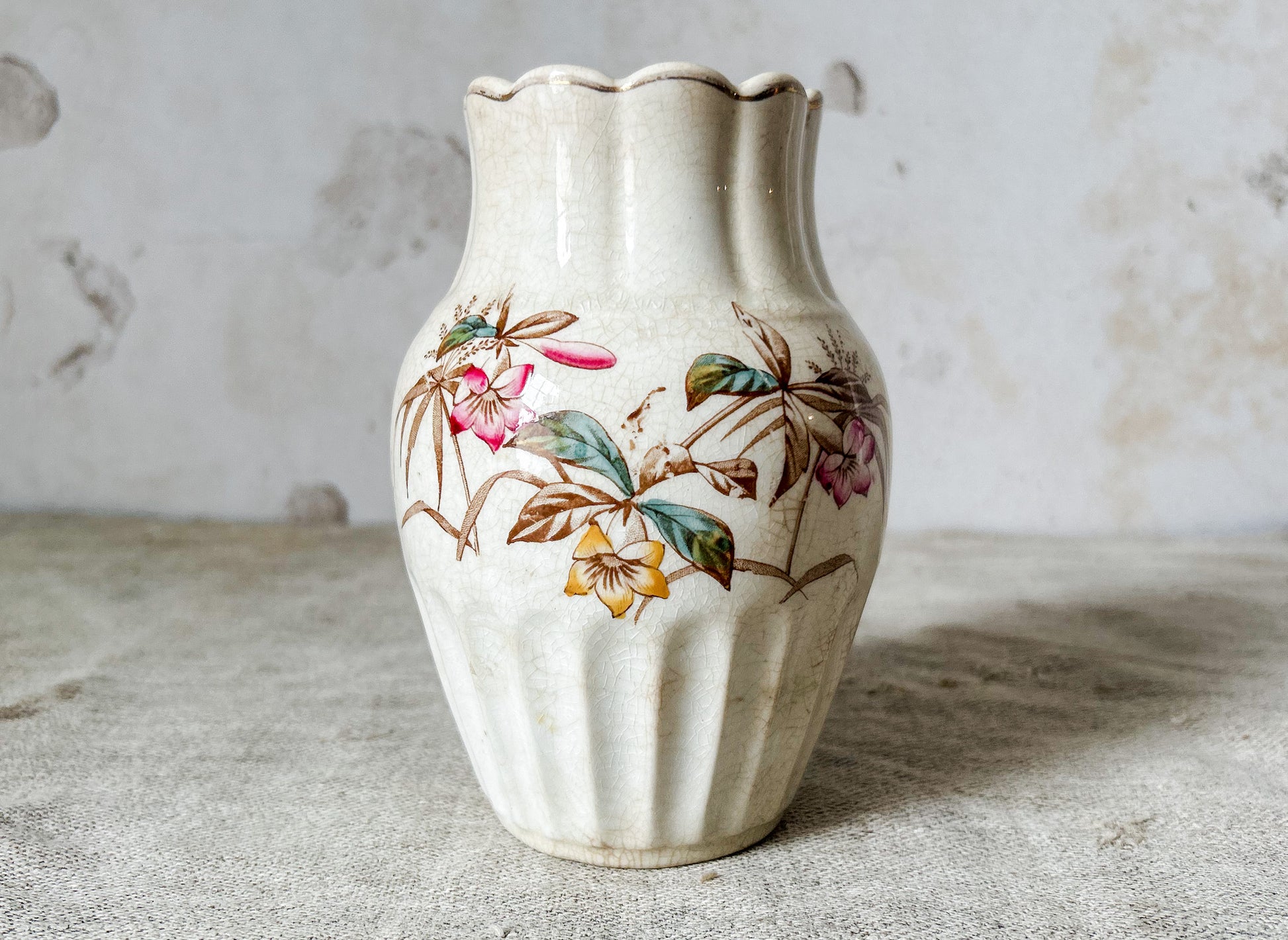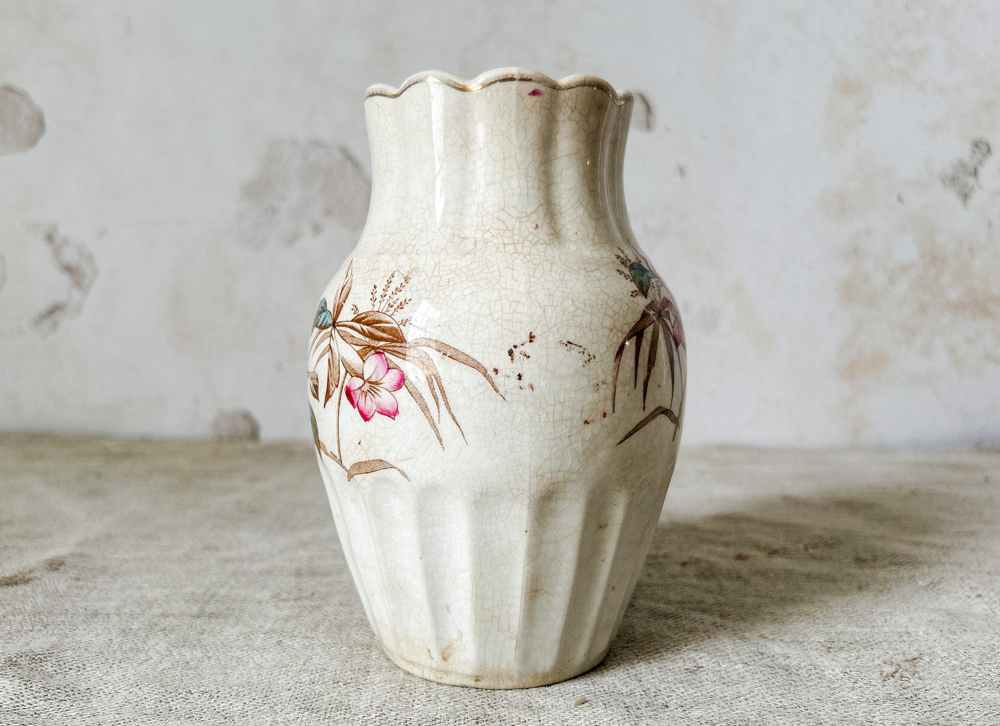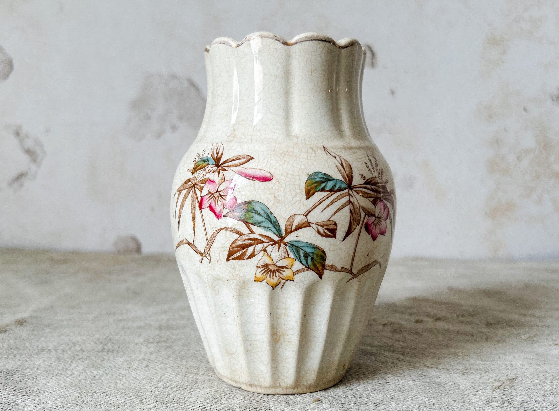 Available is an antique ironstone vase with attractive hand painted details and patina. The floral brown transfer design is hand painted with blue-green and magenta. The scalloped top has some remaining original gilt, and there is staining and crazing throughout.