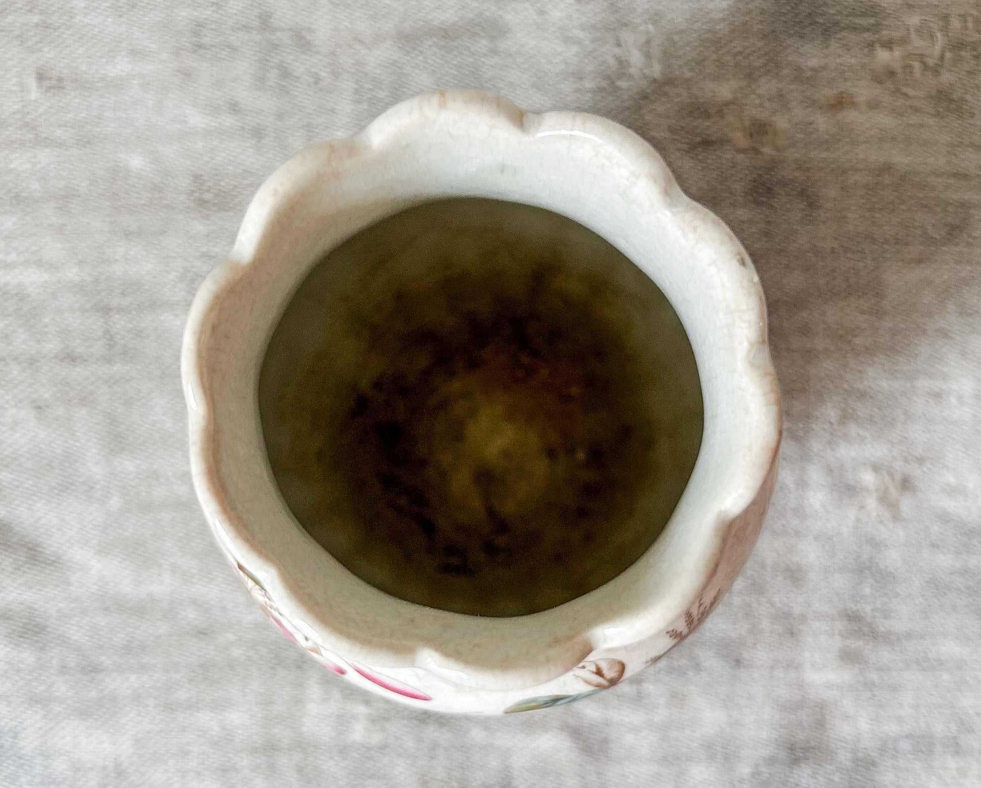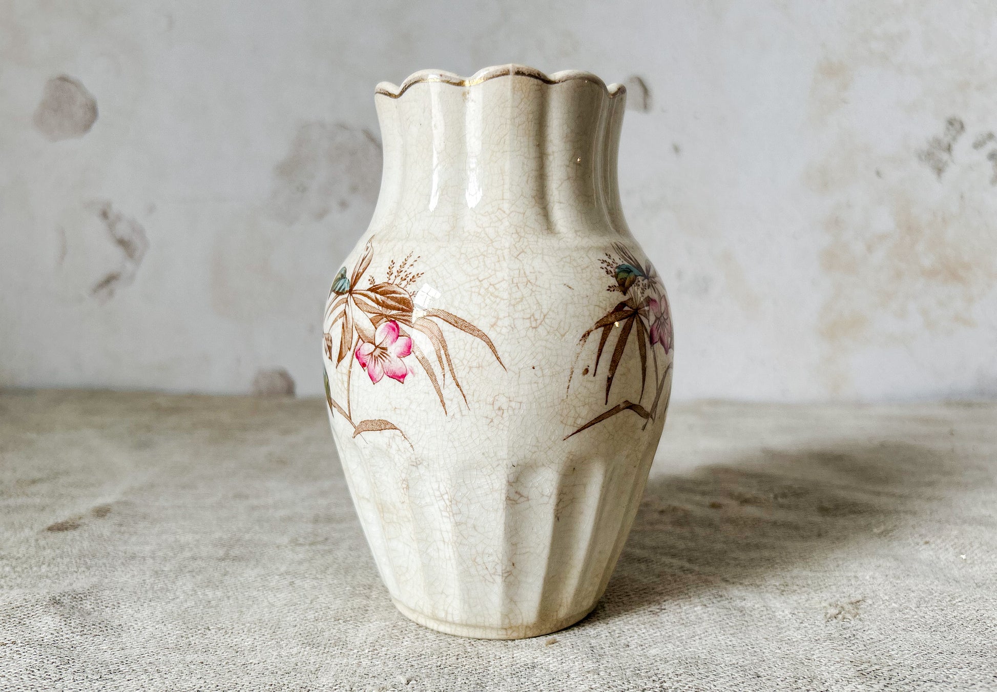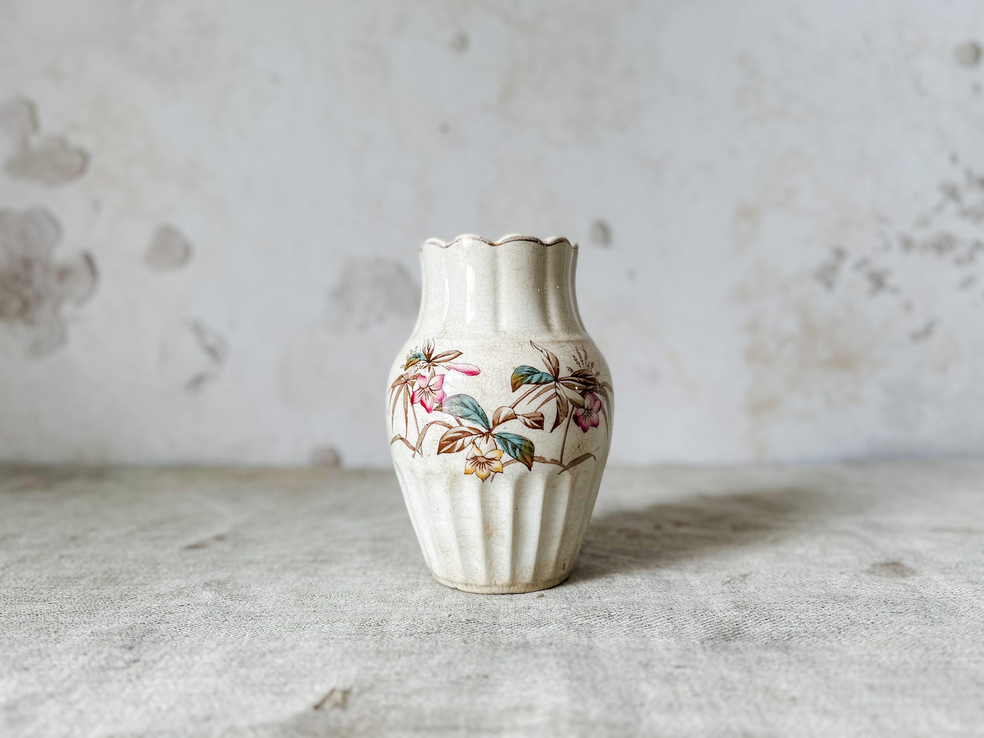 Available is an antique ironstone vase with attractive hand painted details and patina. The floral brown transfer design is hand painted with blue-green and magenta. The scalloped top has some remaining original gilt, and there is staining and crazing throughout.