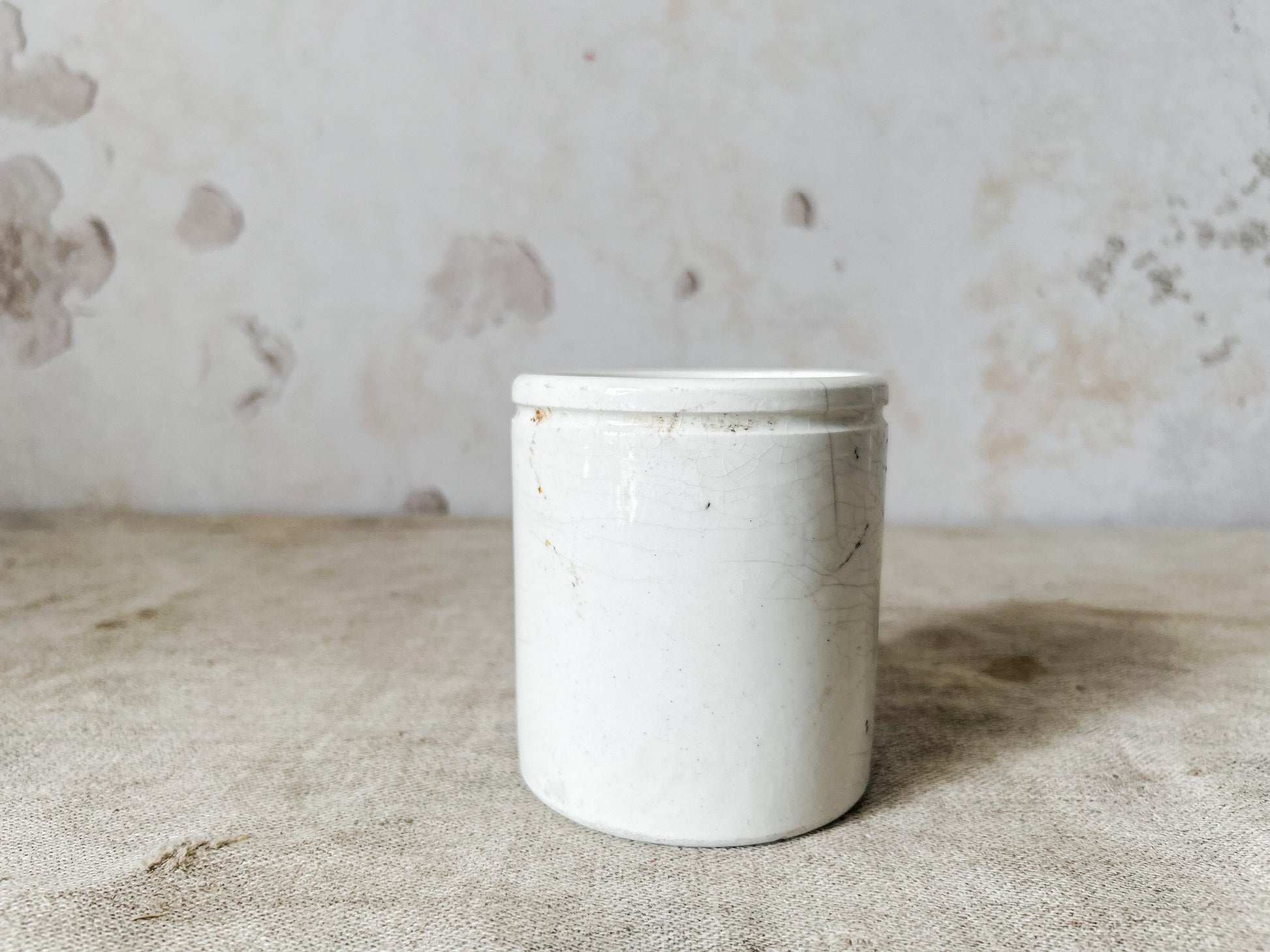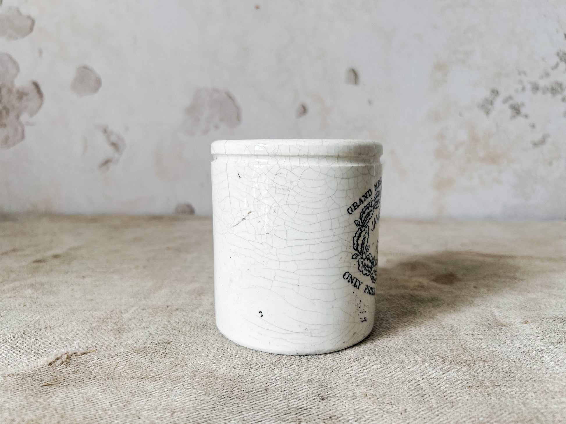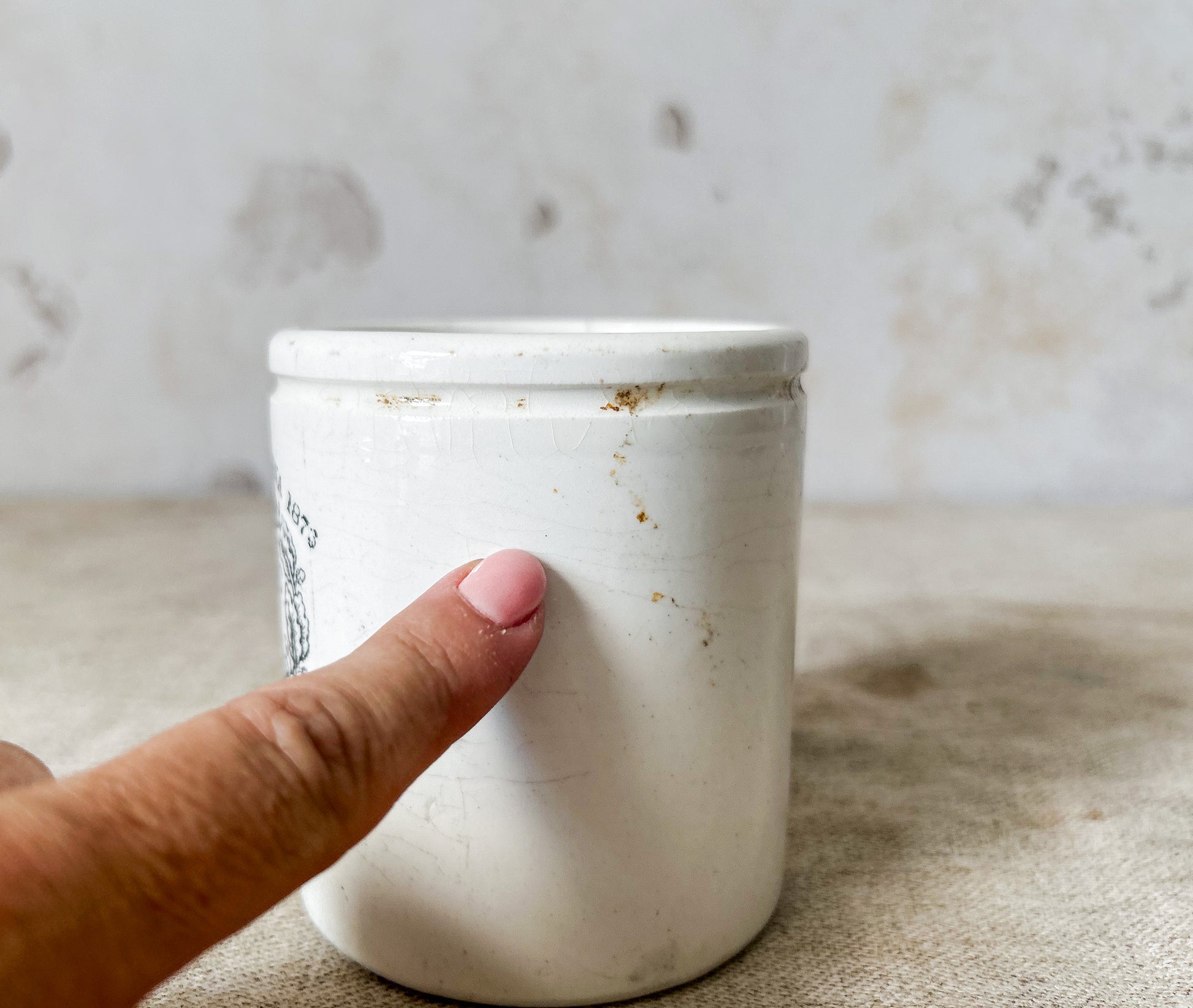 Available is an antique marmalade pot produced by James Keiller & Sons. The laurel wreath design and monograms date this piece to between 1874-1898. The size is the more unusual short "chubby" 1 lb. size.